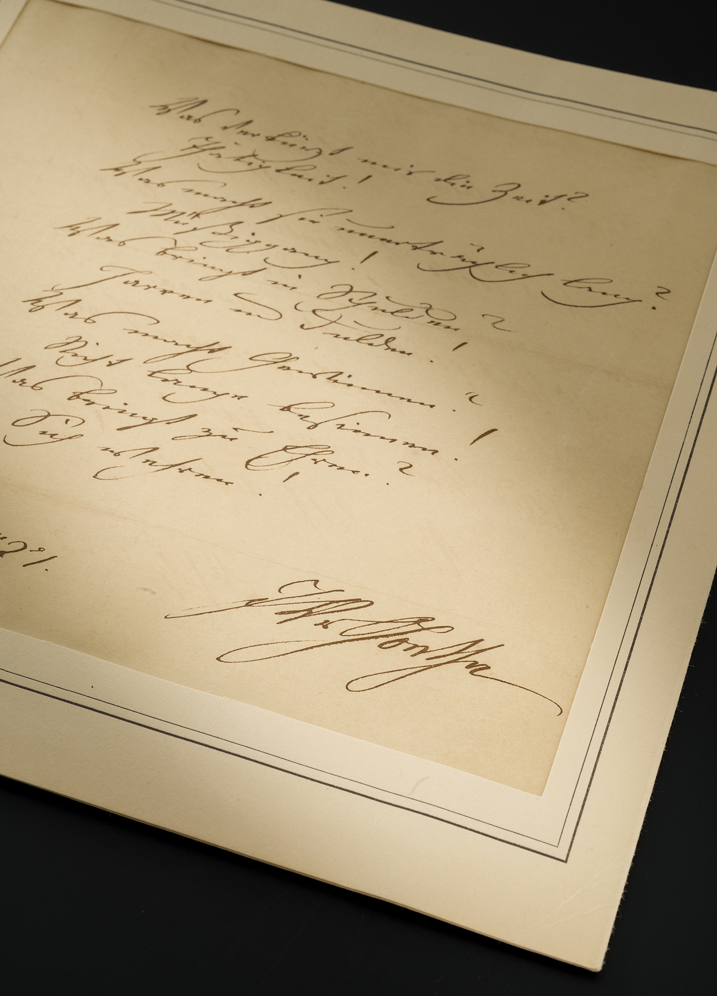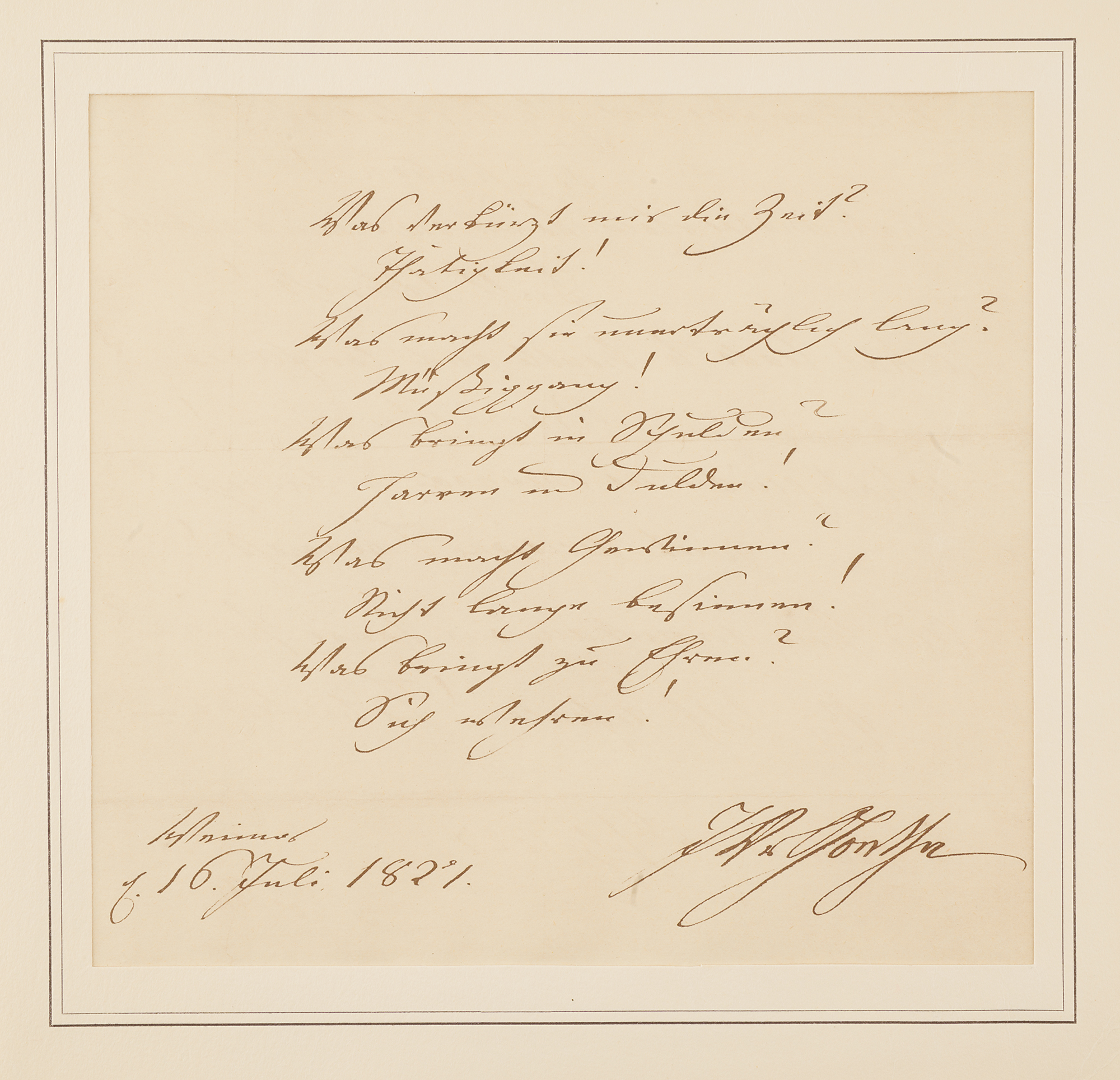 Autograph poem in German, signed "J. W. v. Goethe," one page, 7 x 6.5, July 16, 1821. Goethe pens his poem 'Fünf andere [Five Others],' from his seminal 1819 collection of poetry, West–östlicher Divan [West–Eastern Diwan]. In full (translated): "What makes time short to me? / Activity! / What makes it long and spiritless? / 'Tis idleness! / What brings us to debt? / To delay and forget! / What makes us succeed? / Decision with speed / How to fame to ascend? / Oneself to defend!" Housed in an 8.75 x 8.5 presentation folder. In fine condition. Accompanied by a mailing envelope from German antiquarian bookseller and art dealer Paul Graupe, sending the poem to a friend at Klinik La Moubra in Switzerland, plus a brief handwritten note.