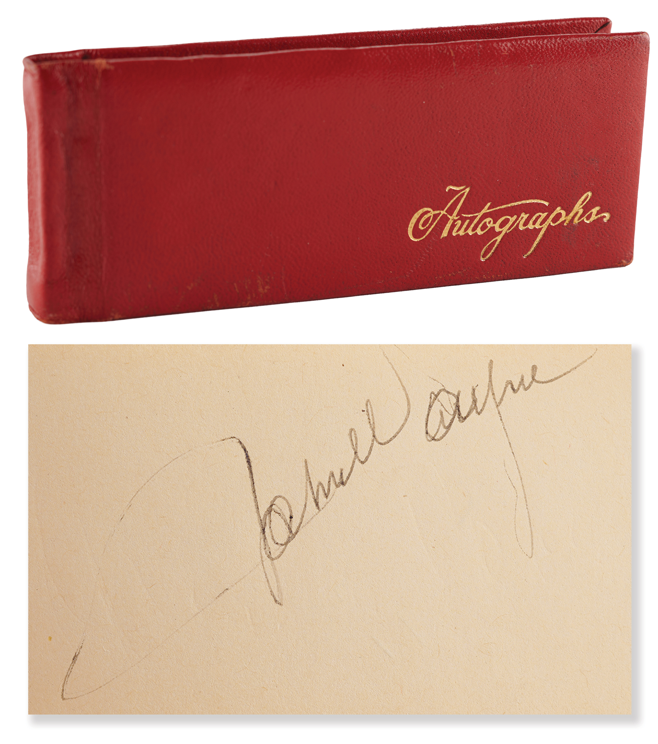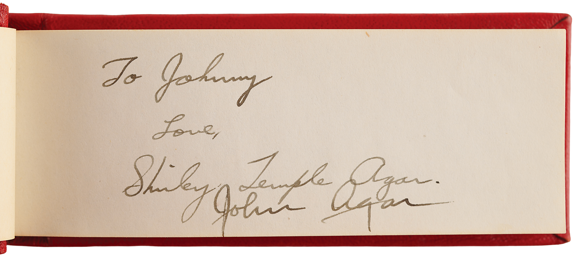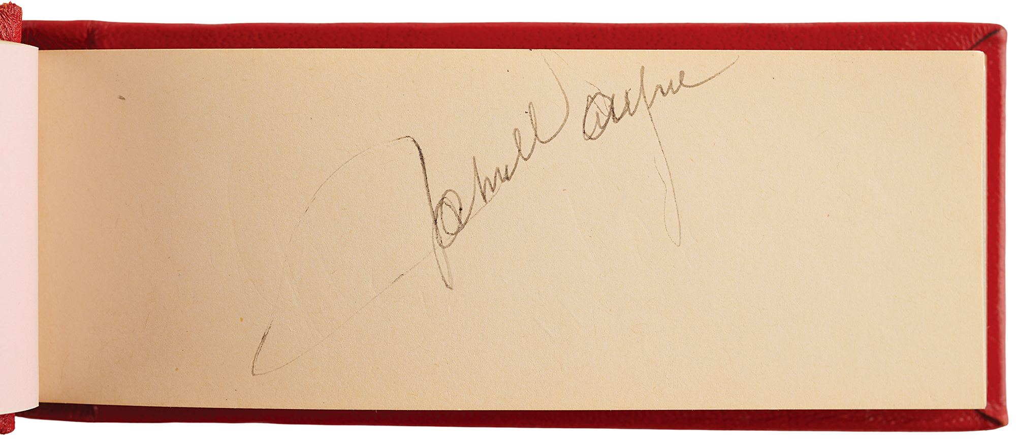 Vintage circa late 1940s hardcover autograph album, 6 x 2.5, signed inside in fountain pen by 25 entertainers, many with inscriptions to "Johnny." Includes: John Wayne, Chico Marx, Gregory Peck, Hoagy Carmichael, Jack Benny, Paul Winchell, Eddie Peabody, Martha Raye, Shirley Temple, John Agar, Dorothy Lamour, Peggy Mann, Robert Armstrong, Forrest Tucker, Harry Carey, Jr., Pat O'Brien, Rudy Vallée, Bob Hope, and a few others. In fine condition.