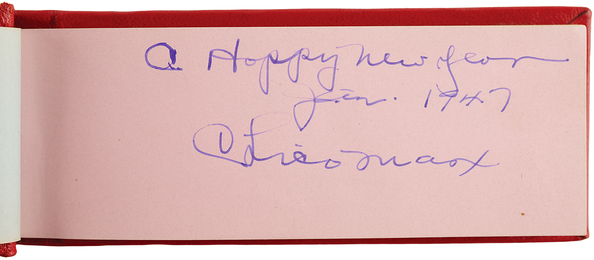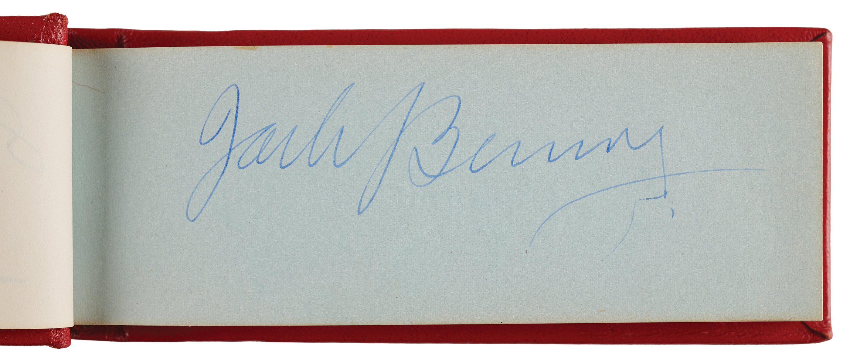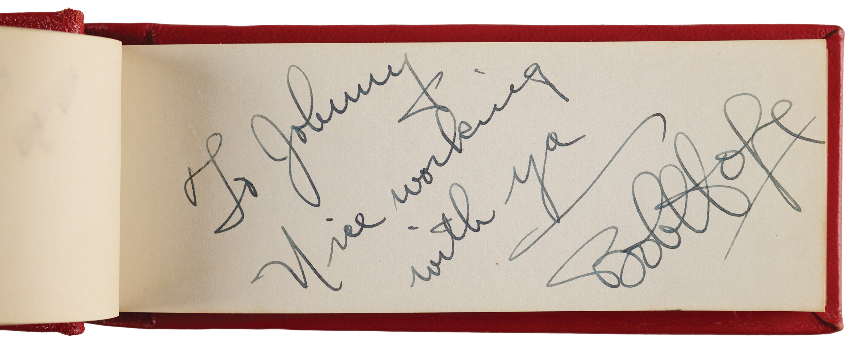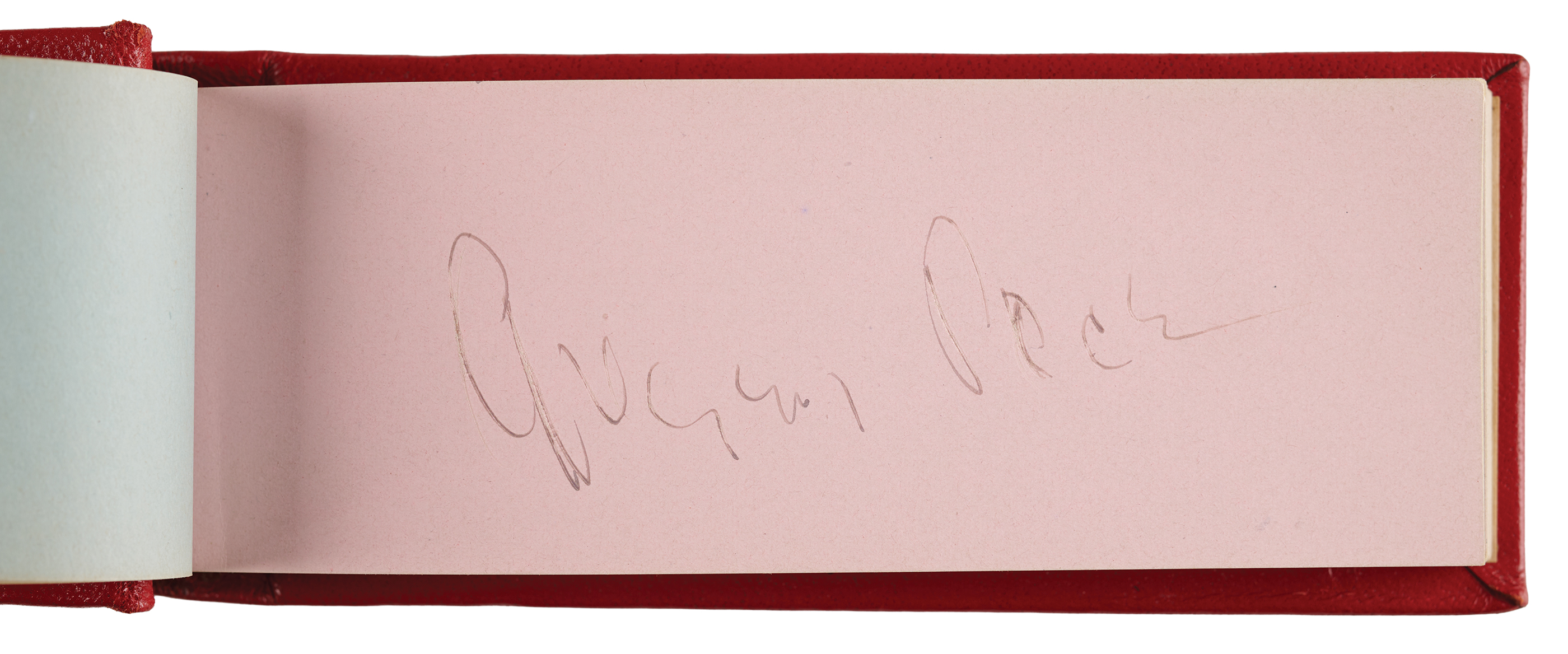 Vintage circa late 1940s hardcover autograph album, 6 x 2.5, signed inside in fountain pen by 25 entertainers, many with inscriptions to "Johnny." Includes: John Wayne, Chico Marx, Gregory Peck, Hoagy Carmichael, Jack Benny, Paul Winchell, Eddie Peabody, Martha Raye, Shirley Temple, John Agar, Dorothy Lamour, Peggy Mann, Robert Armstrong, Forrest Tucker, Harry Carey, Jr., Pat O'Brien, Rudy Vallée, Bob Hope, and a few others. In fine condition.
