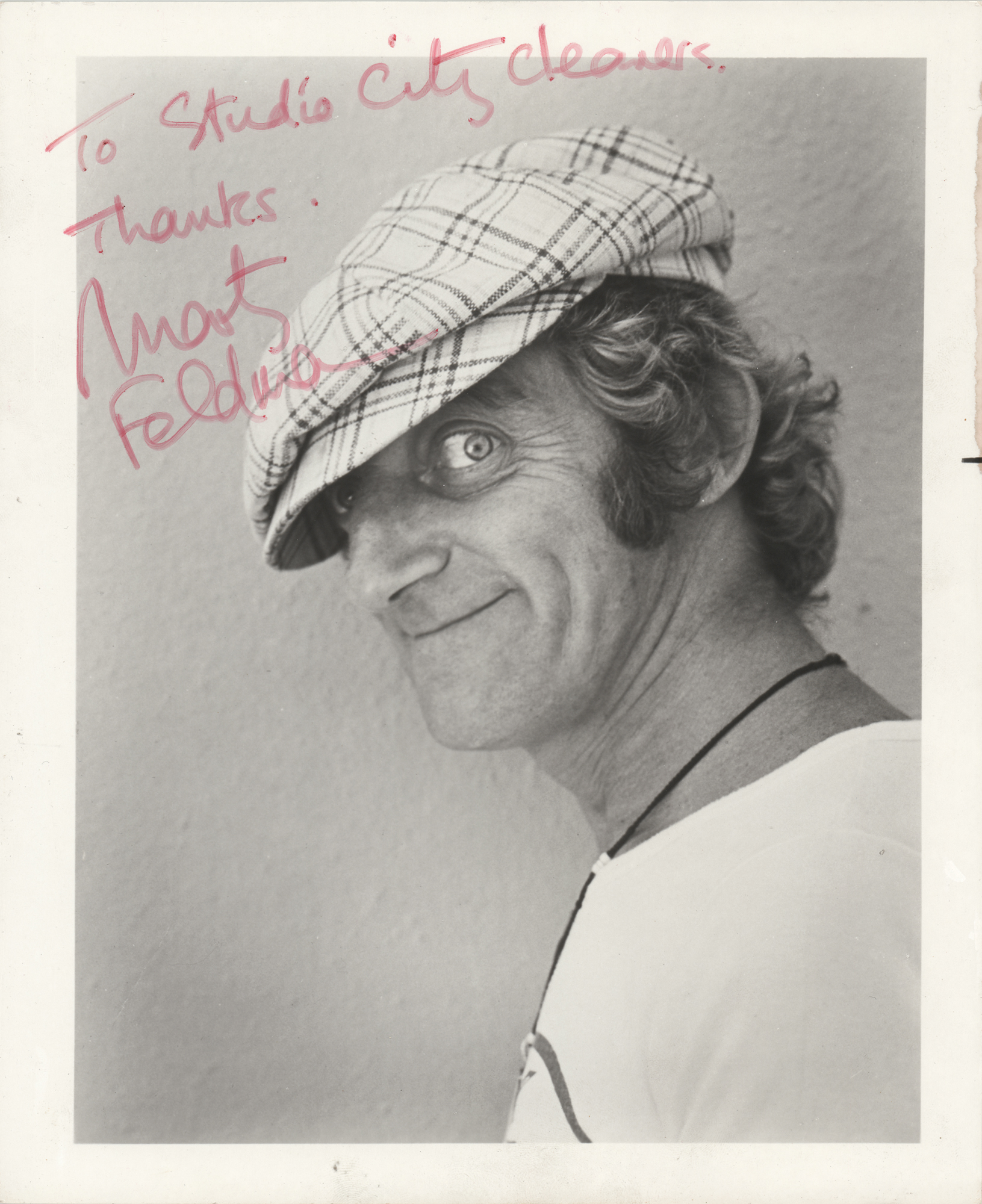 Glossy 8 x 10 photo of the bug-eyed actor in a newsboy cap, signed and inscribed in red felt tip, "To Studio City Cleaners, Thanks, Marty Feldman.” In fine condition.