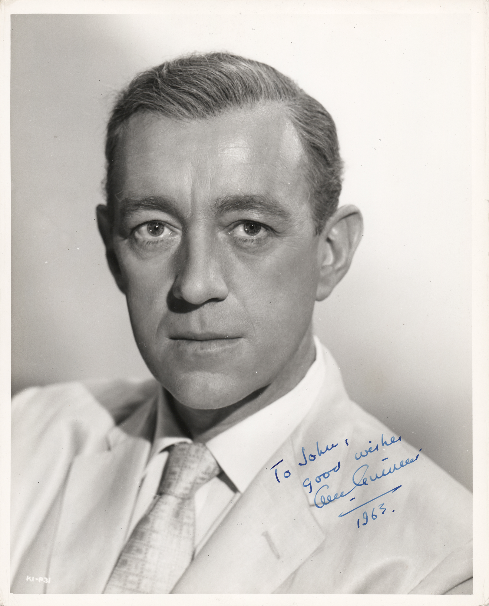 Vintage glossy 8 x 10 head-and-shoulders photo of the actor in a suit and tie, signed and inscribed in fountain pen, "To John, good wishes, Alec Guinness, 1963.” Reverse bears a Columbia Pictures copyright stamp. In fine condition.