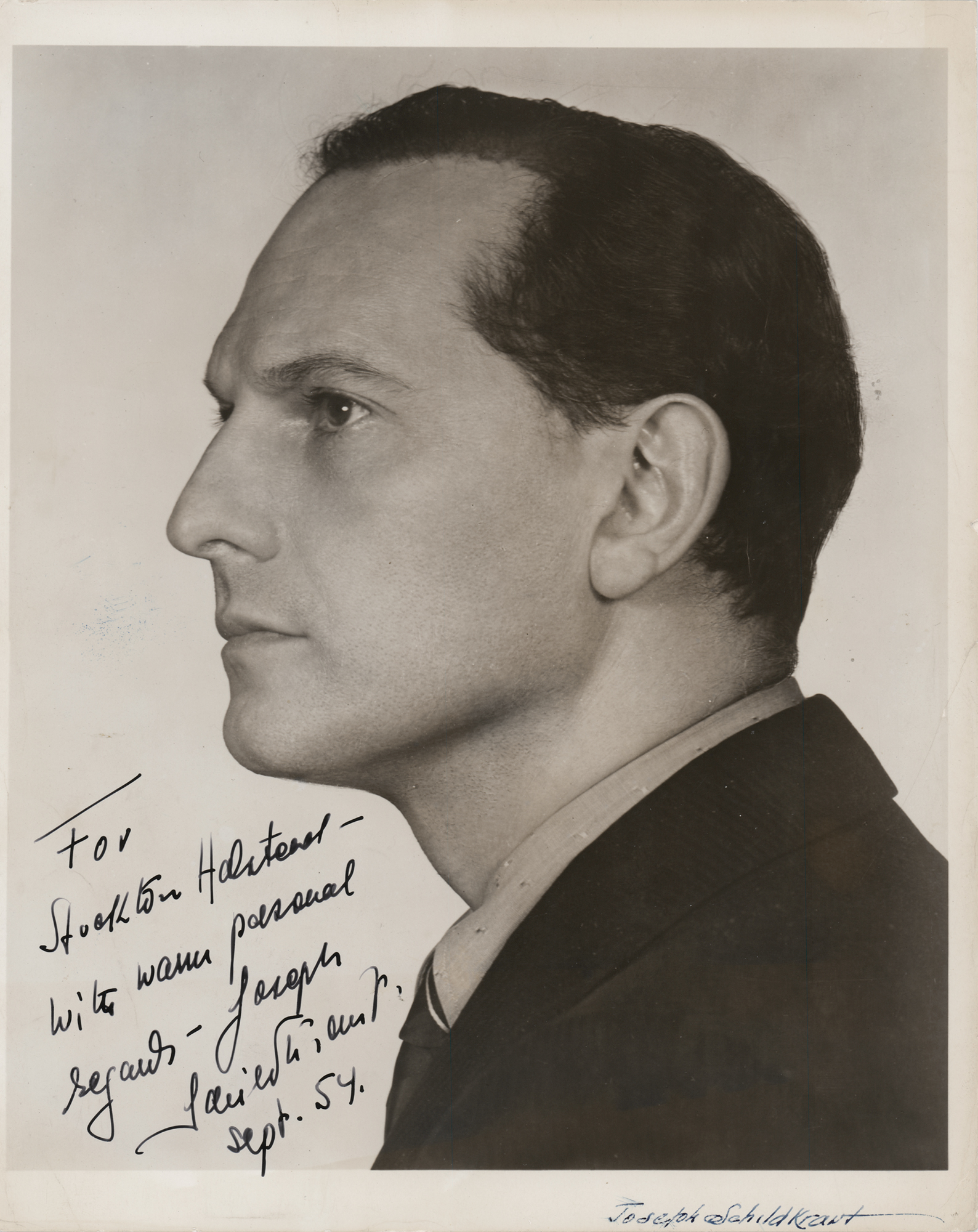 Viennese-born actor (1896–1964) who won an Academy Award for his role in the 1937 film The Life of Emile Zola. Vintage glossy 8 x 10 photo of the Oscar winner in a near-profile head-and-shoulders pose, signed and inscribed in fountain pen, "For Stockton Halstead—with warm personal regards–Joseph Schildkraut, Sept. 54.” In very good to fine condition, with scattered light creasing, a light paperclip impression to the top edge, and an ink notation to the lower border.