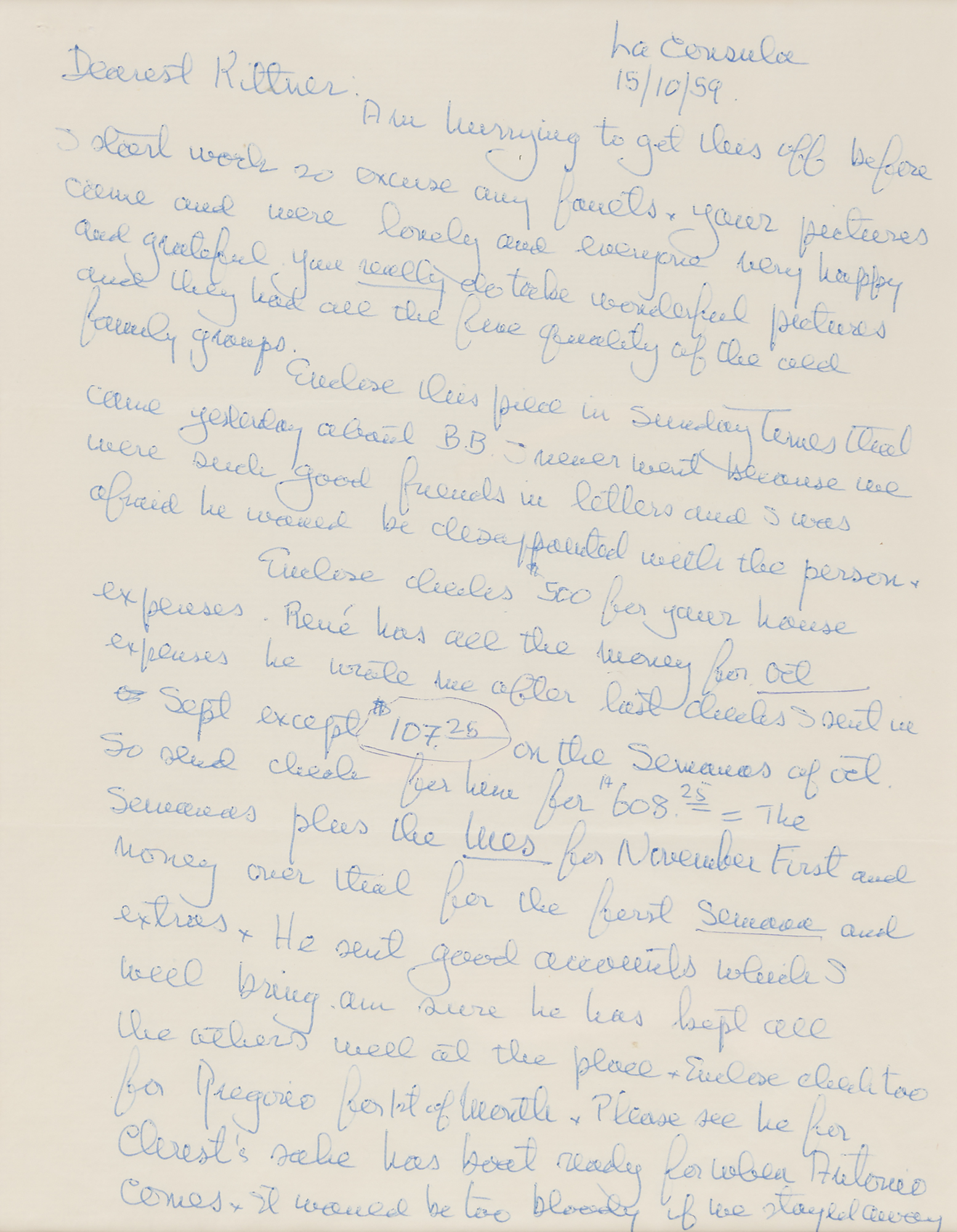 Enclose checks $500 for your house expenses. Rene has all the money for Oct expenses. He wrote me after last checks I sent in Sept except $107.25 on the Semanas of Oct. so send check for him for $608.25. The Semanas plus the mes for November First and money over that for the first Semana and extras. He sent good accounts which I will bring. Am sure he has kept all the others well at the place. Enclose check too for Gregorio for 1st of month. Please see he for Christ's sake has boat ready for when Antonio [Ordonez] comes. It would be too bloody if we stayed away. I gave him money to do everything he needed to do and then he would leave boat out of commission. Note that the c[y]clones are up into the I's—But understand they've been away on the usual, as of late, pattern. (Hope I can write better than that when I crank up at the end of this page).