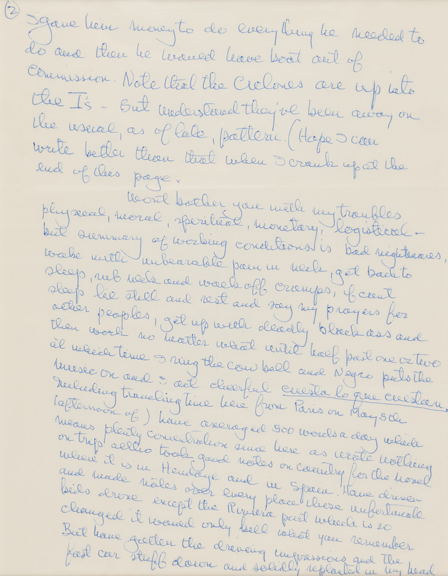 Won't bother you with my troubles physical, moral, spiritual, monetary, logistical—but summary of working conditions is bad nightmares, wake with unbearable pain in neck, get back to sleep, rub neck and walk off cramps, if can't sleep lie still and rest and say my prayers for other peoples, get up with deadly black ass and then work no matter what until half past one or two at which time I ring the cow bell and Negro puts the music on and I act cheerful cuesta lo quecuestan.