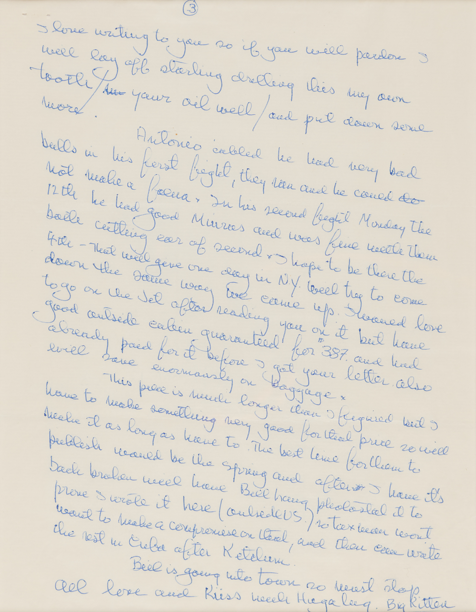 ALS signed “All love and Kiss much Hugalug, Big Kitten,” three pages, 7.5 x 9.75, October 15, 1959. Handwritten letter to his wife Mary, playfully calling her "Dearest Kittner," with significant content referring to his delusionary nightmares (a factor in his suicide eighteen months later), the brilliant matador Antonio Ordonez, and his writing of a bullfight article for Life magazine, 'The Dangerous Summer.'