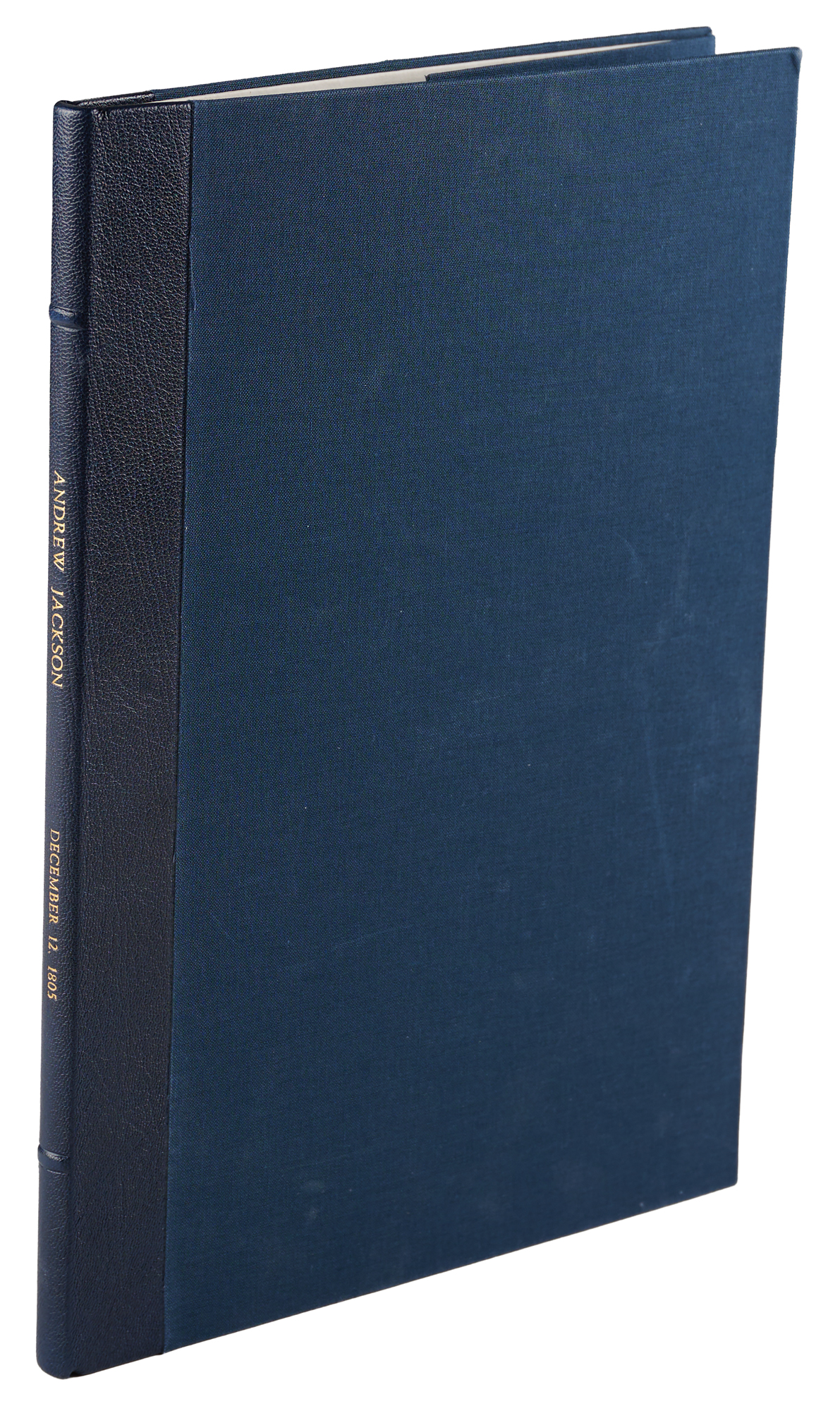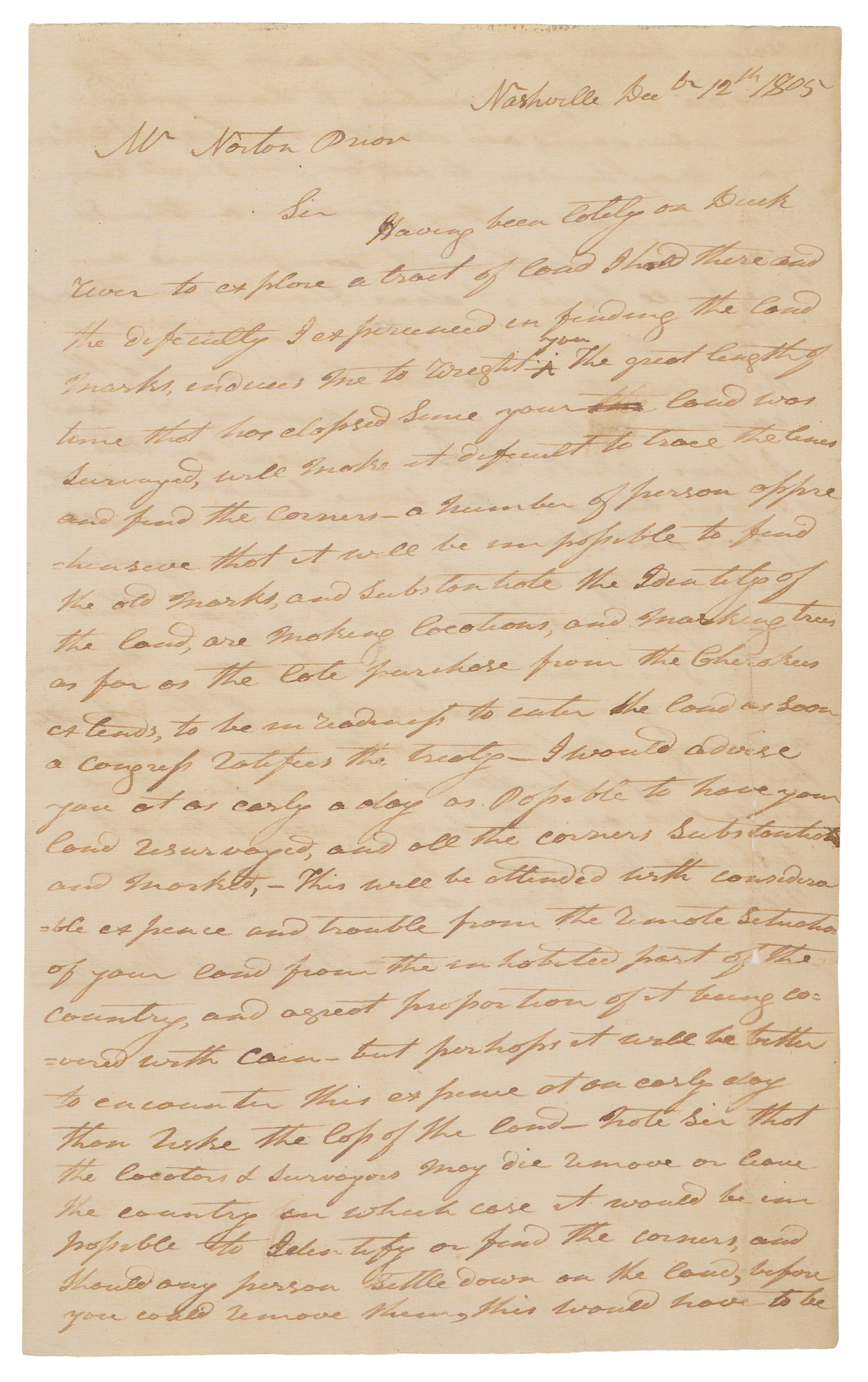 ALS, signed "Andrew Jackson," one page both sides, 7.5 x 12.25, December 12, 1805. Handwritten letter to Norton Prior, touching upon early American land speculation and a recently concluded treaty with the Cherokee. In full: "Having been lately on Duck River to explore a tract of land I hold there and the difficulty I experienced in finding the landmarks, induces me to write you. The great length of time that has elapsed since your land was surveyed, will make it difficult to trace the lines and find the corners. A number of persons observe that it will be impossible to find the old marks and substantiate the identitys of the land, are marking locations and marking trees as far as the late purchase from the Cherokees extends, to be in readiness to enter the land as soon as Congress ratifies the treaty. I would advise you at as early a day as possible to have your land resurveyed, and all the corners substantiated and marked. This will be attended with considerable expense and trouble from the remote sections of your land from the inhabited part of the country, and a great proportion of it being covered with corn but perhaps it will be better to encounter this expense at an early day than make the loss of the land.