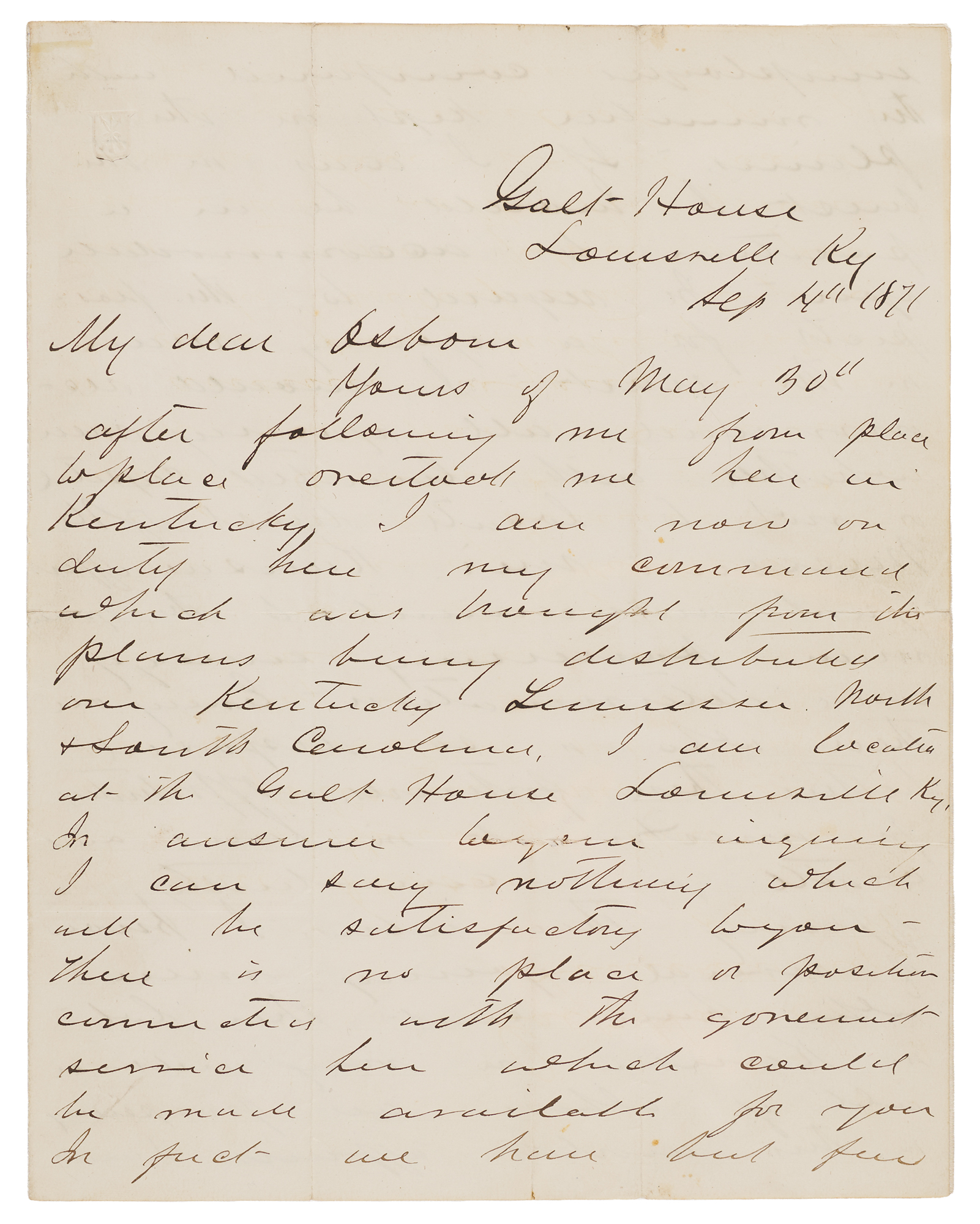 ALS signed “G. A. Custer, Galt House, Louisville, Ky.,” four pages on two adjoining sheets, 8 x 10, September 4, 1871. Handwritten letter to "Osborn," offering his own version of the immortal advice to 'Go West, young man.' In full: "Yours of May 30th after following me from place to place overtook me here in Kentucky. I am now on duty here my command which was brought from the plains being distributed over Kentucky Louisiana North & South Carolina. I am located at the Galt House Louisville Ky. In answer to your inquiry I can say nothing which will be satisfactory to you—there is no place or position connected with the government service here which could be made available for you. In fact we have but few unemployed companies with the members kept on the plains. If I was in the West I would be in a position to accommodate you.