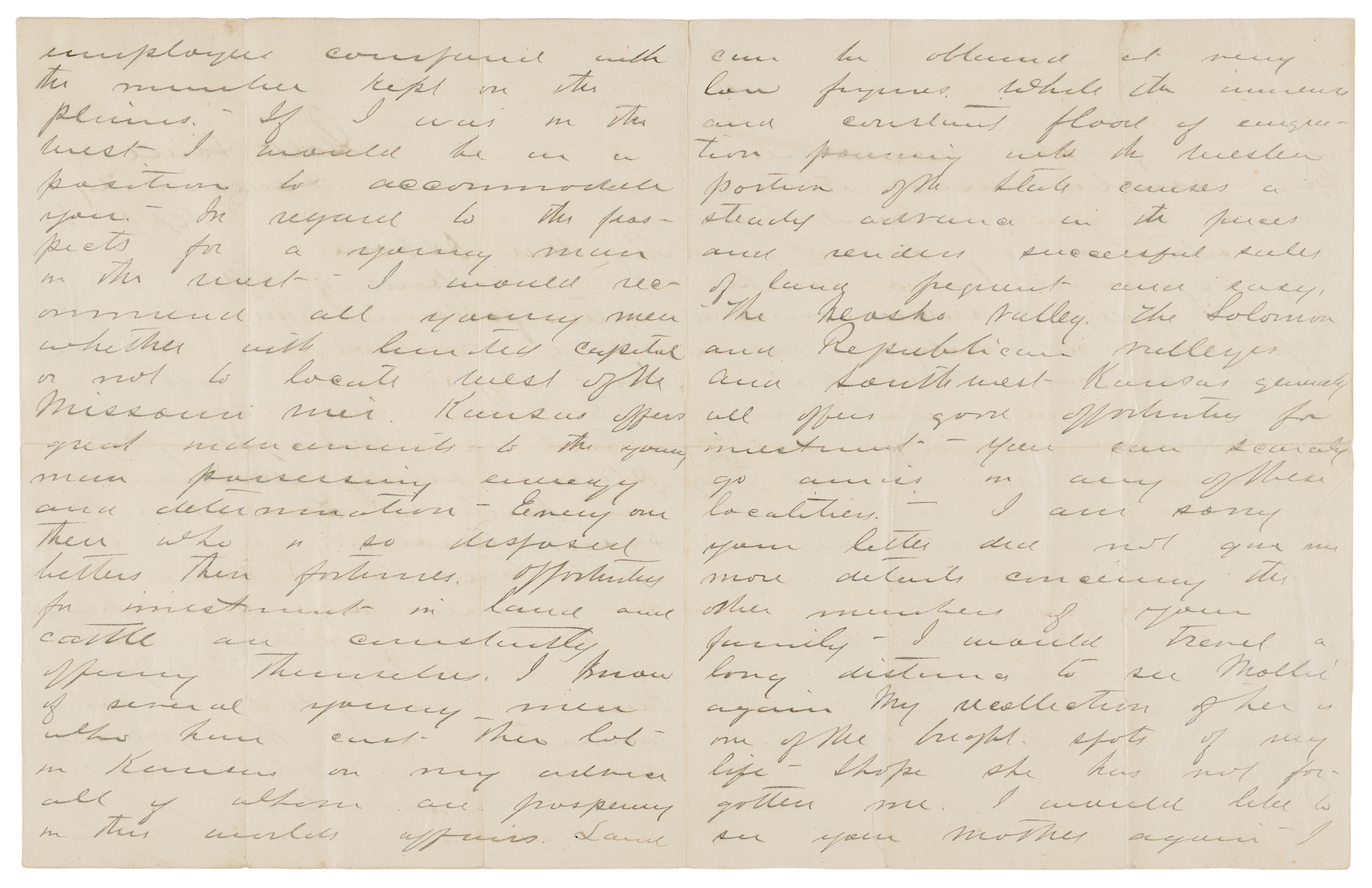 In regard to the prospects for a young man in the West—I would recommend all young men whether with limited capital or not to locate West of the Missouri since Kansas offers great inducements to the young man possessing energy and determination. Every one there who is so disposed betters their fortunes. Opportunities for investment in land and cattle are constantly offering themselves. I know of several young men who have cast their lot in Kansas on my advice all of whom are prospering in their worldly affairs. Land can be obtained at very low figures while the issuance and constant flood of emigration pouring into the Western position of the State causes a steady advance in the prices and renders successful sales of land pleasant and easy. The Neosho Valley, the Solomon and Republican Valleys and Southwest Kansas genuinely all offers some opportunities for investment. You can scarcely go amiss in any of these localities.