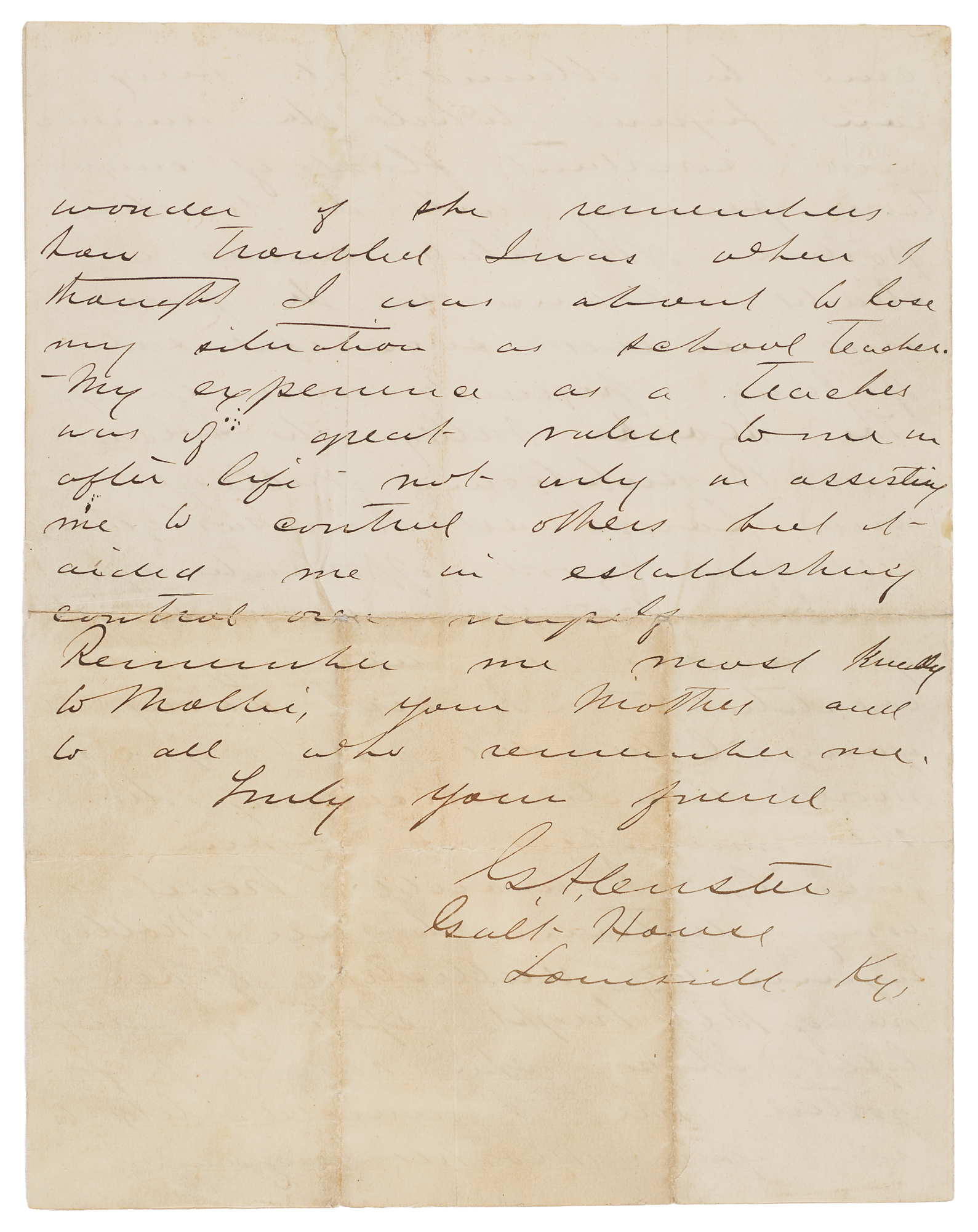 I am sorry your letter did not give me more details concerning the other members of your family. I would travel a long distance to see Mollie again. My recollection of her is one of the bright spots of my life. I hope she has not forgotten me. I would like to see your mother again. I wonder if she remembers how troubled I was when I thought I was about to lose my situation as school teacher. My experience as a teacher was of special value to me in after life not only in assisting me to control others but It aided me in establishing control over myself. Remember me most kindly to Mollie, your Mother, and to all who remember me." In fine condition, with some toning to the signed page, and professionally silked on the two inner pages.
