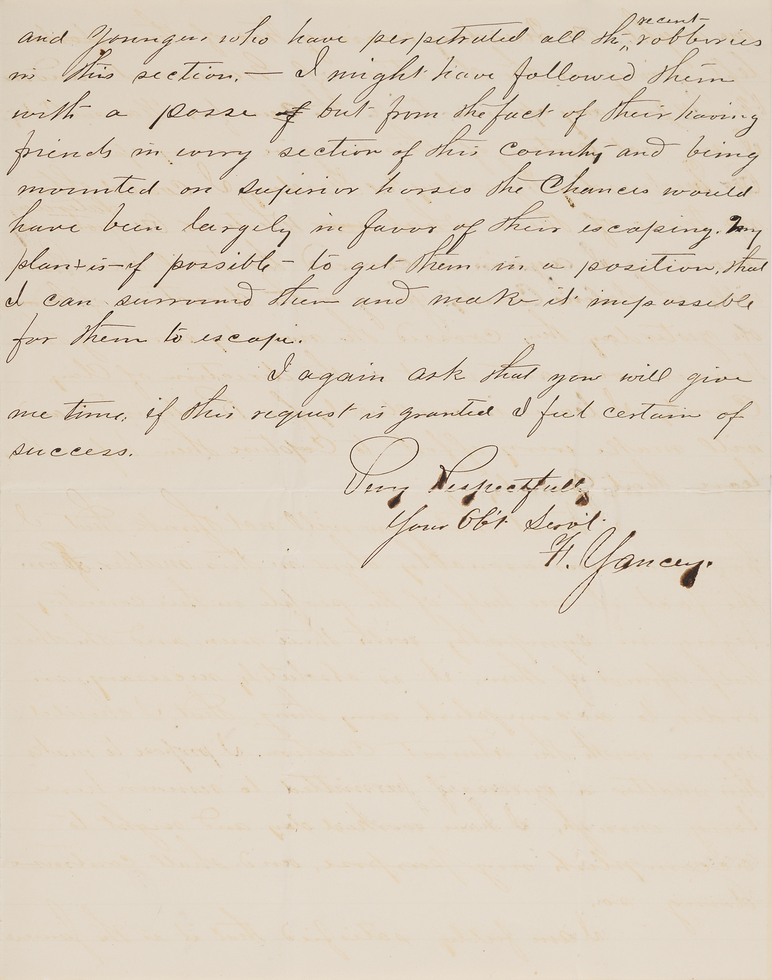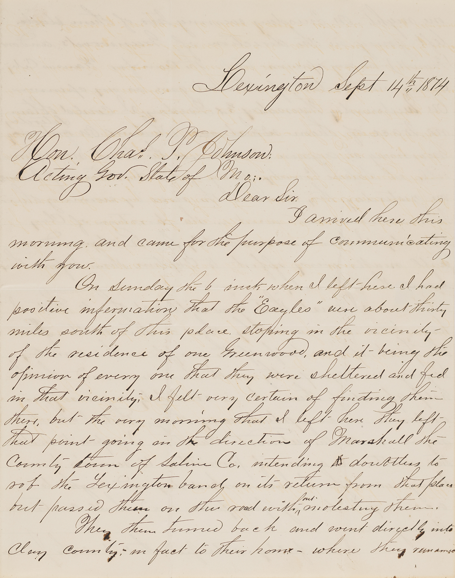 ALS signed “F. Yancey,” three pages on two sheets, 8 x 10, September 14, 1874. Handwritten letter to Hon. Charles P. Johnson, acting governor of Missouri, just eleven days after being hired as an agent for the Missouri secret service to track down the James-Younger Gang. In part: "On Sunday the 6 inst., when I left here I had positive information that the 'Eagles' were about thirty miles south of this place stoping in the vicinity of the residence of one Greenwood, and it being the opinion of every one that they were sheltered and fed in that vicinity, I felt very certain of finding them there, but the very morning that I left here they left that point going in the direction of Marshall…intending doubtless to rob the Lexington band on its return from that place, but passed them on the road without molesting them.