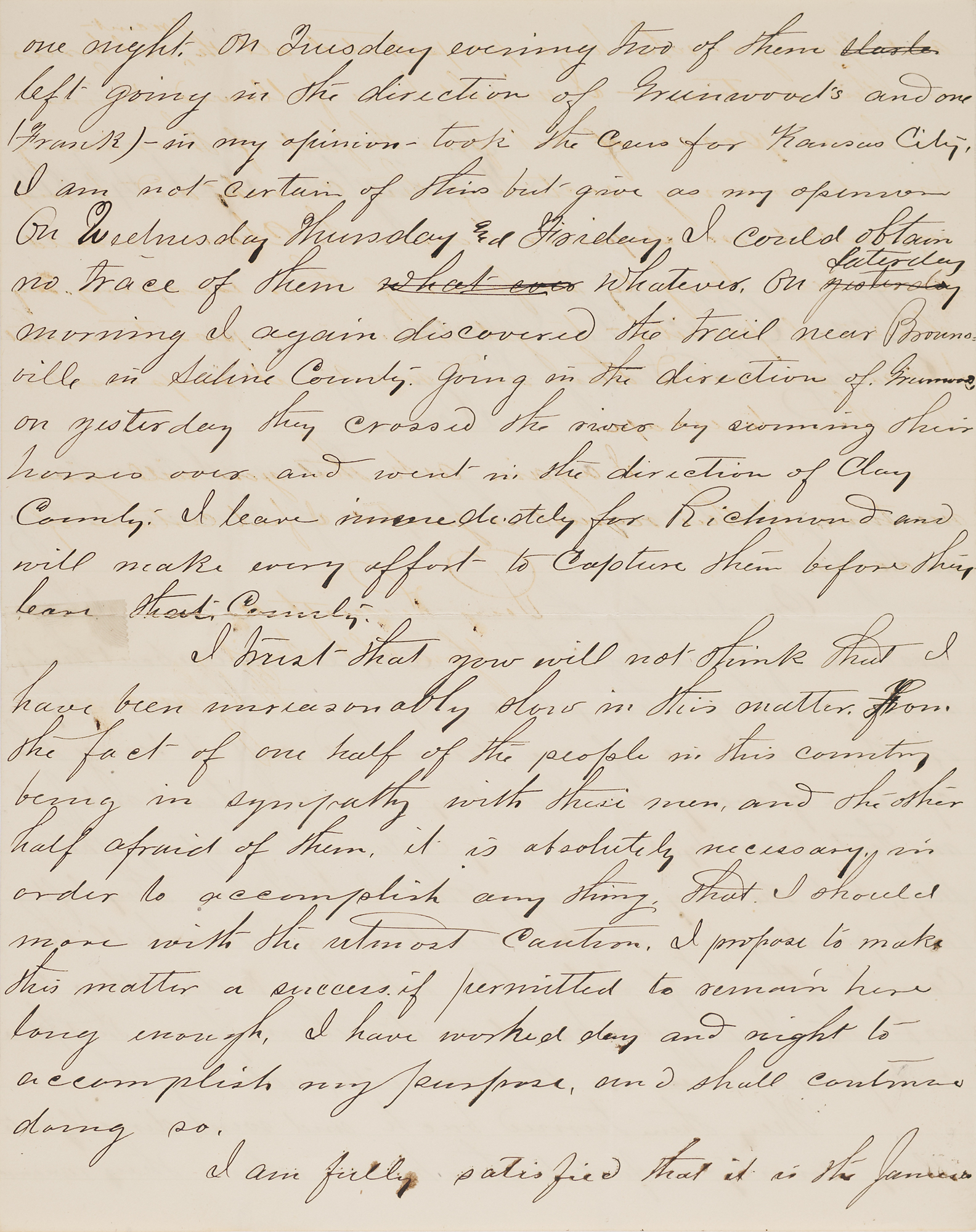 They then turned back and went directly into Clay County, in fact to their home—where they remained one night. On Tuesday evening two of them left going in the direction of Greenwood's and one (Frank)—in my opinion—took the cars for Kansas City. I am not certain of this but give as my opinion. On Wednesday, Thursday, and Friday, I could obtain no trace of them whatever. On Saturday morning I again discovered their trail…going in the direction of Greenwood. On yesterday they crossed the river by swimming their horses over and went in the direction of Clay County. I leave immediately for Richmond and will make every effort to capture them before they leave that county.