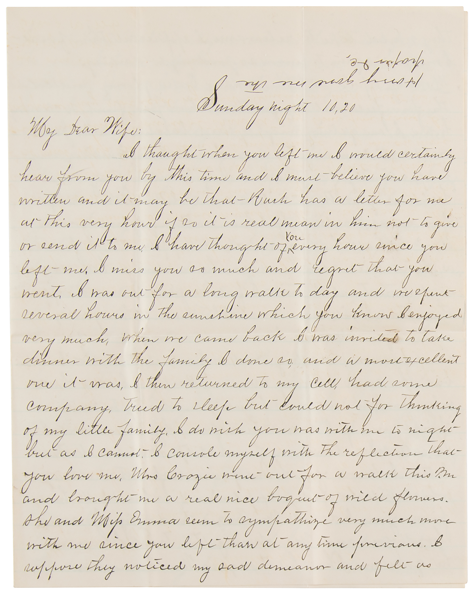 When we came back I was invited to take dinner with the family. I done so and a most excellent one it was. I then returned to my cell, had some company, tried to sleep by could not for thinking of my little family. I do wish you was with me to night but as I cannot, I console myself with the reflection that you love me….