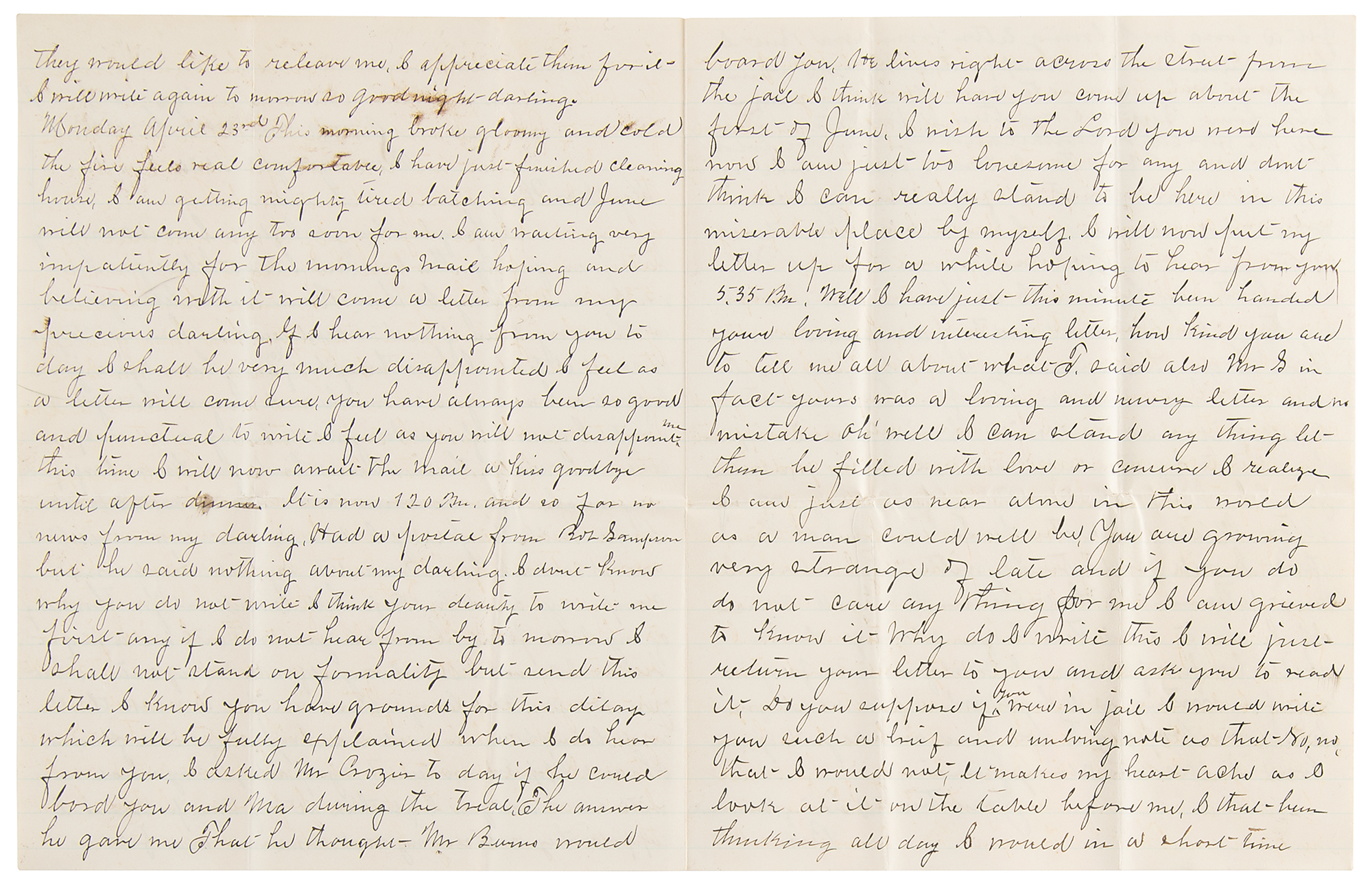 Monday April 23rd. This morning broke gloomy and cold. The fire feels real comfortable. I have just finished cleaning house…I am waiting very impatiently for the morning's mail hoping and believing with it will come a letter from my precious darling. If I hear nothing from you today I shall be very much disappointed. I feel as a letter will come sure, you have always been so good and punctual to write I feel as you will not disappoint me this time.