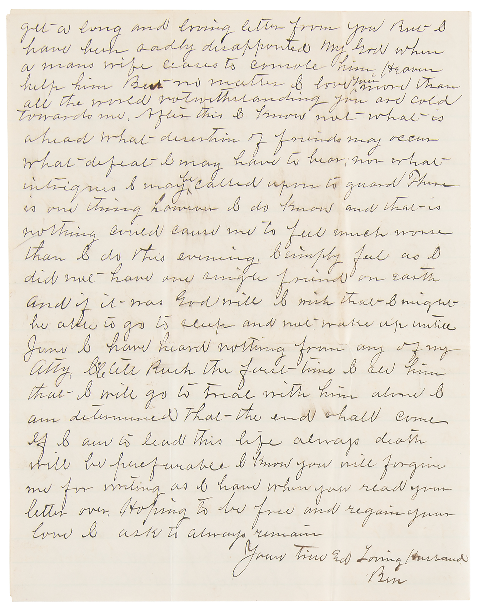 Outlaw and older brother of Jesse James (1843-1915). ALS signed “Your True and Loving Husband, Ben,” four pages on two adjoining sheets, 7.5 x 9.75, April 22–23, 1883. Lengthy and deeply emotional handwritten letter to his wife while jailed in Gallatin, Missouri, awaiting trial for murder during a train robbery; as usual, he signs using an alias to ensure their privacy should his letter fall into the hands of reporters. In part: "I thought when you let me I would certainly hear from you by this time and I must believe you have written and it may be that Rush has a letter for me at this very hour if so it is real mean in him not to give or sent it to me. I have thought of you every hour since you left me. I miss you so much and regret that you went. I was out for a long walk to day and we spent several hours in the sunshine which you know I enjoyed very much.