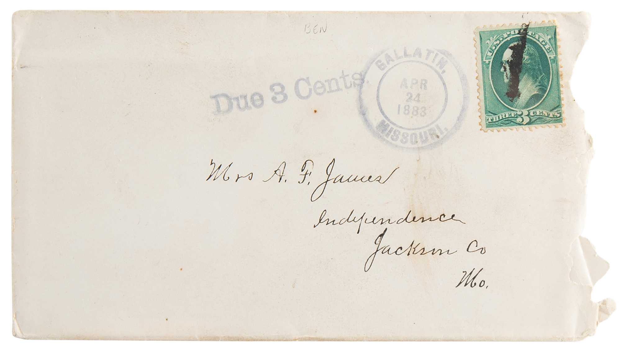 Do you suppose if you were in jail I would write you such a brief and unloving not as that. No, no, that I would not. It makes my heart ache as I look at it on the table before me…I have been sadly disappointed My God when a man's wife ceases to console him Heaven help him. But no matter I love you more than all the world notwithstanding you are cold towards me. After this I know not what is ahead what desertion of friends may occur what defeat I may have to hear; nor what intrigues I may be called upon to guard. There is one thing however I do know and that is nothing could cause me to feel much worse than I do this evening. I simply feel as I did not have one single friend on Earth and if it was God's will I wish that I might be able to go to sleep and not wake up untill June. I have heard nothing from any of my atty. I'll tell Rush the first time I see him that I will go to trial with him alone. I am determined that the end shall come. If I am to lead this life always death will be preferable…Hoping to be free and regain your love." In fine condition. Accompanied by the original mailing envelope, addressed by Frank James to "Mrs. A. F. James, Independence, Mo."