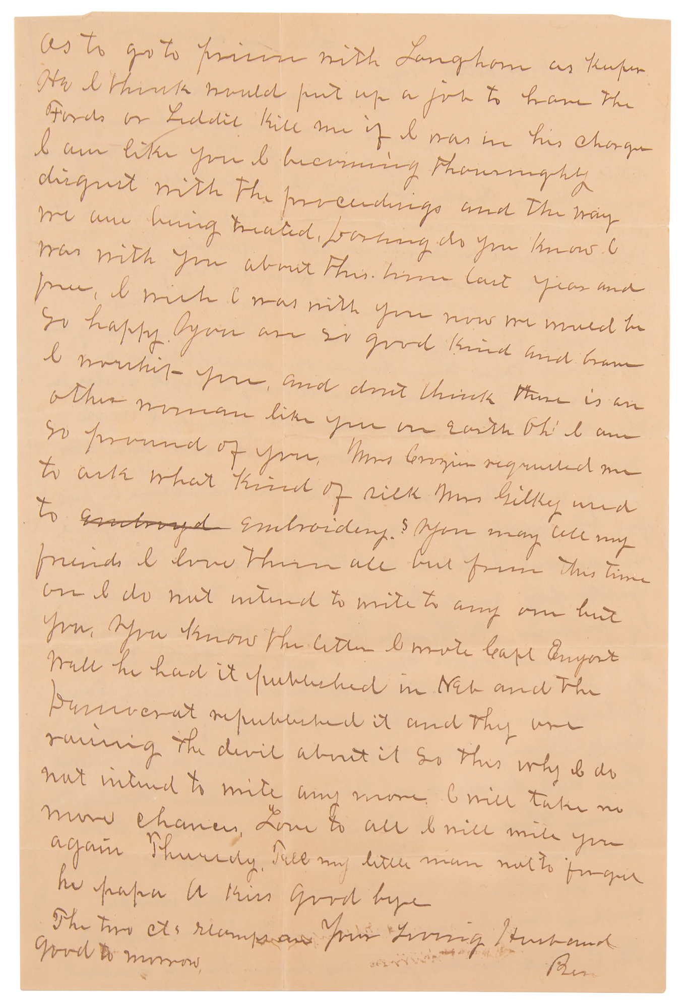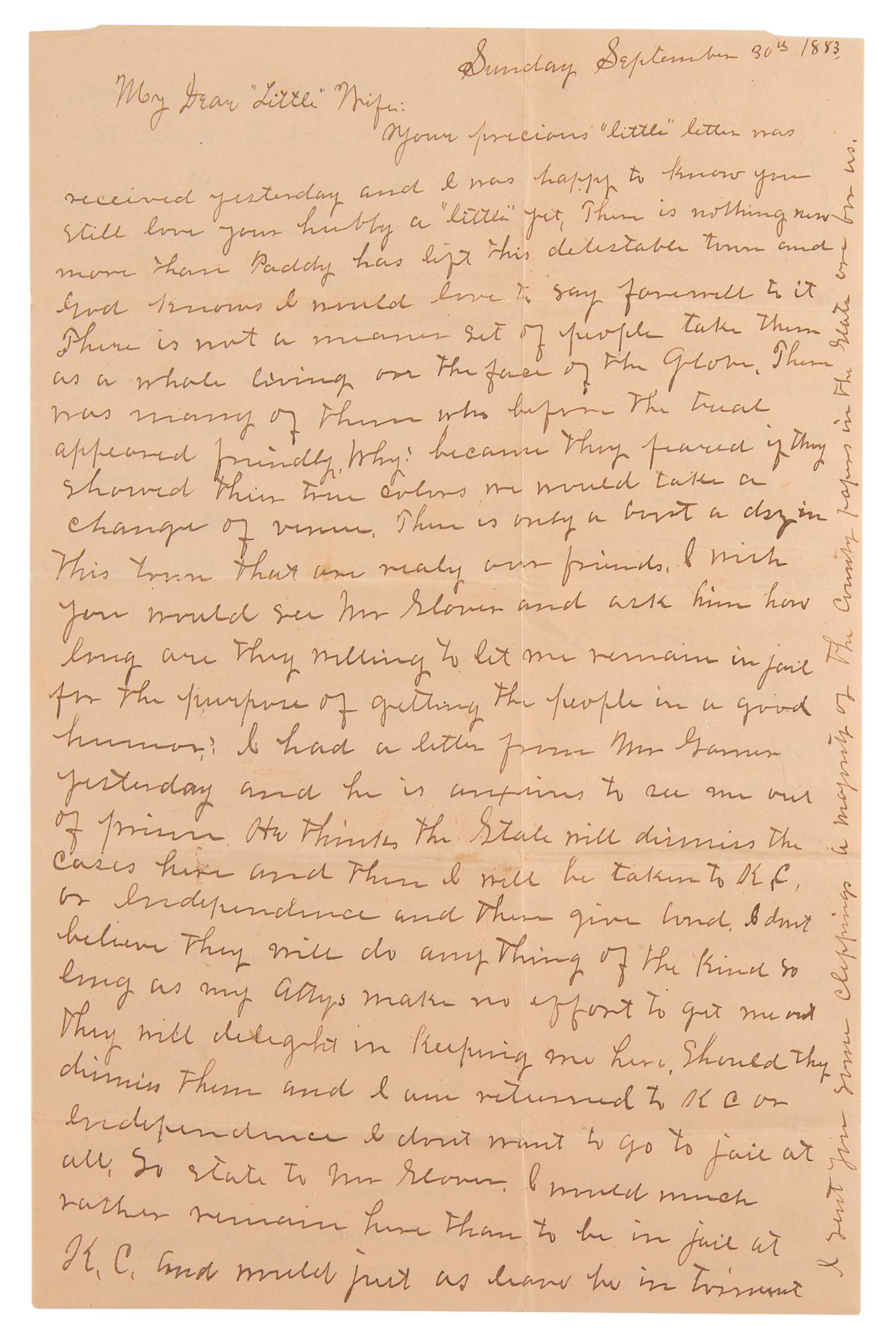 ALS signed “Your Loving Husband, Ben,” one page both sides, 8 x 12, September 30, 1883. Handwritten letter to his "'Little' Wife" while jailed in Gallatin, Missouri, awaiting trial for murder during a train robbery; as usual, he signs using an alias to ensure their privacy should his letter fall into the hands of reporters. In part: "Your precious 'little' letter was received yesterday and I was happy to know you still love your hubby a 'little' yet. There is nothing new more than Paddy has left this detestable town and God knows I would love to say farewell to it There is not a meaner set of people take them as a whole living on the face of the globe. There was many of them who before the trial appeared friendly. Why? because they feared if they showed their true colors we would take a change of venue. There is only a bout a doz. in this town that are really our friends.