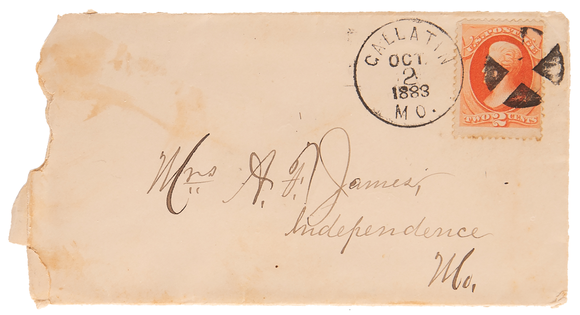 I am like you I becoming thoroughly disgust with the proceedings and the way we are being treated. Darling do you know I was with you about this time last year and how I wish I was with you now we would be so happy you are so good kind and how I worship you and don't think there is an other woman like you on earth Oh! I am so proud of you." In fine condition. Accompanied by the original mailing envelope, addressed by Frank James to "Mrs. A. F. James, Independence, Mo."