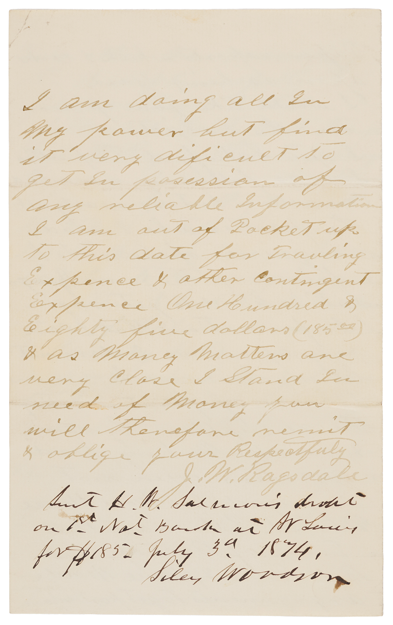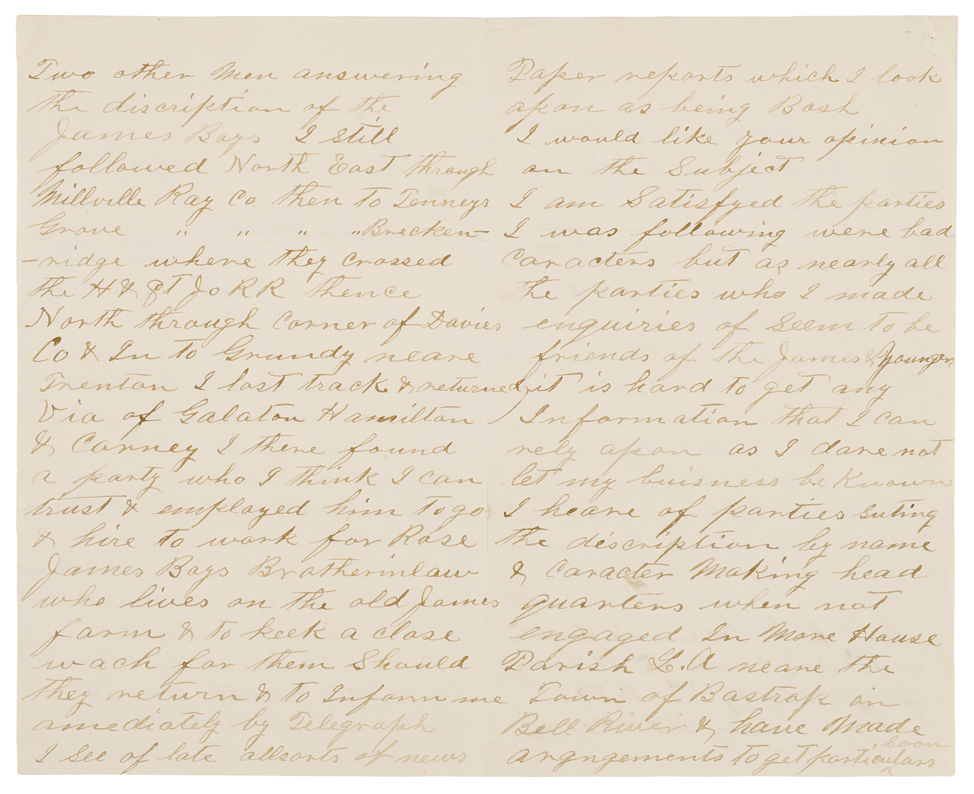 ALS signed “J. W. Ragsdale,” four pages on two adjoining sheets, 5 x 8, January 1, 1874. Handwritten letter to "Hon. Silas Woodson, Gov. State of Mo., Jefferson City," sent three months after being hired to track down the members of the James-Younger Gang, reporting on his progress. In part: "I again write you in regard to travels since I last written you the most important one being from Lees Summit. I there asertained that 2 men of suspicious looks had gone north. I hired a horse & followed & found out that they crossed the Mo. River at a place called Cogsville in Jackson County. They went north to Elk Horn in Ray Co. & was there joined by two other men answering the discription of the James Boys. I still followed north east…to Grundy near Trenton I lost track & returned via of Galaton Hamilton & Carnney. I there found a party who I think I can trust & employed him to go & work for Rose James Boys Brotherinlaw who lives on the old James farm & to keep a close wach for them should they return & to inform me imediately by Telegraph…