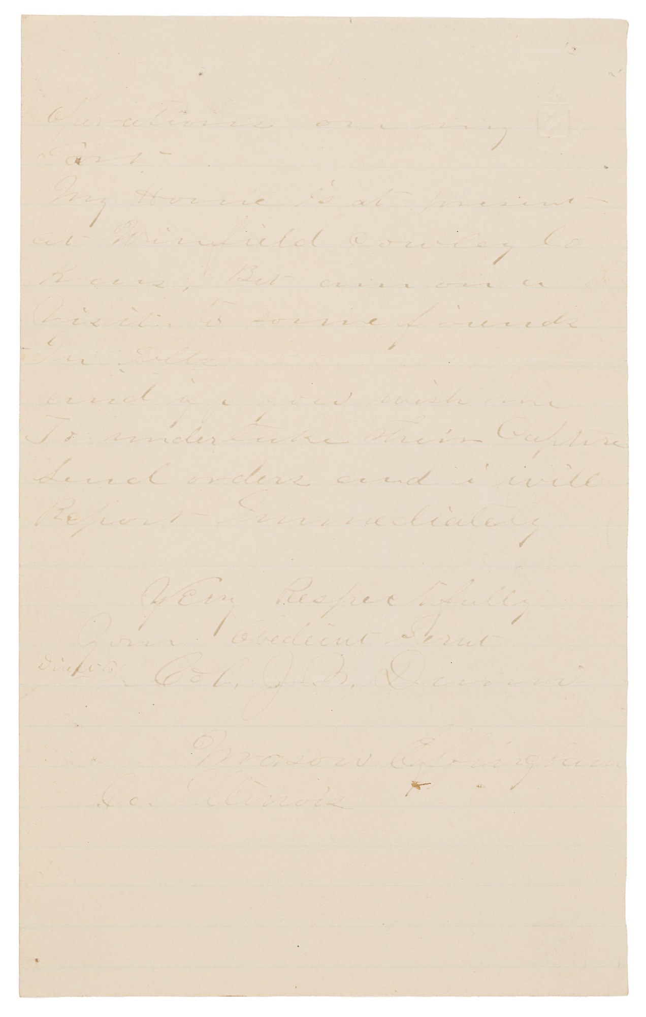 ALS signed “Col. J. B. Dunn,” one page both sides, 5 x 8, September 8, 1874. Handwritten letter to "His Excellency Governor Woodson," in full: "I respectfully call your attention to my self as wishing to undertake the capture of the James Bros. & Youngers. I am at your service & if you wish me to undertake the capture of the aforesaid parties, send orders for my guidance. I am well used to such fellows. I was raised on the frontiers of Missouri and Kansas, and all I would request of you would be your sanction of lawfull operations on my part. My home is at present at Winfield, Cowley Co., Kans., but am on a visit to some friends in Ill. And if you wish me to undertake their capture send orders and I will report immediately." In fine condition, with all of the handwriting very light, but still readable. Accompanied by the original mailing envelope.