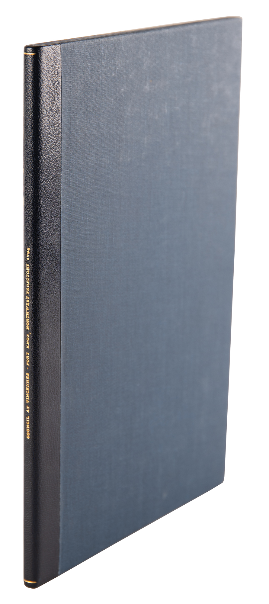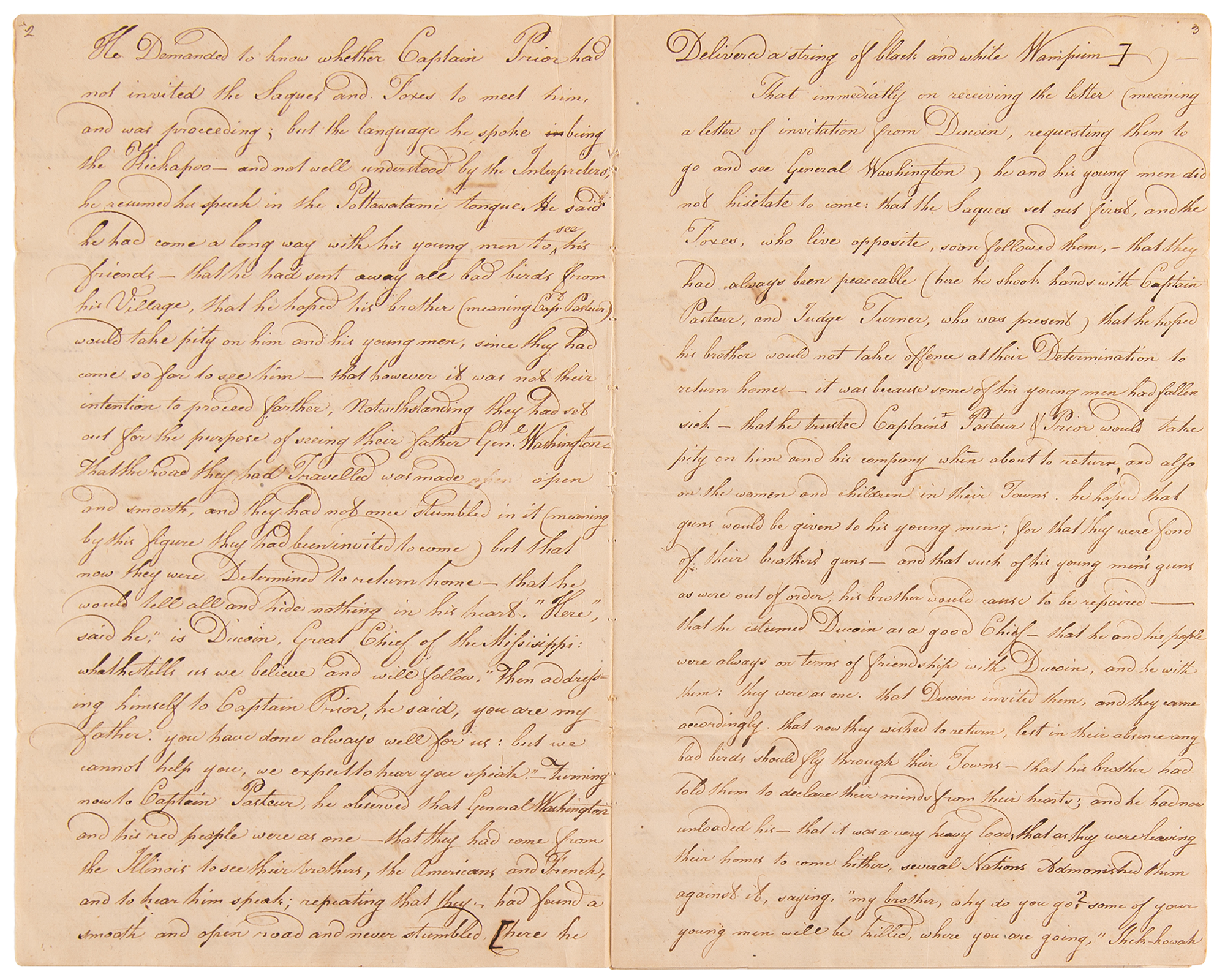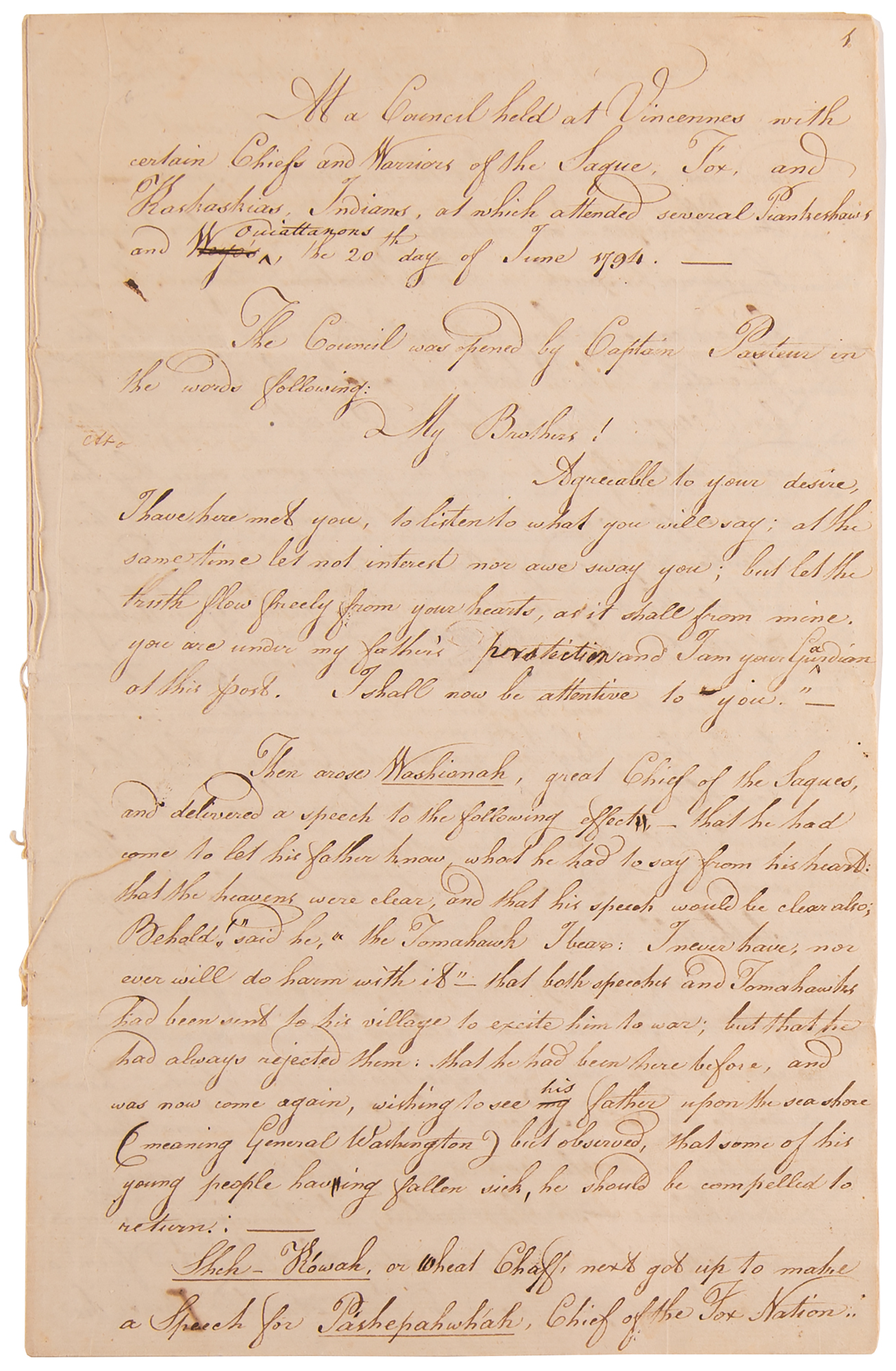 Manuscript DS, twelve pages on adjoining string-bound sheets, 7.5 x 12, June 20, 1794. Significant manuscript record of a "Council held at Vincennes with certain Chiefs and Warriors of the Saque, Fox, and Kaskaskias, Indians, at which attended several Piankeshaws and Ouiattanons," with the United States represented by Captains Pasteur and Prior. In this record of the Council, chiefs from the three tribes express their affection for Gen. George Washington, the United States, and France, and request more provisions from the white settlers, especially guns.