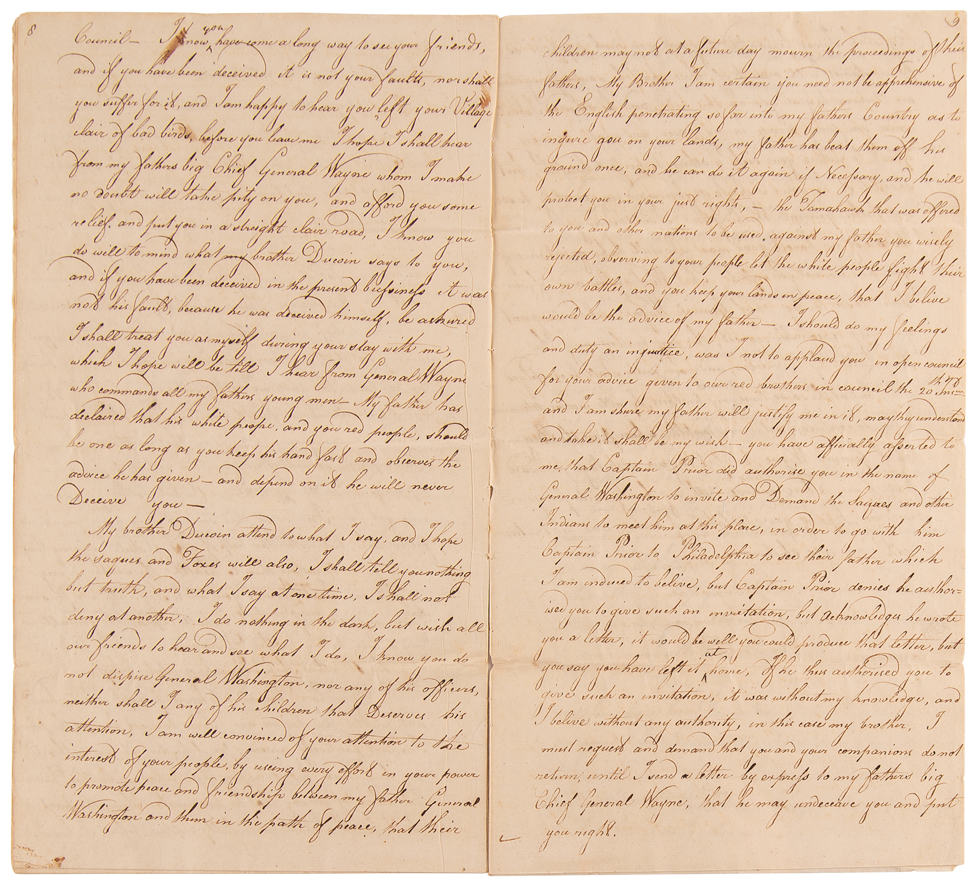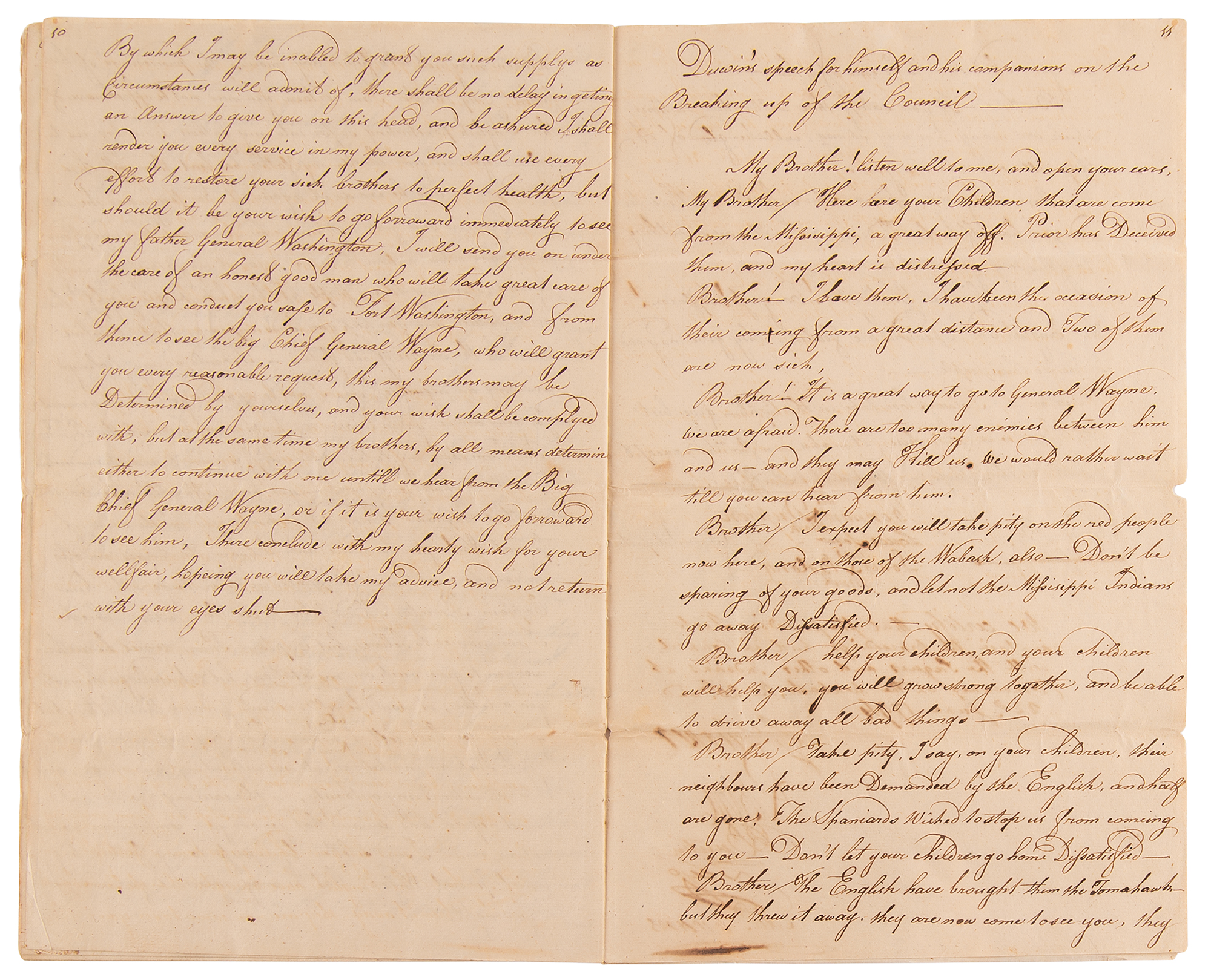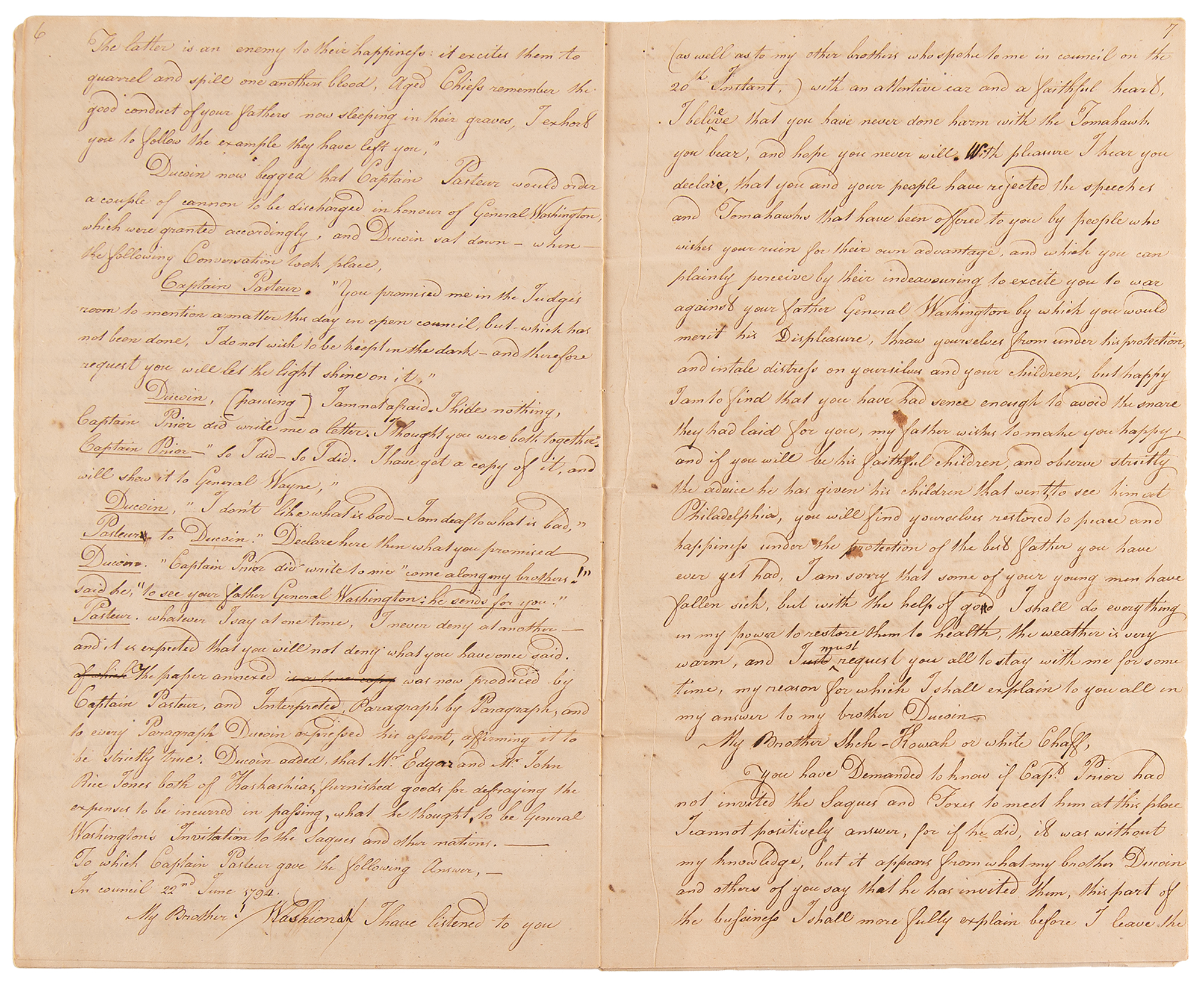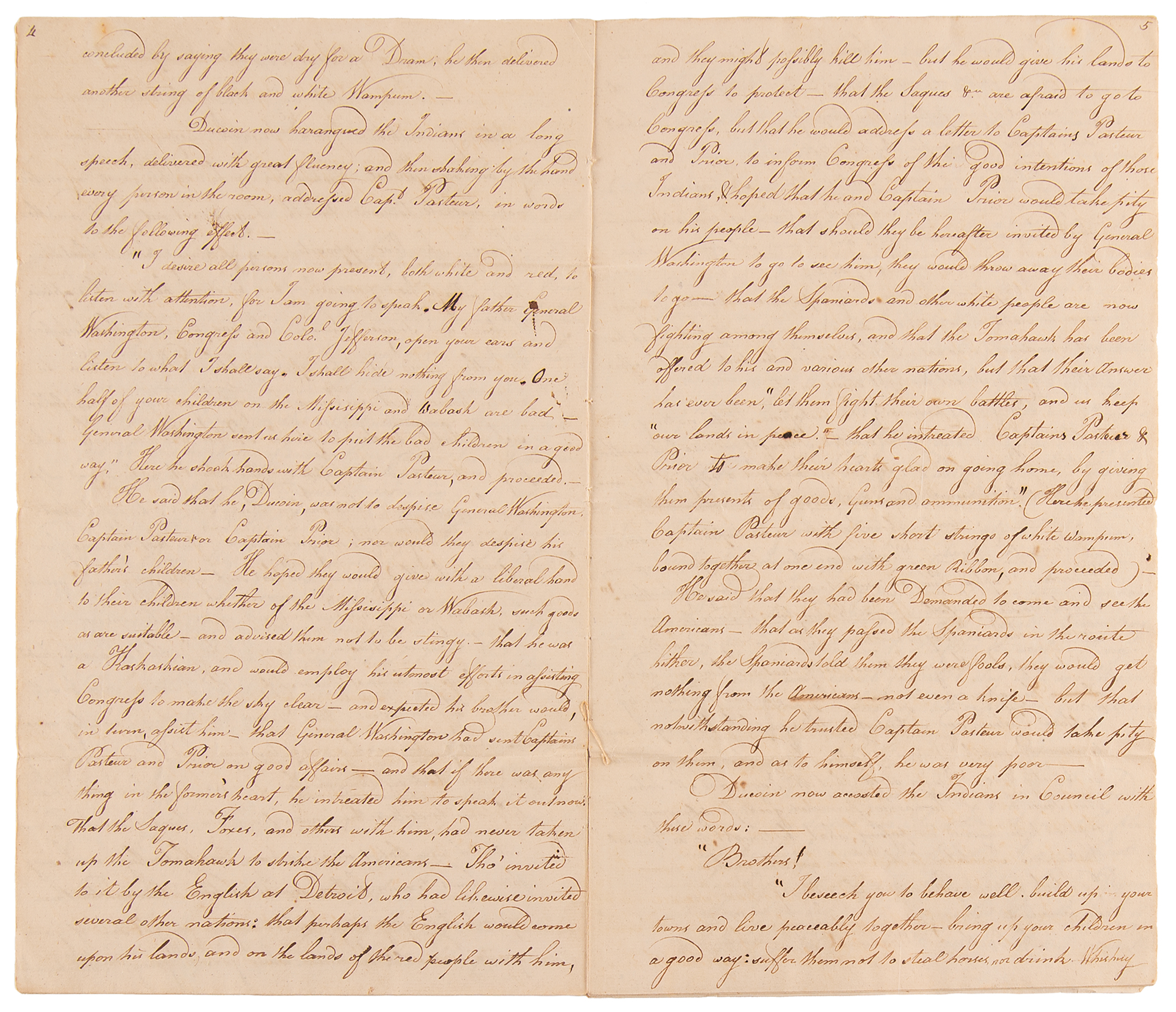 Manuscript DS, twelve pages on adjoining string-bound sheets, 7.5 x 12, June 20, 1794. Significant manuscript record of a "Council held at Vincennes with certain Chiefs and Warriors of the Saque, Fox, and Kaskaskias, Indians, at which attended several Piankeshaws and Ouiattanons," with the United States represented by Captains Pasteur and Prior. In this record of the Council, chiefs from the three tribes express their affection for Gen. George Washington, the United States, and France, and request more provisions from the white settlers, especially guns.