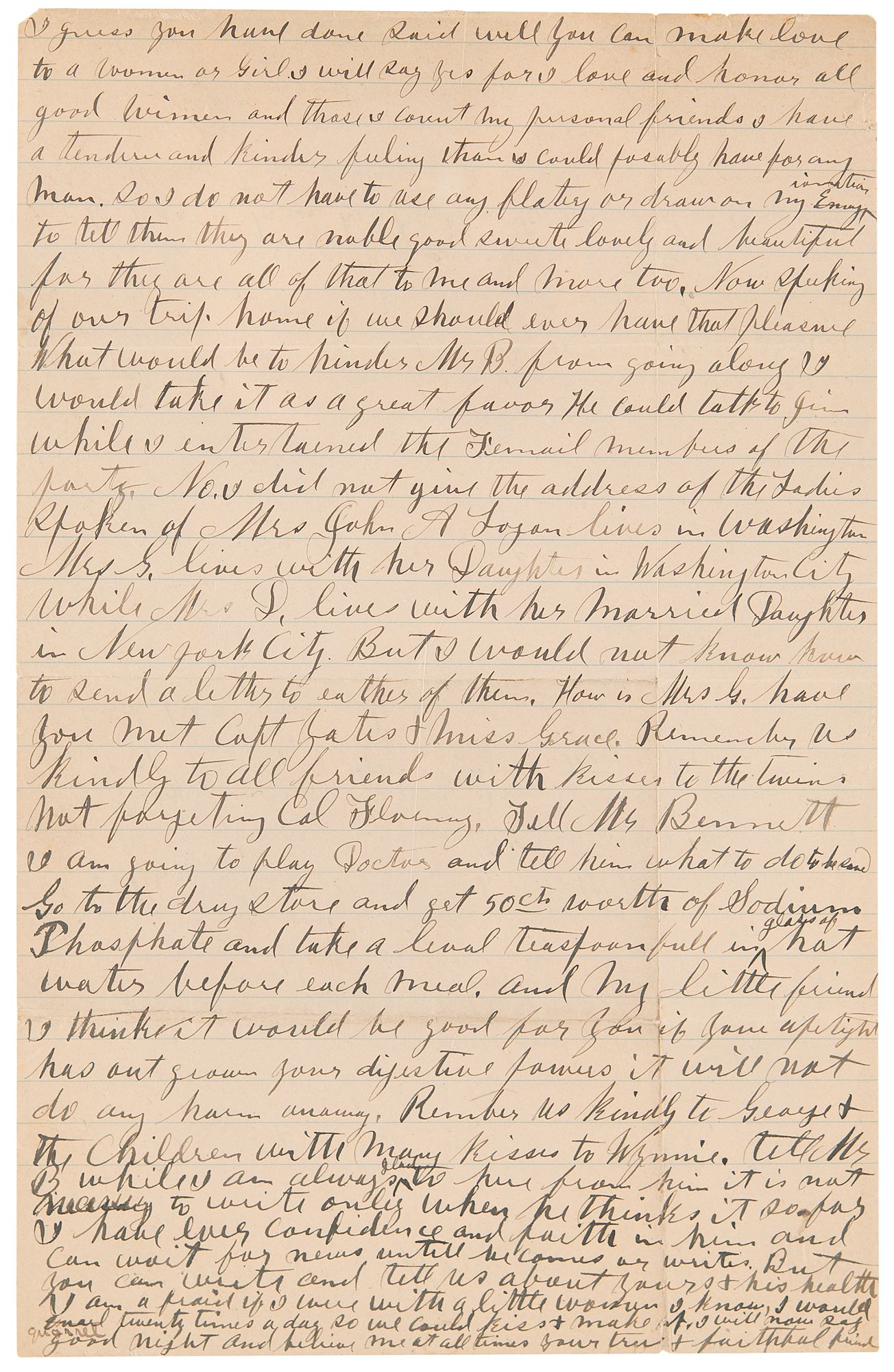 Now speaking of our trip home if we should ever have that pleasure what would be to hinder Mr. B. from going along I would take it as a great favor. He could talk to jim while I intertained the Femail members of the party…I am afraid if I were with a little woman I know, I would quarrel twenty times a day so we could kiss & make up. I will now say good night…Hope you are happy and well tonight. Jim joines me in love to you." In fine condition.
