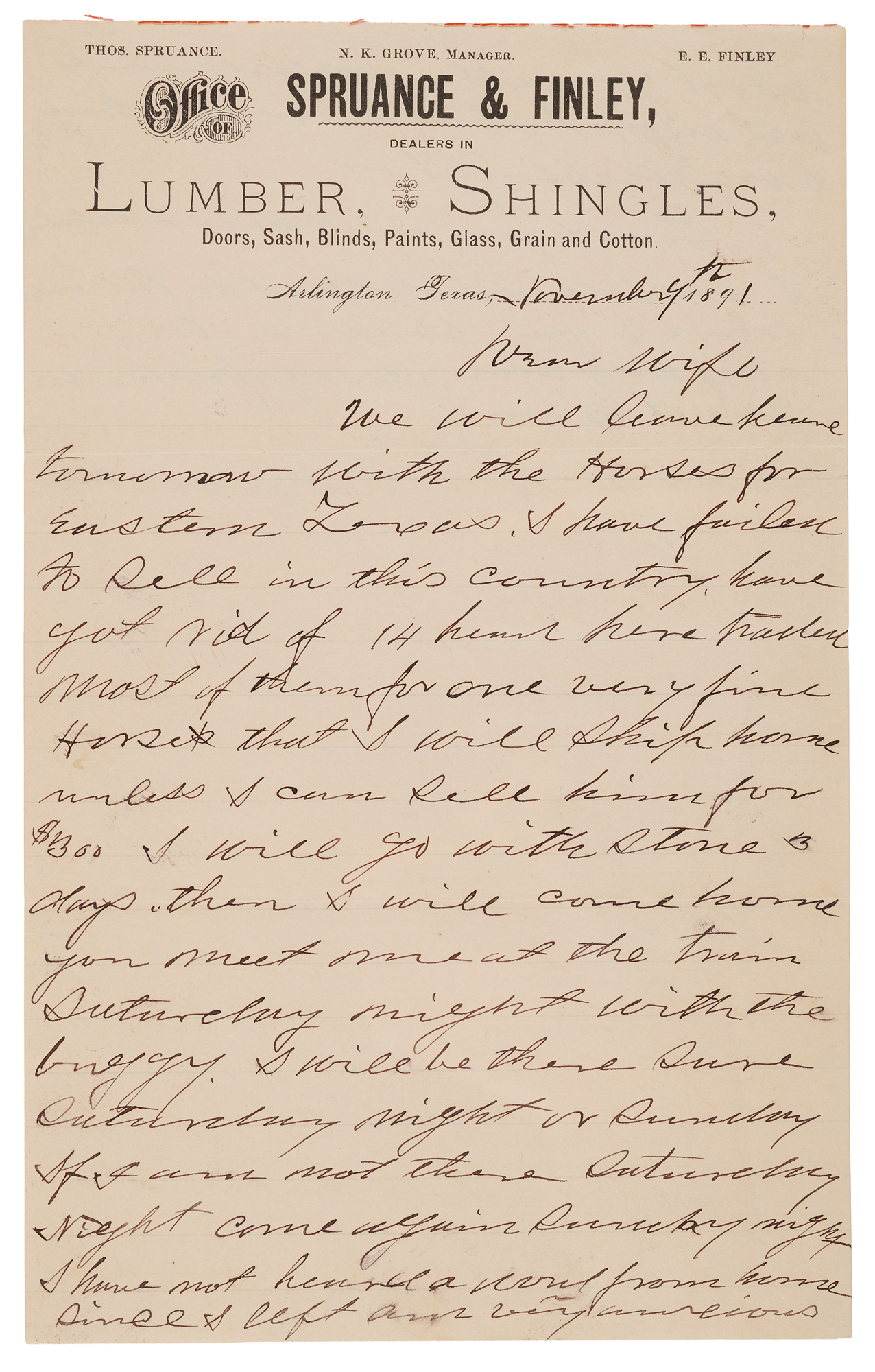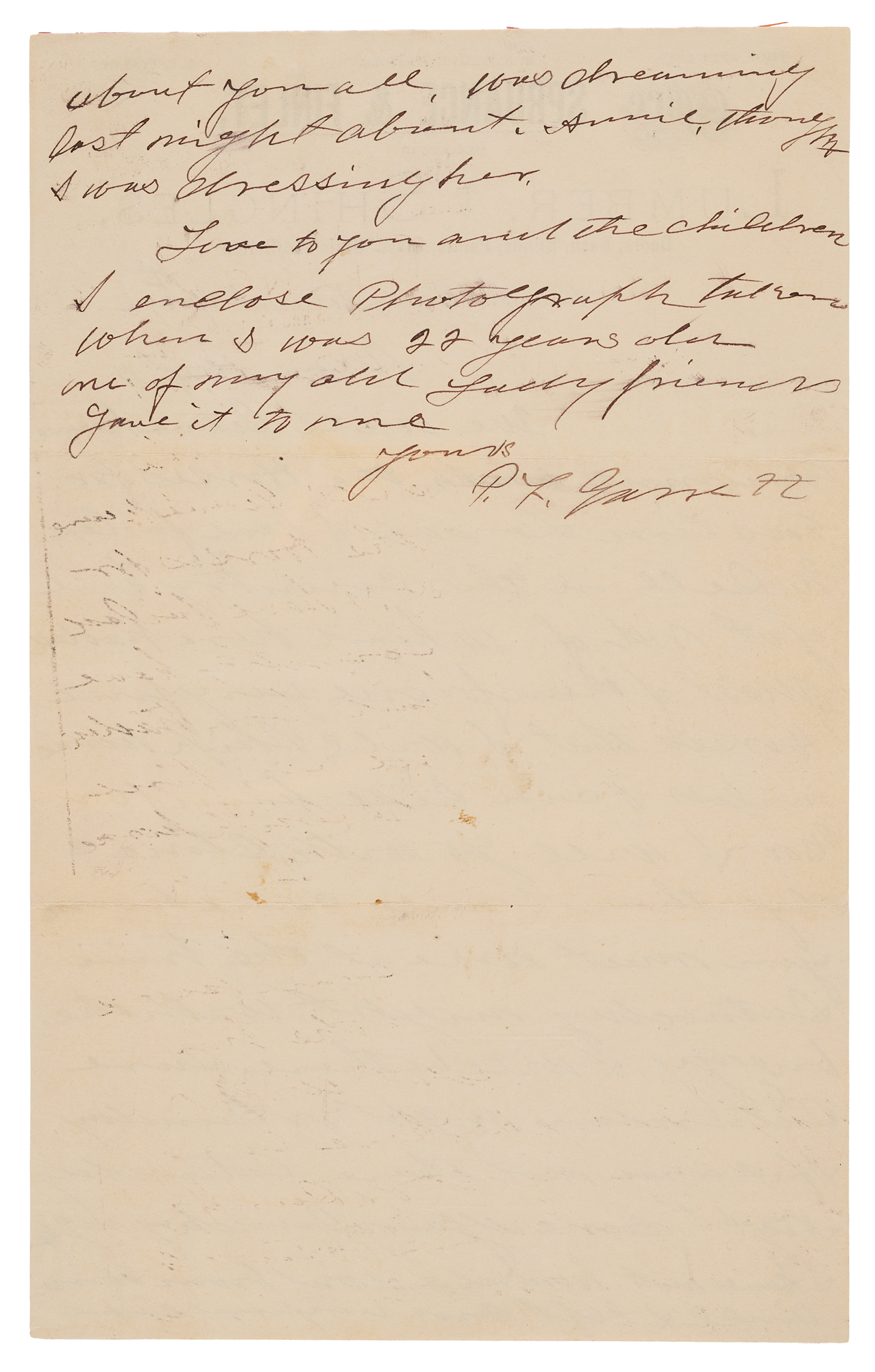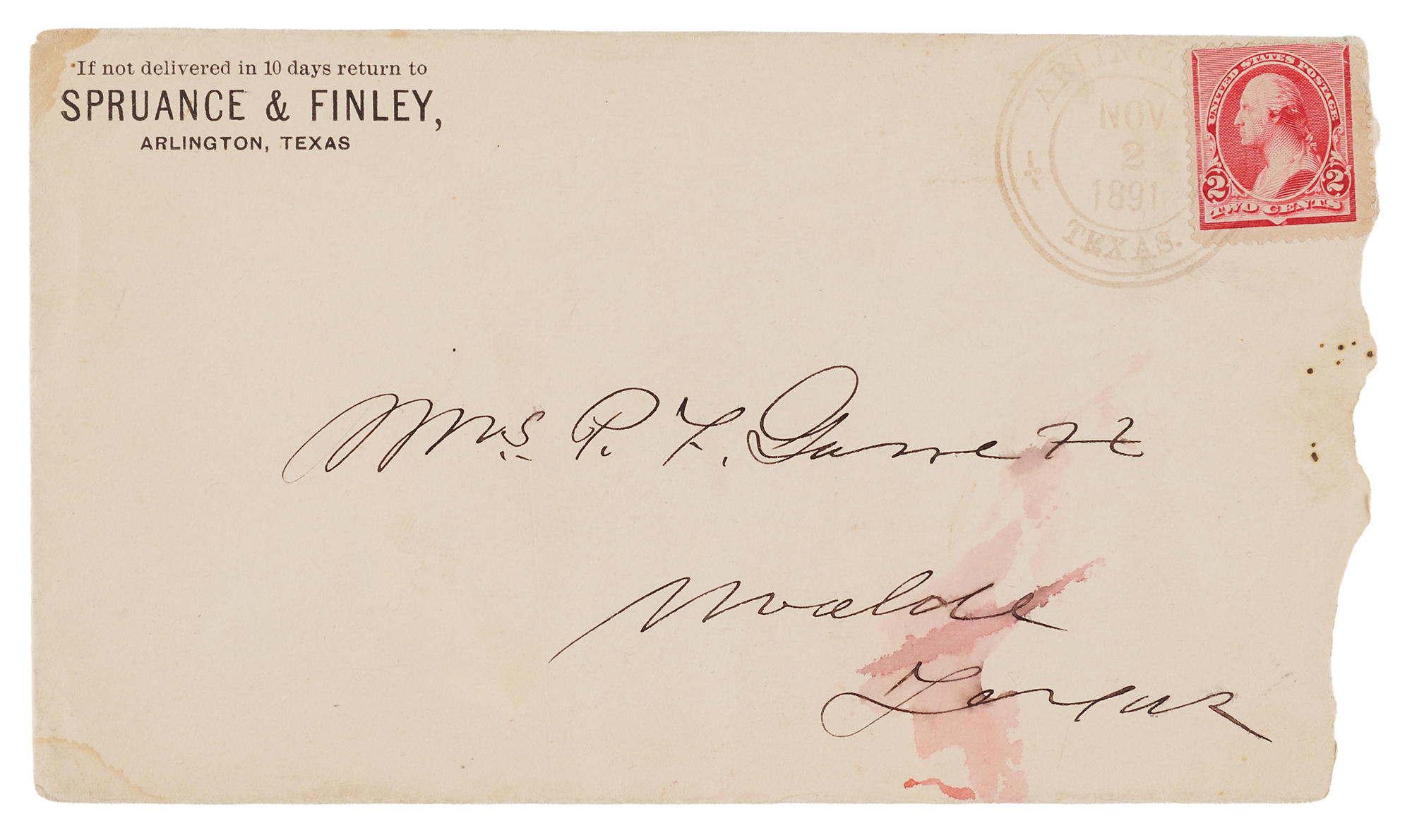 New Mexico lawman (1850–1908) famed for killing his former gambling partner, the fabled outlaw Billy the Kid, in 1881. ALS signed “P. F. Garrett,” one page both sides, 5.75 x 9.5, Spruance & Finley letterhead, November 4, 1891. Handwritten letter to his wife, in full: "We will leave home tomorrow with the Horses for Eastern Texas. I have failed to sell in this country, have got rid of 14 head here traded most of them for one very fine Horse that I will ship home unless I can sell him for $300 I will go with Stone 3 days, then I will come home you meet me at the train Saturday night with the buggy. I will be there sure Saturday night or Sunday. If I am not there Saturday night come again Sunday night I have not heard a word from home since I left am very anxious about you all. Was dreaming last night about, Annie, thought I was dressing her. Love to you and the children I enclose Photograph taken when I was 22 years old one of my old Lady friends gave it to me." In fine condition. Accompanied by the original mailing envelope, addressed in Garrett's hand to "Mrs. P. F. Garrett, Uvalde, Texas."