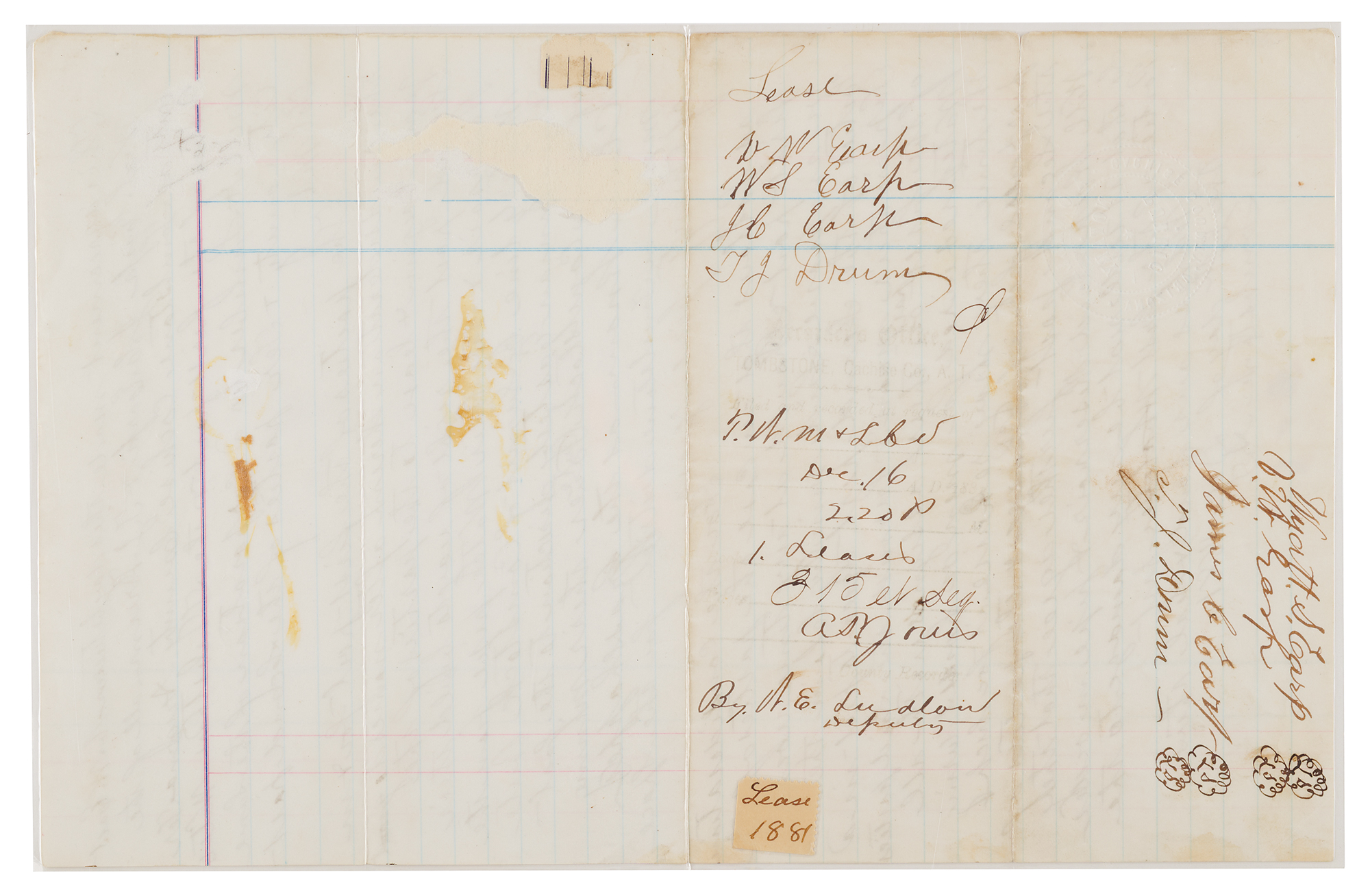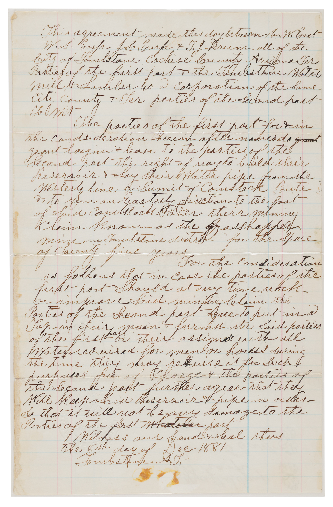 - Manuscript DS, signed "Wyatt S. Earp," "V. W. Earp," "James C. Earp," and "T. J. Drum," one page both sides, 8 x 12.5, December 8, 1881. In part: "This agreement made this day between V. W. Earp, W. S. Earp, J. C. Earp, & T. J. Drum all of the City of Tombstone, Cochise County, Arizona Ter., Parties of the first part & the Tombstone Water Mill & Lumber Co., a corporation of the same city…The parties of the first part for & in consideration herein after named do grant, bargain & lease to the parties of the second part the right of way to build their reservoir & say their water pipe from the westerly line…over their mining claim known as the Grasshopper mine in Tombstone district." Signed on the reverse in ink by the four parties of the first part, and embossed with the seal of notary A. O. Wallace.