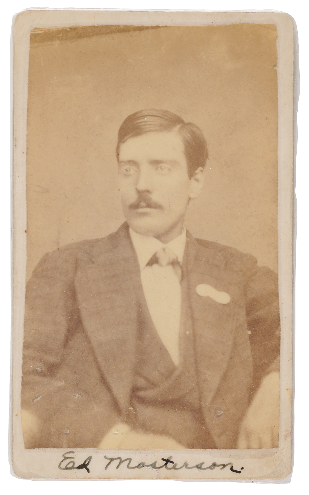 - Original 2.5 x 4 carte-de-visite portrait of lawman Ed Masterson, the older brother of famed gunfighters Bat Masterson and James Masterson, showing him in a suit and tie, with an identification notation inked on the mount. The reverse bears the imprint of "W. B. Critchfield, Photographer, Chariton, Iowa."