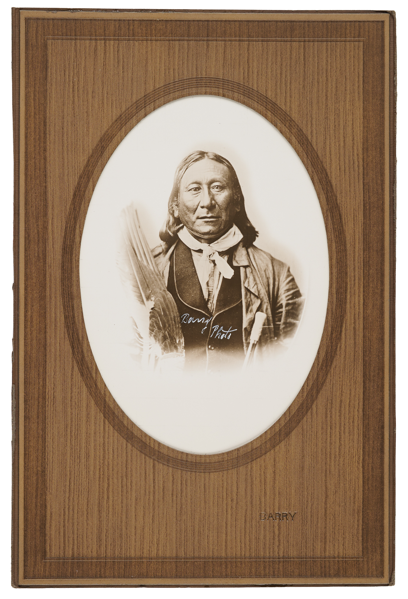 Oglala Lakota leader (1836–1893) known as Tasunka Kokipapi or They Fear Even His Horses, but commonly mistranslated as 'Young Man Afraid of His Horses,' remembered for his participation in Red Cloud's War, as a negotiator for the Sioux Nation after the Wounded Knee Massacre, and for serving on delegations to Washington, D.C. Original semi-glossy 4.5 x 6.5 silver gelatin photo of Oglala Lakota leader Young-Man-Afraid-Of-His-Horses, taken circa 1884 by David Francis Barry, a pioneering photographer of the American West, housed in its original 7 x 10.5 studio mat, signed in white ink, "Barry Photo," with "Barry" blindstamped on the mat, and a credit label affixed to the reverse: "D. F. Barry, Photographs of All Noted Indian Chiefs, Photographer, 1312 Tower Ave., Superior, Wisconsin." In fine condition, with a light crosshatch grid pattern to the emulsion.