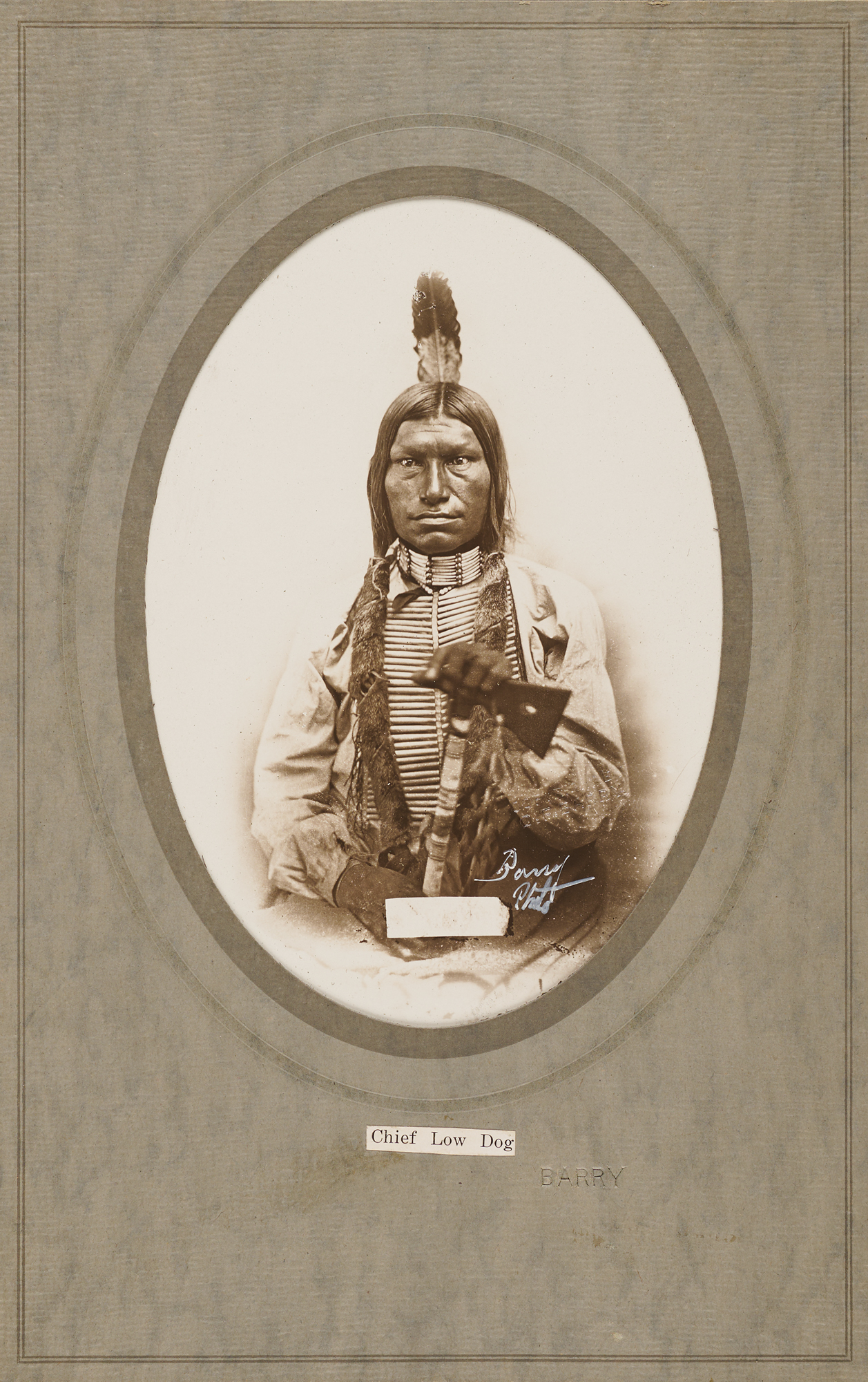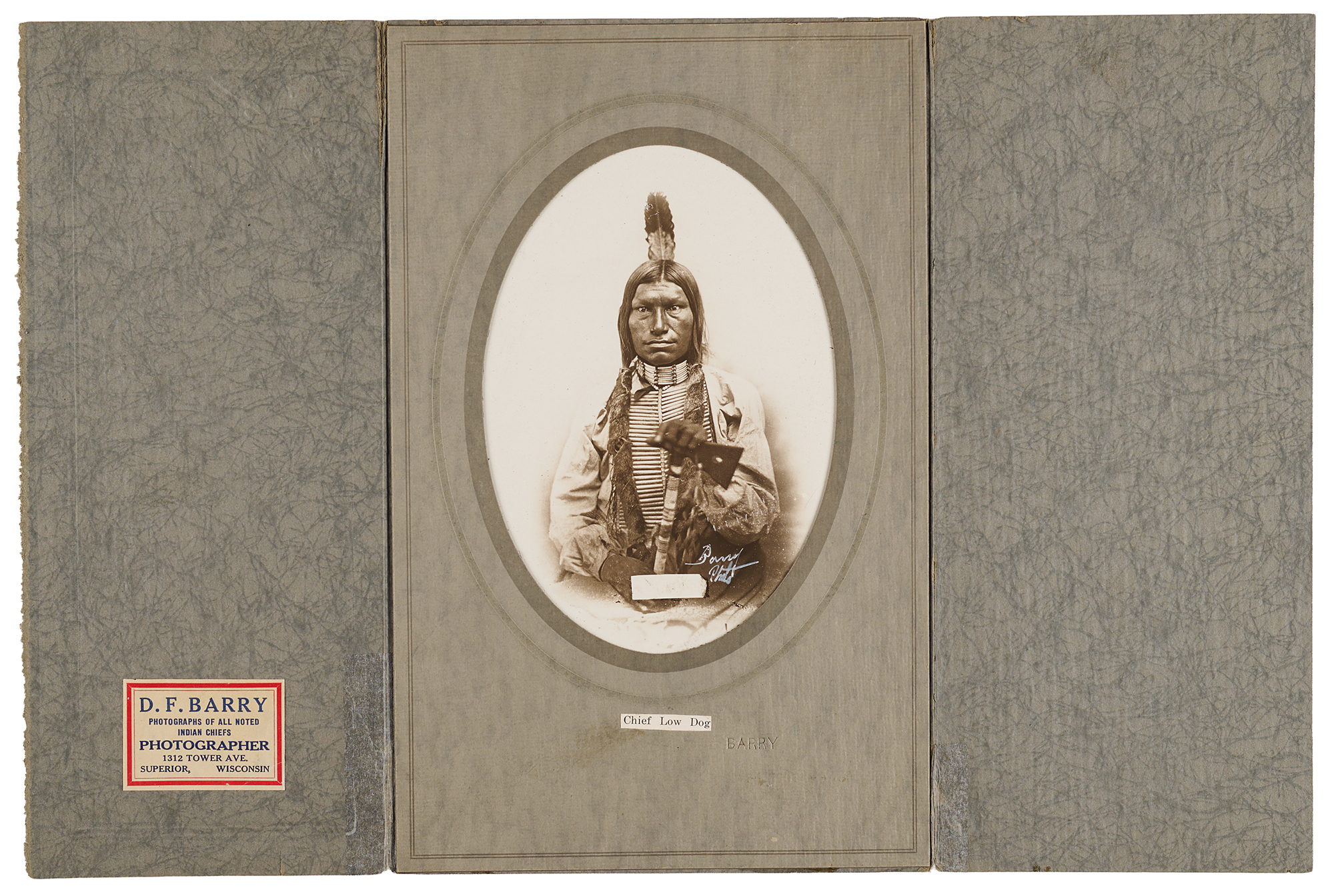 Original semi-glossy 4.5 x 6.5 silver gelatin photo of Oglala Lakota chief Low Dog by David Francis Barry, a pioneering photographer of the American West, housed in its original 7 x 11 studio folder, signed in white ink, "Barry Photo," with "Barry" blindstamped on the mount and a biographical blurb affixed on the reverse. Low Dog is shown in his full Native American regalia, topped by a single feather in his hair, with tomahawk in hand. The blurb on the reverse describes D. F. Barry as a "Photographer of Noted Indians," and thus describes Low Dog: "A Member of Chief Gall's band of Indians…He had a very wicked face…In the Custer fight he worked hard to get credit for killing so many soldiers. At the agency…he was pointed out to the whites as a real bad Indian." In fine condition.