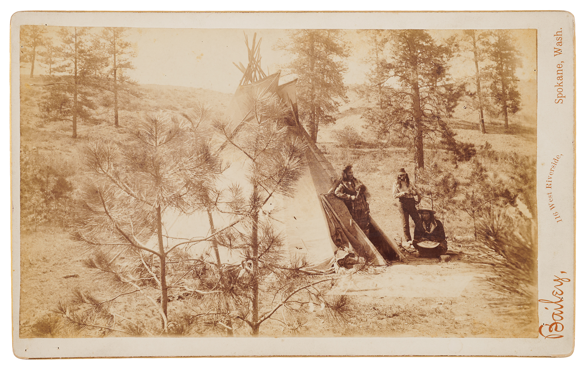 Sharp original 8.5 x 5.25 boudoir cabinet photo of three Native American Indian braves outside a tipi in a gently sloping, pine-covered plain in the Pacific Northwest, imprinted on the mount: "Bailey, 116 West Riverside, Spokane, Wash." The composition feels staged but natural—typical of ethnographic or documentary photography of the era—balancing the tipi, figures, and surrounding landscape to present a composed view of daily life. In fine condition.