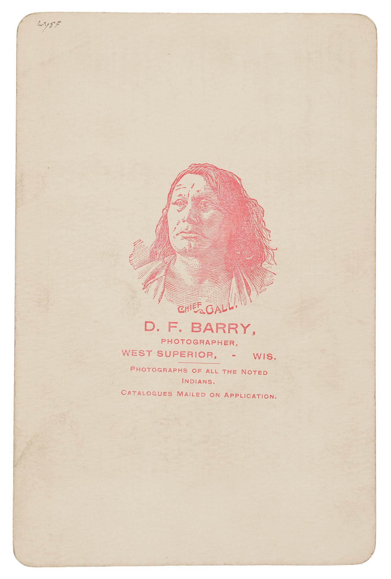 Crystal-clear original 4.25 x 6.5 cabinet photo of Arikara scout Goose, shown in profile, facing left, with a composed, dignified expression, as captured by David Francis Barry, a pioneering photographer of the American West. Goose's hair is parted and wrapped in fur, beaded necklaces cascade across his chest, and he holds a catlinite pipe and decorative tamper. Imprinted on the mount: "D. F. Barry, West Superior, Wis.," with Barry's likeness of Chief Gall illustrated on the reverse, along with an advertisement for "Photographs of All the Noted Indians." In fine condition.