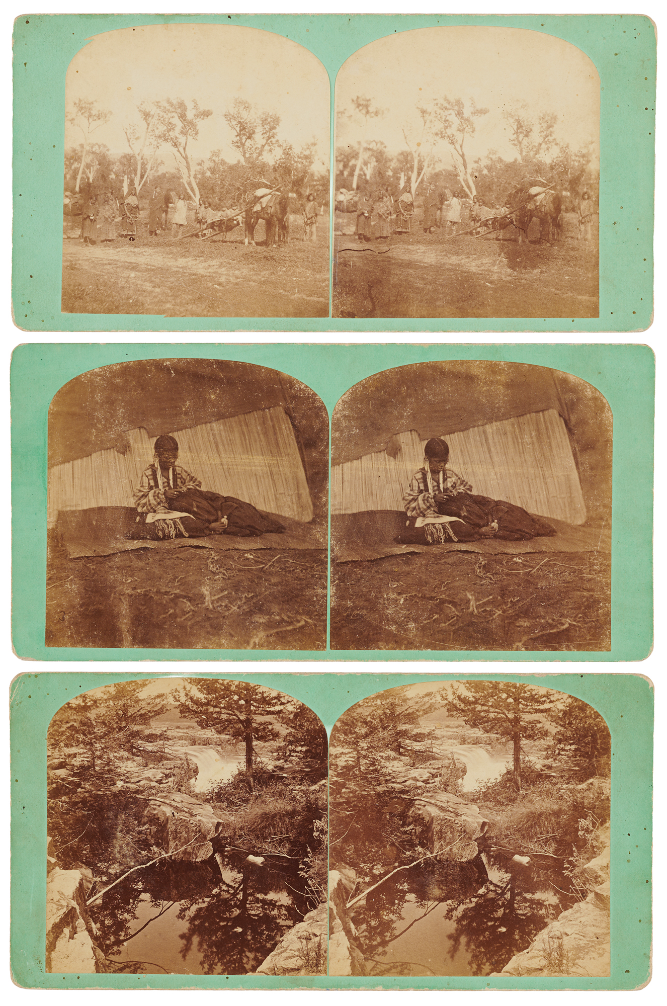 Three original 7 x 3.5 stereoview photographs of Sioux Indians and their territory, including scenes of a young woman either braiding hair or combing for lice ("Showing they way the Indians catch 'em"), a group of them traveling with a pack horse ("Sioux moving"), and a lovely landscape view of Sioux Falls ( "Sioux Falls 90 miles above Sioux City"). All are captioned and signed on the reverse in ink by the original collector, "P. T. Buckley." In overall fine condition.
