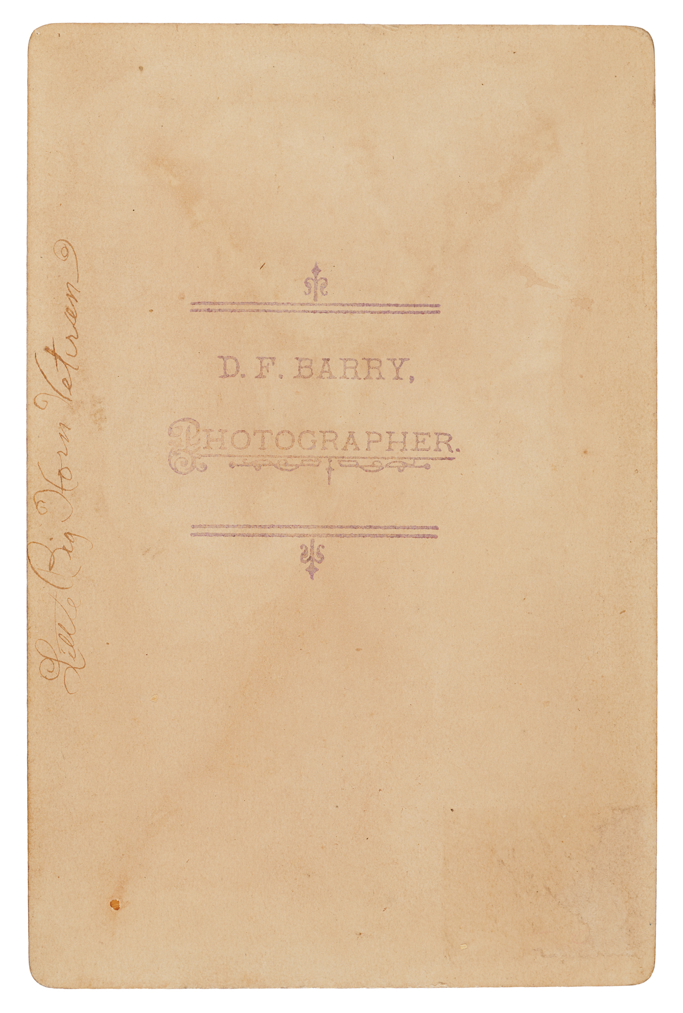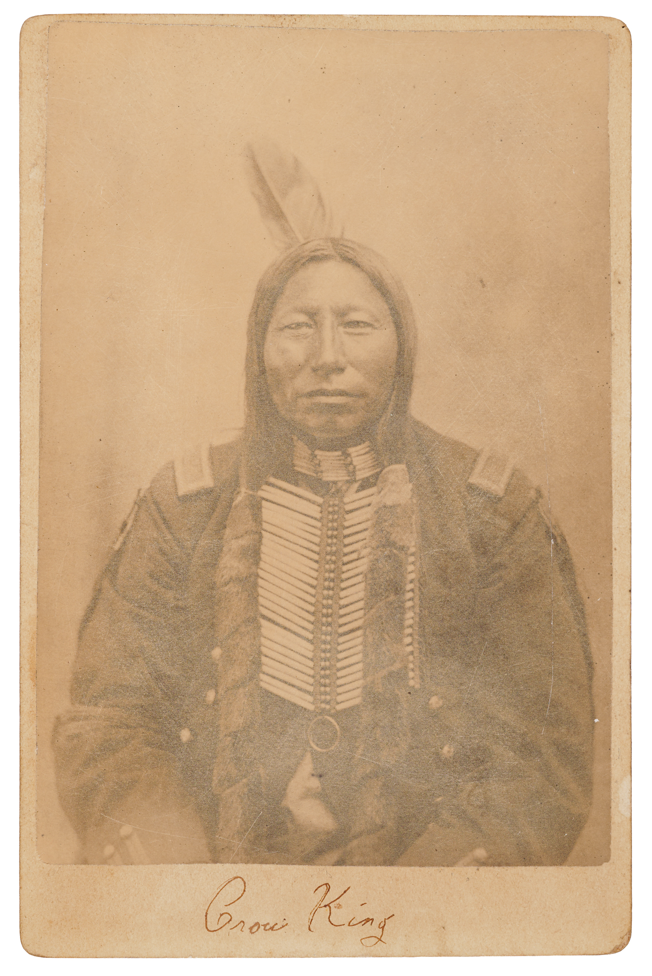Original 4.25 x 6.5 cabinet photo of Crow King, also known as Medicine Bag That Burns, in a stoic, front-facing pose, wearing a bone hairpipe breastplate beneath a U.S. Army–issue coat, with a single feather in his hair, taken circa 1880 by David Francis Barry, a pioneering photographer of the American West. Identified on the mount in ink, "Crow King," and further annotated on the reverse, "Little Big Horn Veteran." Also stamped on the reverse in ink, "D. F. Barry, Photographer." In fine condition, with very slight fading and soiling.
