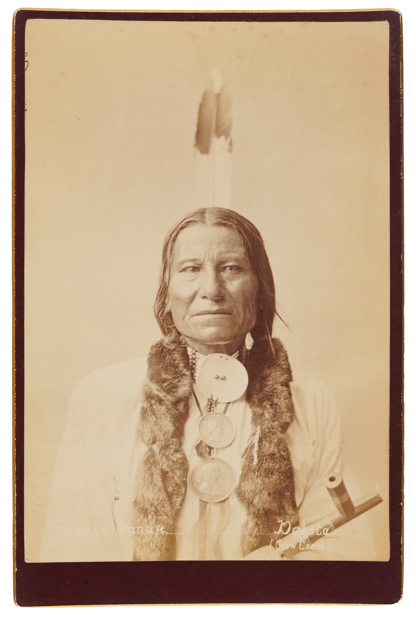 Original 4.25 x 6.5 cabinet photo of Tatanka Wanaghi, also known as Buffalo Bull Ghost, in a stoic, front-facing pose, wearing two peace medals, braids wrapped in fur, and a single eagle feather in his hair. Identified within the image: "Tatanka Wanayi, Dakota, (Crow Creek)." In very fine condition.