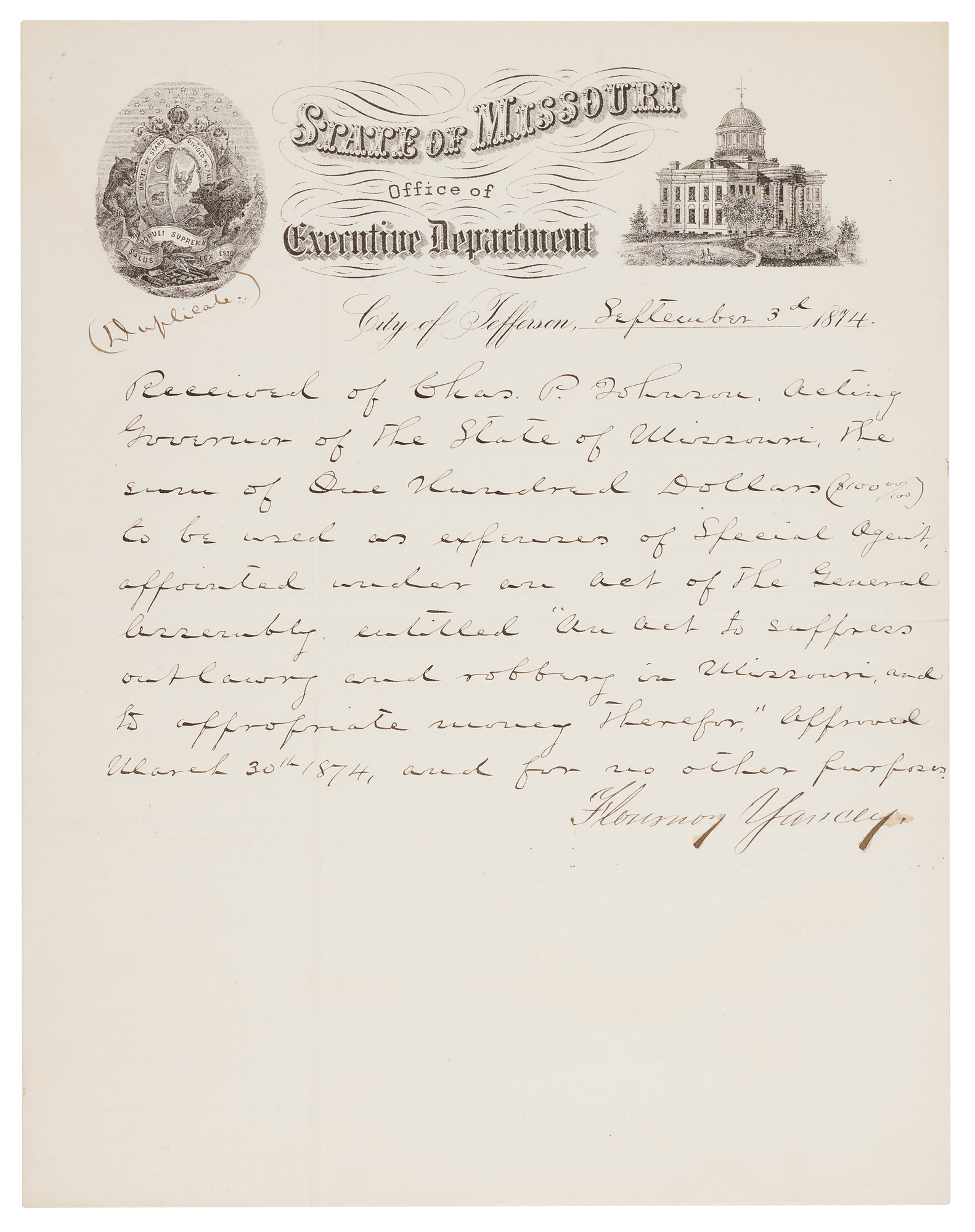 Manuscript DS, signed “Flournoy Yancey,” one page, 8.5 x 11, September 3, 1874. Issued in Jefferson City, a confirmation of receipt for government funds tied to anti-outlaw operations in Missouri, in full: “Received of Chas. P. Johnson, Acting Governor of the State of Missouri, the sum of One Hundred Dollars ($100) to be used as expenses of Special Agent, appointed under an act of the General Assembly, entitled ‘An Act to suppress outlawry and robbing in Missouri, and to appropriate money therefor.’ Approved March 30th 1874, and for no other purposes.” Signed at the conclusion by Flournoy Yancey. Includes a light green ‘State of Missouri’ envelope bearing a signed note from Charles P. Johnson, “Receipt of Flourney [sic] Yancey for $100 – Paid for secret service duty - Johnson.” In fine condition.