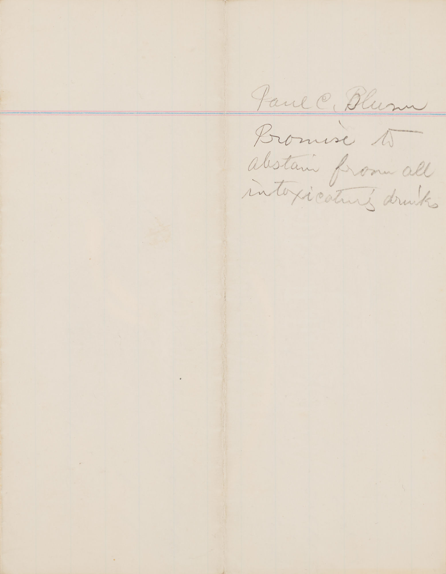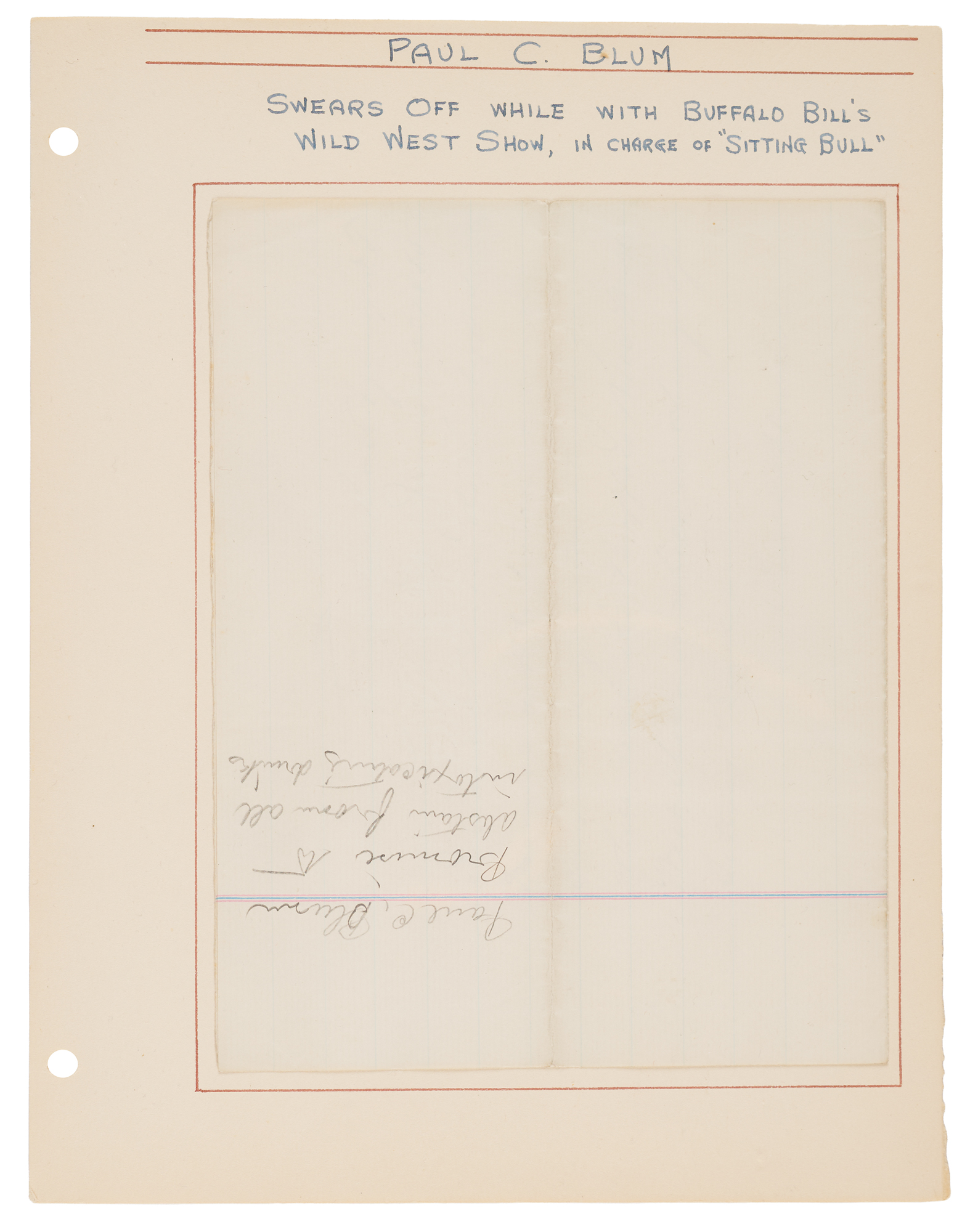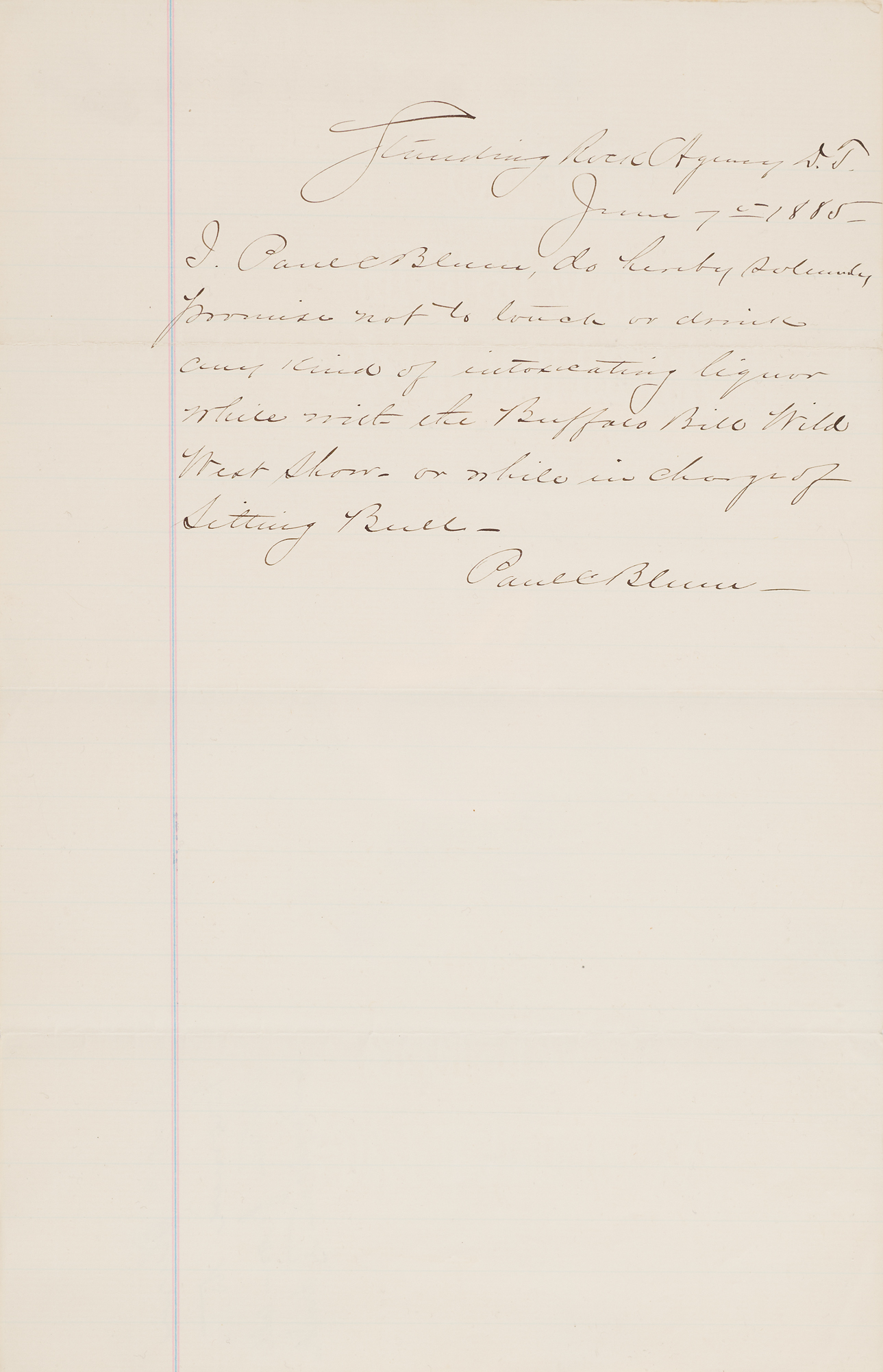 Scarce autograph document signed twice as “Paul C. Blum,” one page, 8 x 12.5, June 7, 1885. Submitted from the “Standing Rock Agency” in Dakota Territory, a handwritten statement from Blum vowing to abstain from drink while in the employment of William F. Cody, in full: “I, Paul C. Blum, do solemnly promise not to touch or drink any kind of intoxicating liquor while with the Buffalo Bill Wild West Show, or while in charge of Sitting Bull.” Signed at the conclusion by Blum. The reverse of the top edge is affixed to an 8.5 x 11 album page. In fine condition.