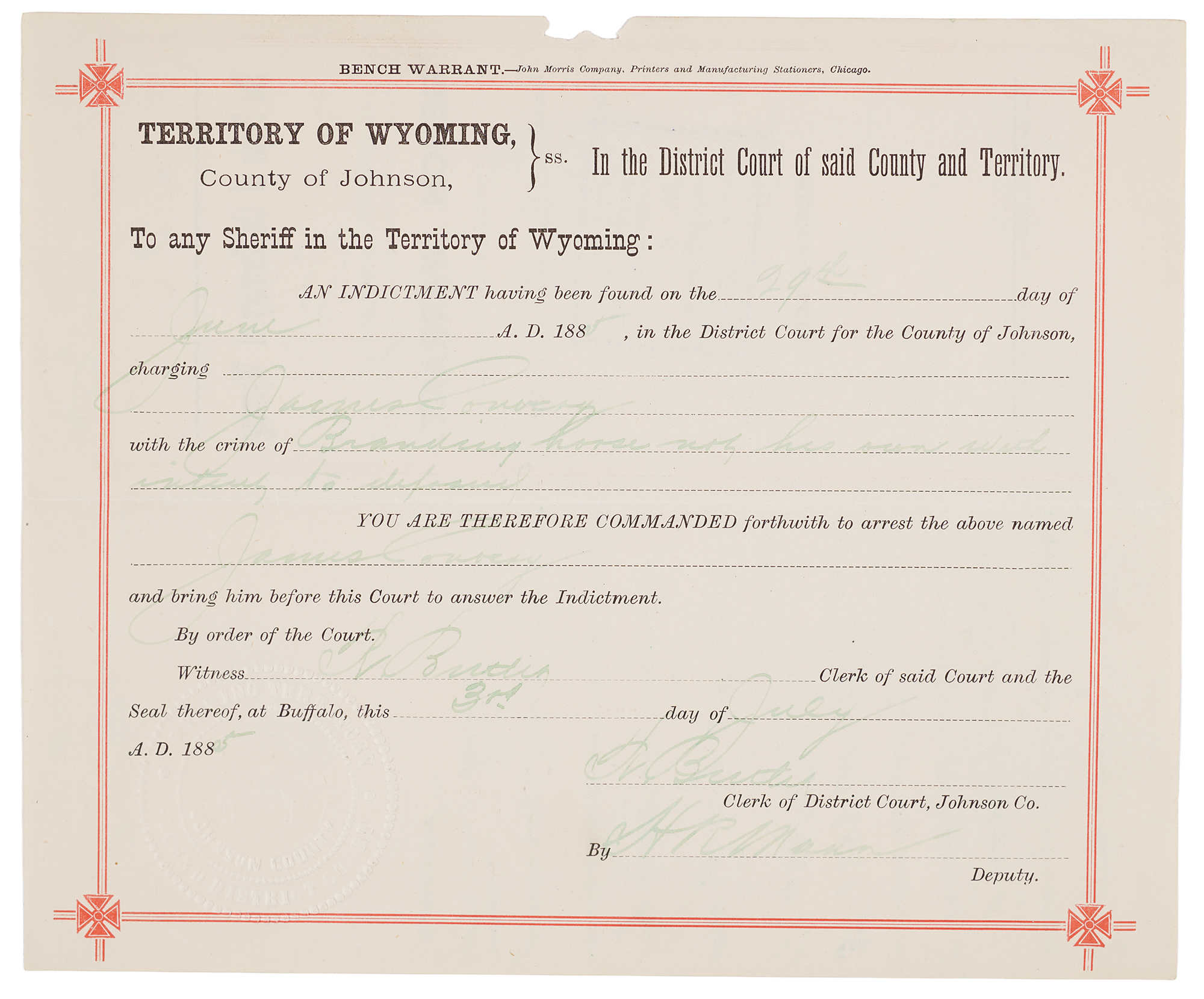 DS, one page, 8.25 x 7, July 3, 1885. County of Johnson bench warrant issued to “any Sheriff in the Territory of Wyoming,” related to an indictment charging “James Cannery with the crime of Branding horse not his own with intent to defraud.” Signed at the conclusion by H. R. Mann as the deputy of Johnson County. In fine condition.