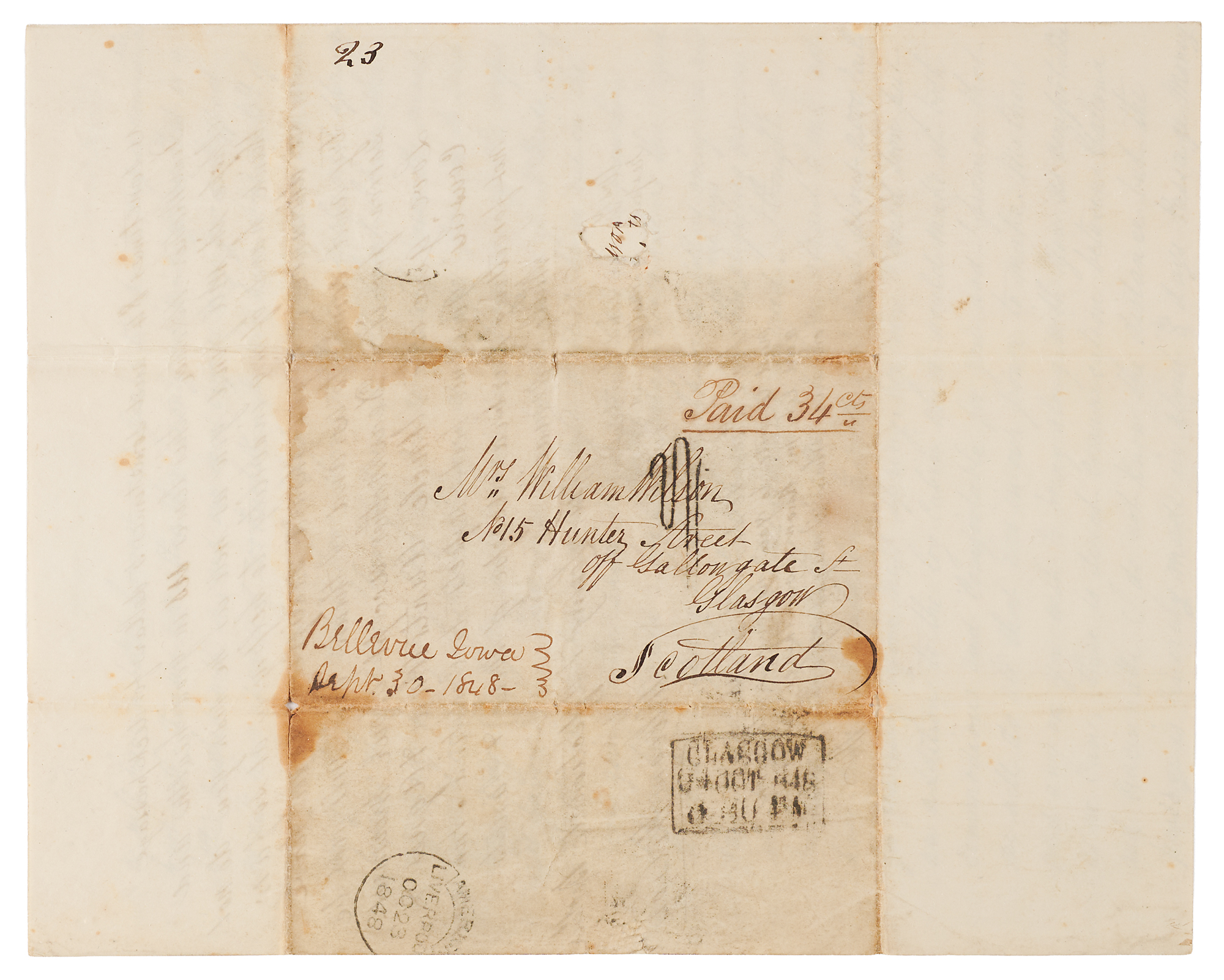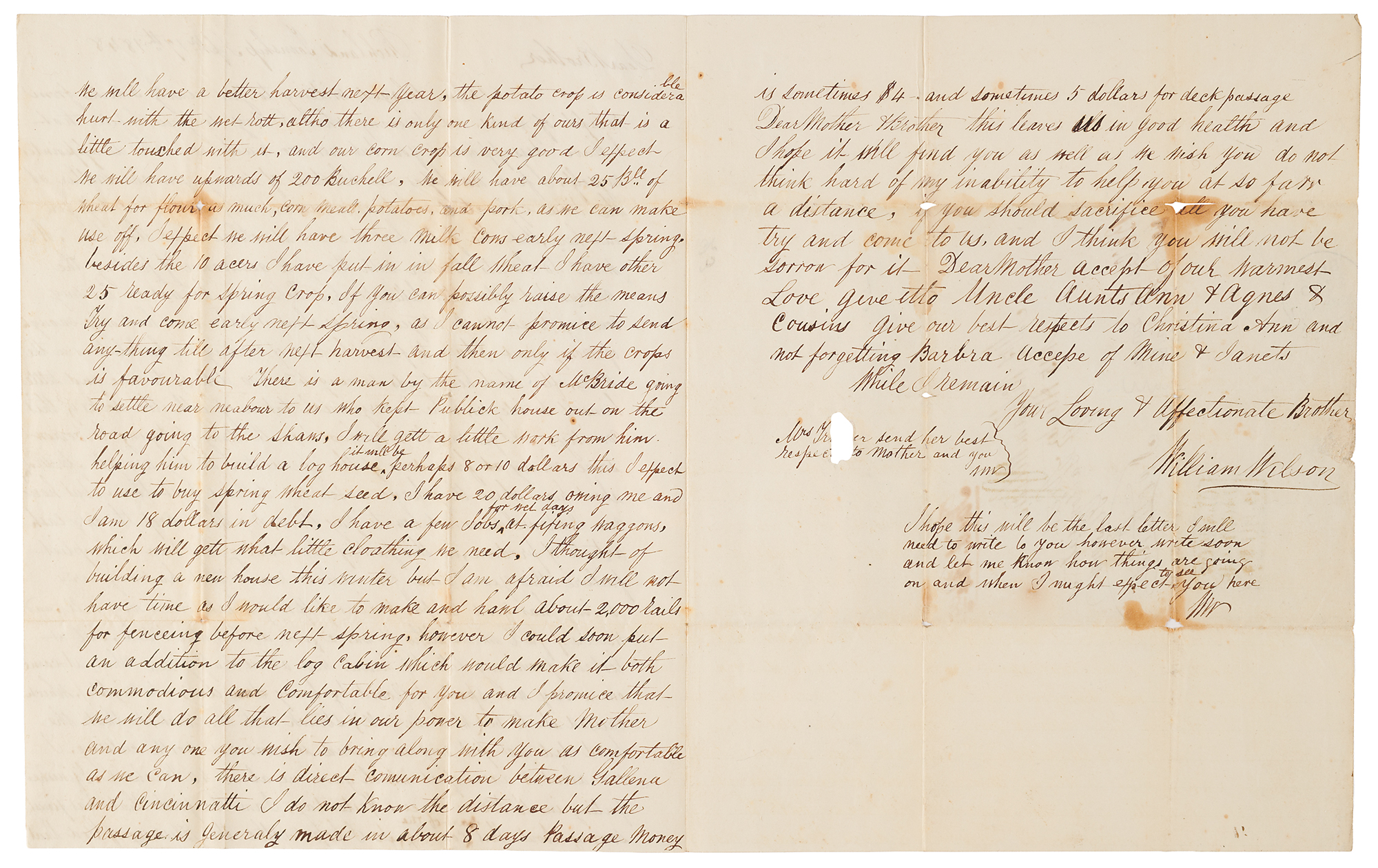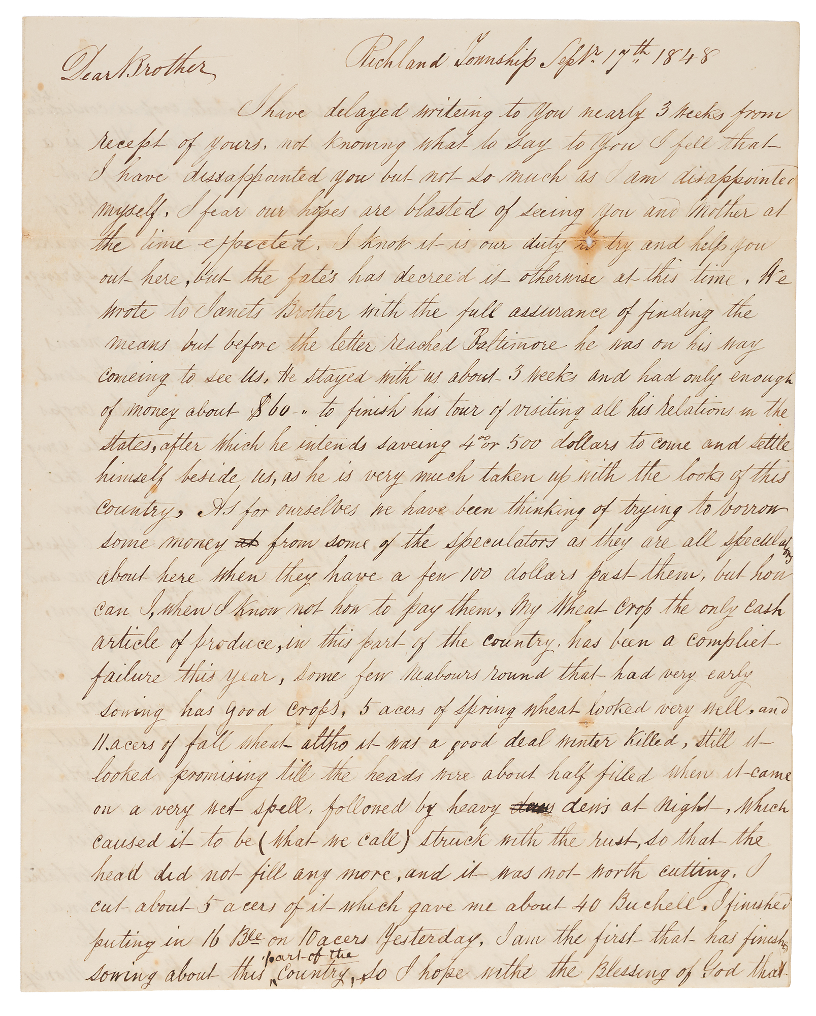 ALS, three pages on two adjoining sheets, 7.75 x 10, September 17, 1848. Addressed from Richland Township, Pennsylvania, a handwritten letter from William Wilson, an agent for the milling firm of Hoover and Frick, sent to his brother in Glasgow, Scotland, in part (spelling and grammar retained): “My wheat crop, the only cash article of produce, in this part of the country, has been a compliet failure this year, some few hundred neabors round that had very early sowing has good crops, 5 acers of spring wheat looked very well, and 11 acers of fall wheat altho it was a good deal winter killed, still it looked promising till the heads were about half filled when it came on a very wet spell, followed by heavy dews at night, which cause it to be (what we call) struck with the rust, so that the head did not fill any more, and it was not worth cutting. I cut about 5 acers of it, which gave me about 10 buchell. I finished puting in 16 Ble on 10 acers yesterday. I am the first that has finished sowing about this part o the country, so I hope in the Blessing of God that we will have a better harvest next year.” In very good to fine condition, with small stains, and small areas of paper loss, to the intersecting folds.