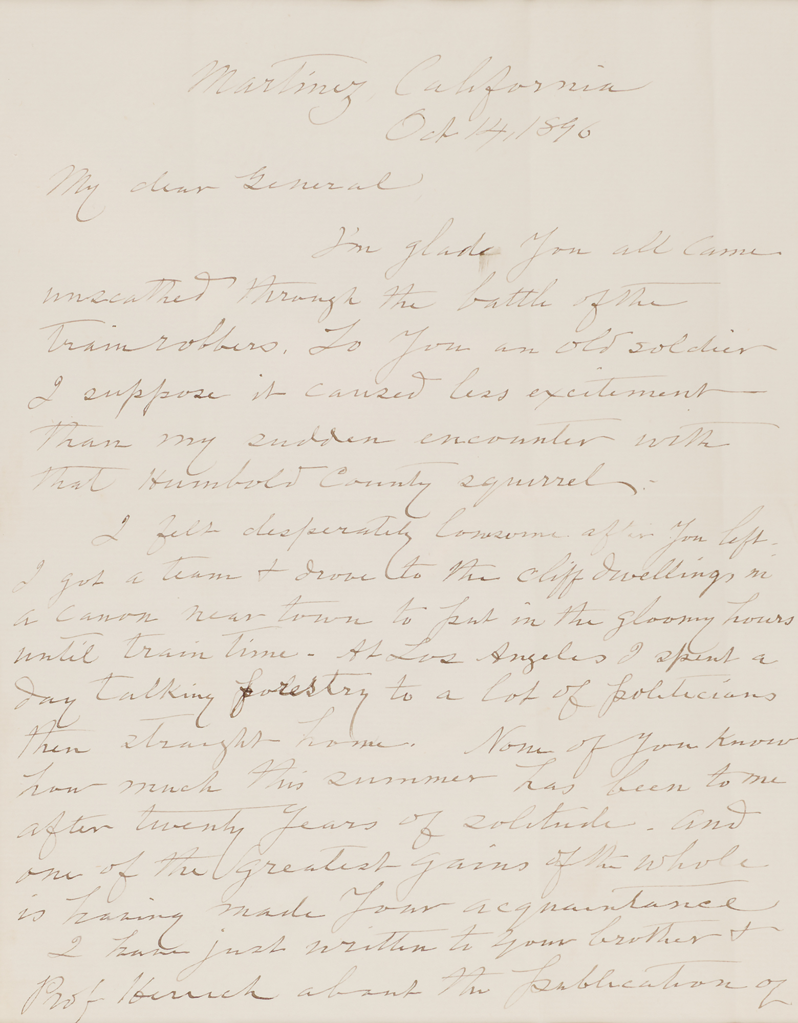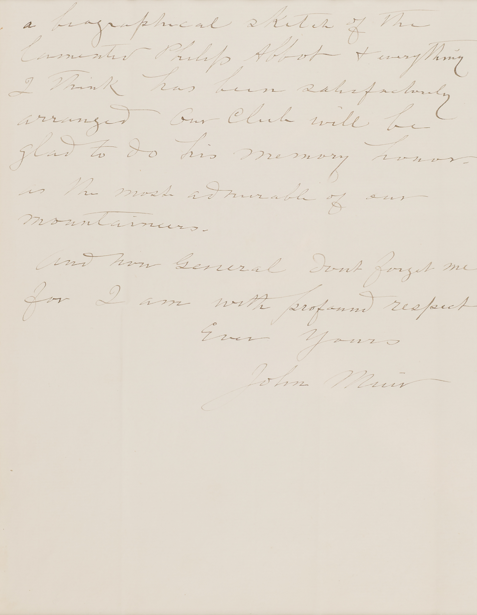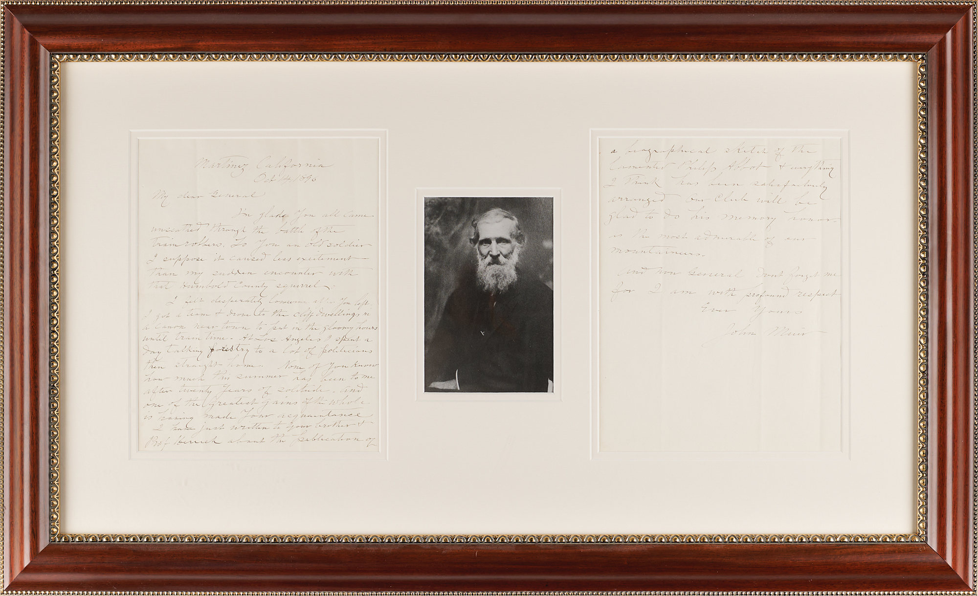 Naturalist and author (1838–1914) who helped establish Yosemite National Park. ALS, two pages, 8 x 10, October 14, 1896. Handwritten letter to General Henry L. Abbot, a surveyor and engineer who worked on the railroad through California and Oregon and later participated in the planning of the Panama Canal. In full: "I'm glad you all came unscathed through the battle of the trainrobbers. To you an old soldier I suppose it caused less excitement than my sudden encounter with that Humbold County squirrel. I felt desperately lonesome after you left. I got a team & drove to the cliff dwellings in a canon near town to put in the gloomy hours until train time. At Los Angeles I spent a day talking forestry to a lot of politicians then straight home. None of you know how much this summer has been to me after twenty years of solitude—and one of the greatest gains of the whole is having made your acquaintance. I have just written to your brother & Prof. Hirsch about the publication of a biographical sketch of the lamented Philip Abbot & everything I think has been satisfactorily arranged. Our Club will be glad to do his memory honor—as the most admirable of our mountaineers. And now general don't forget me." Double-matted and framed with a portrait to an overall size of 32.5 x 19.5. In fine condition.