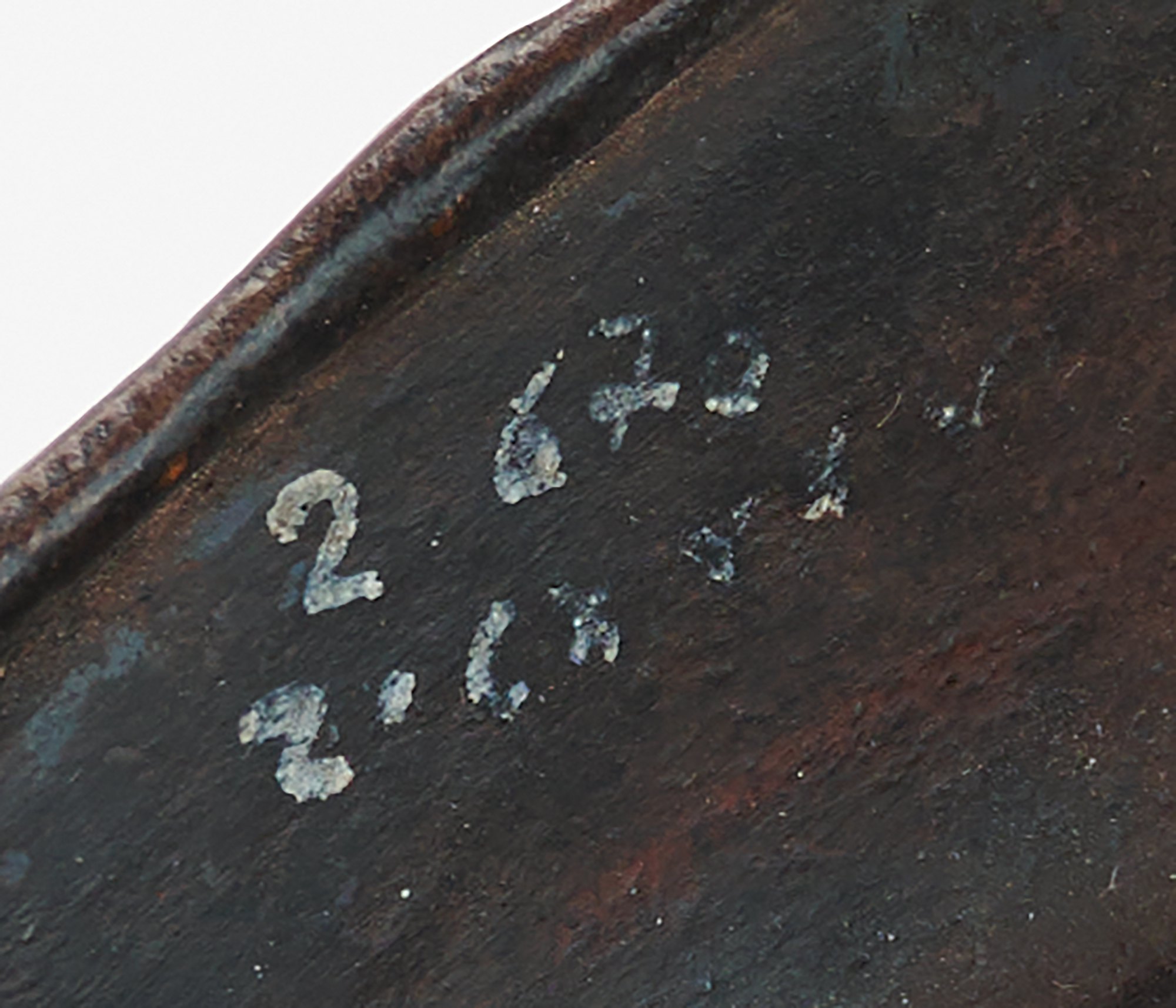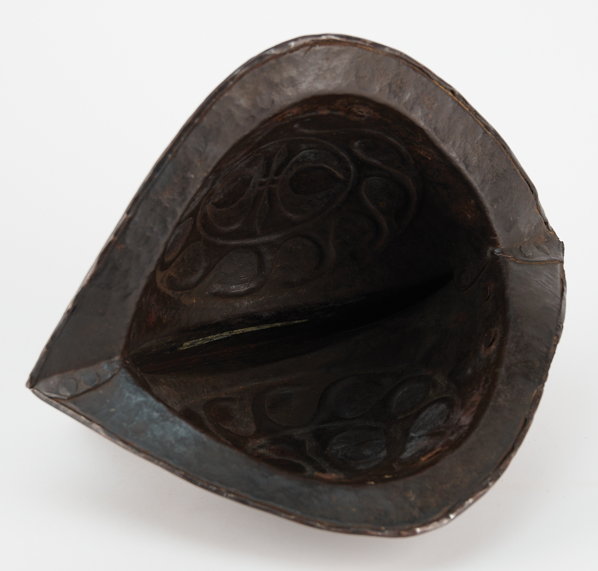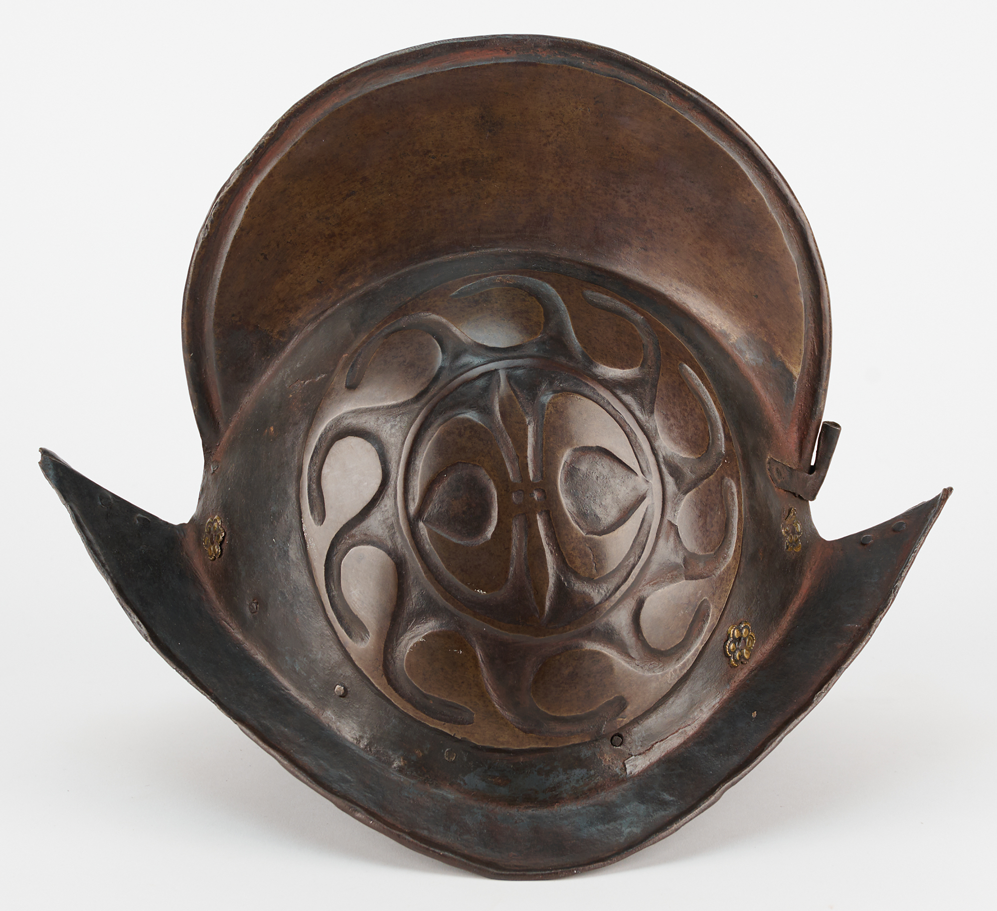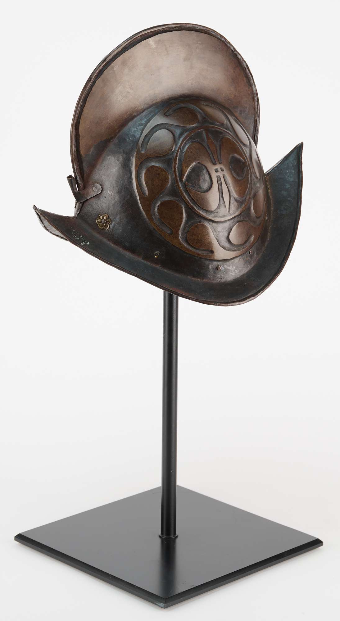 Spanish morion helmet, late 16th–early 17th century, measuring 14˝ x 12˝ x 11˝, constructed of forged iron or steel in classic form, with a high medial comb and broad upturned brim rising to pronounced points at the front and rear. The bowl is decorated with finely executed embossed ornament, centered by a circular cartouche and surrounded by flowing scrollwork motifs. The interior reveals the reverse of the repoussé decoration, with rivet holes at the base for the now-missing liner. The surface exhibits expected oxidation and wear consistent with age; the brim bears white ink notations. In fine condition, with evidence of polishing and restoration. Morions of this type were widely used by Spanish infantry, including soldiers active in the New World during the later phases of the conquistador period.
