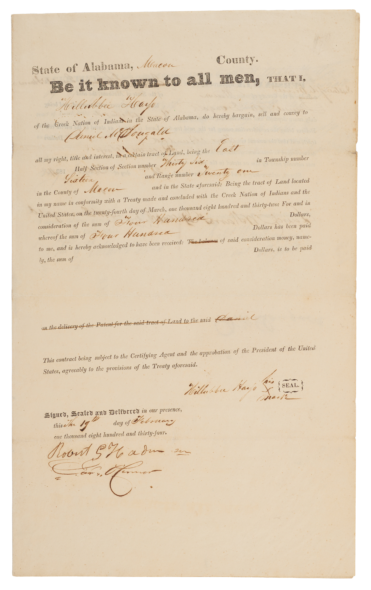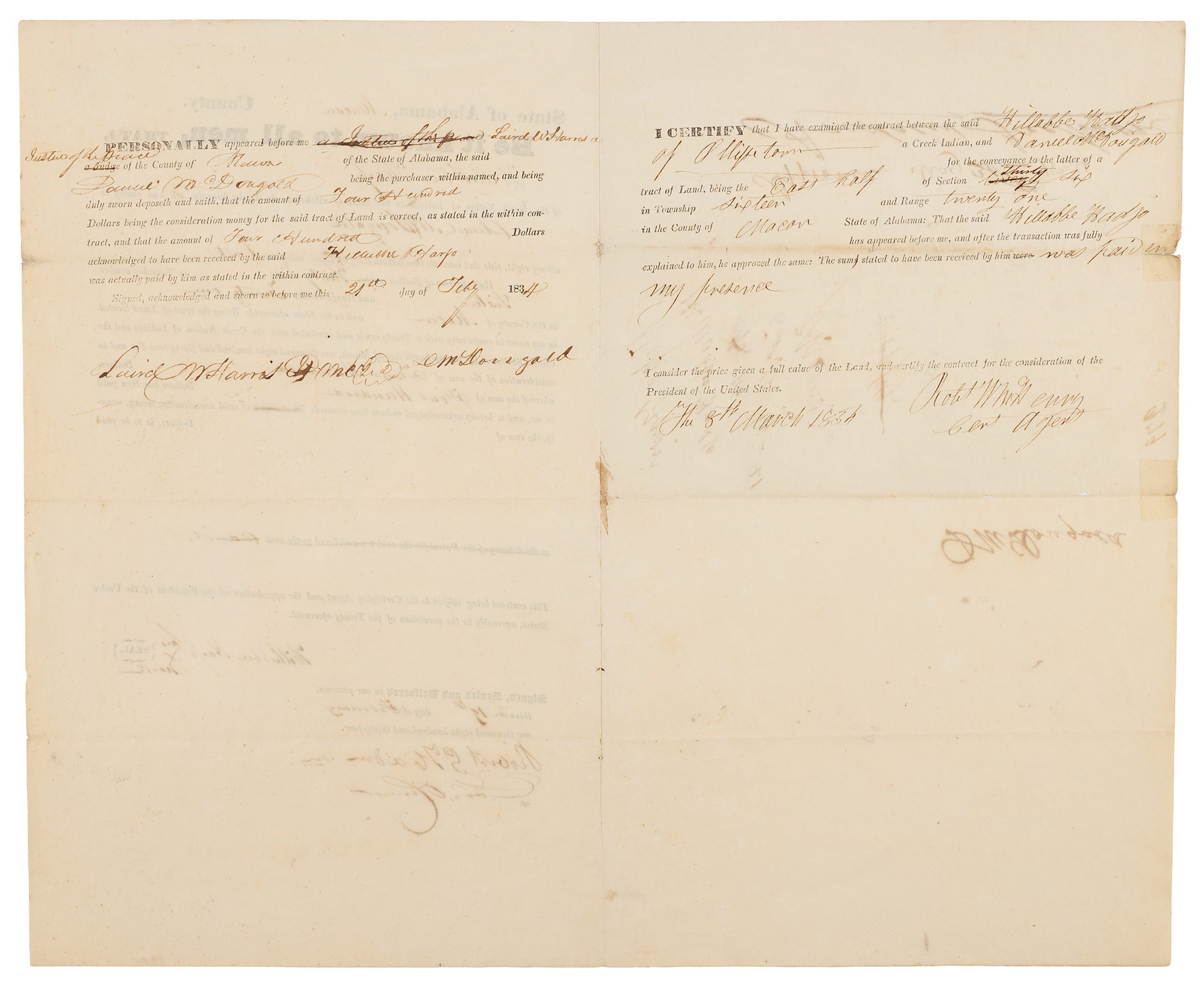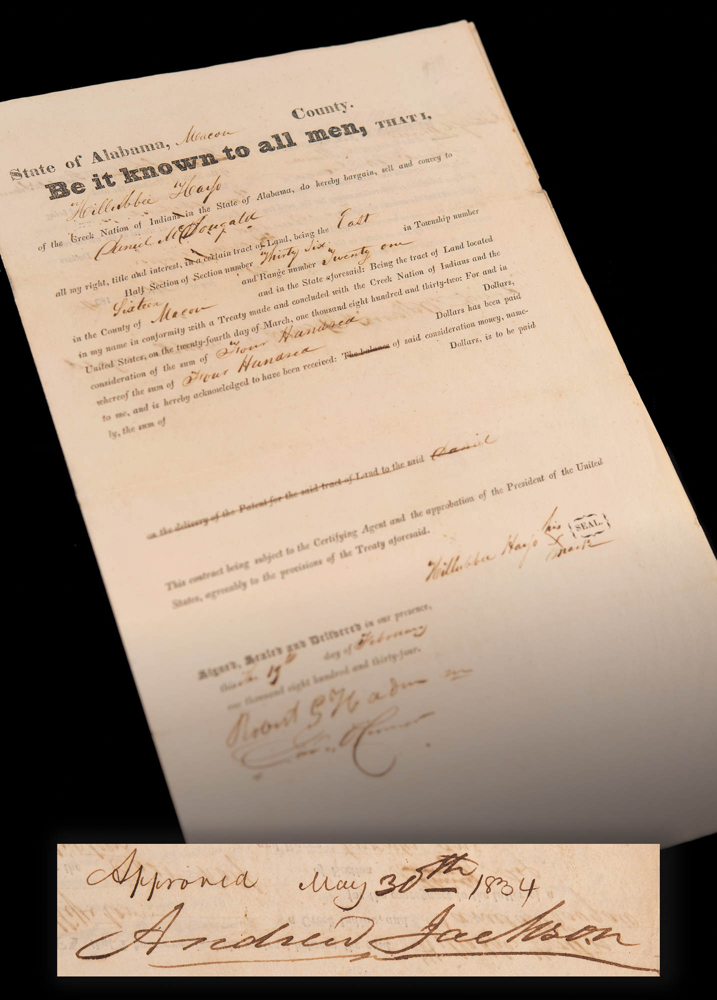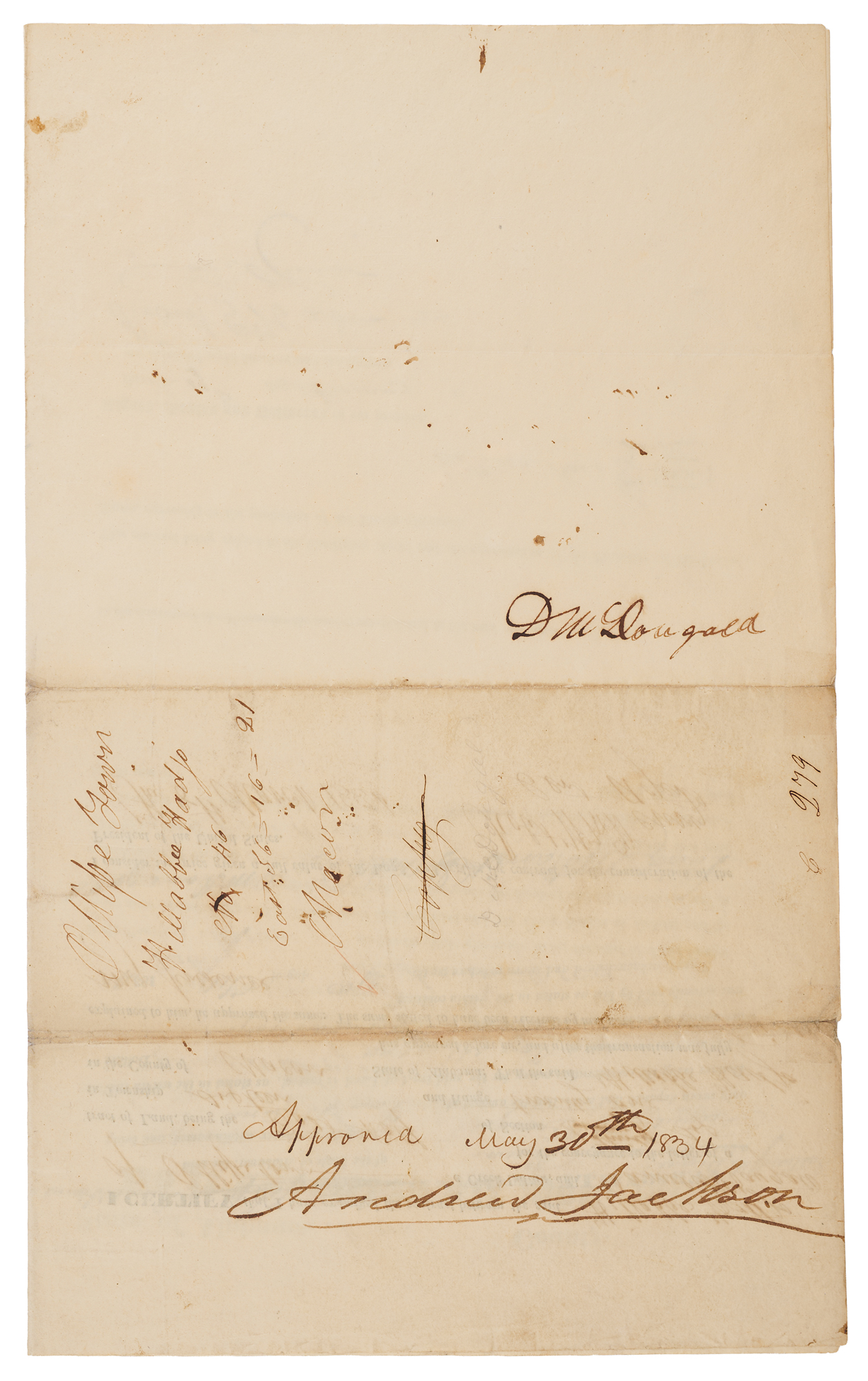 Endorsement signature as president, “Approved May 30th 1834, Andrew Jackson,” penned on the reverse of a partly printed document from the “State of Alabama, Macon County,” three pages on two adjoining sheets, 8 x 13, February 19, 1834, comprised of a land sale contract between seller Hillabee Harjo, “of the Creek Nation of Indians in the State of Alabama,” and buyer Daniel McDougald, with the former agreeing to sell his land for $400. McDougald and a certifying agent signing on the second and third pages, respectively.