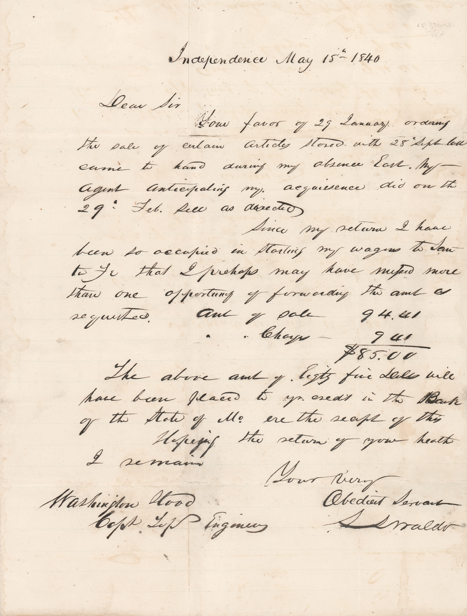 ALS, one page, 7.5 x 9.75, May 15, 1840. Addressed from Independence, Missouri, a handwritten letter to Washington Hood, captain of the Topographical Engineers, enclosing an auctioneer's bill of sale of public property left in his possession, in part: “Your favor of 29 January ordering the sale of certain articles stored with 28 Sept last came to hand during my absence East. My agent anticipating my acquiescence did on the 29th Feb. sell as directed. Since my return I have been so occupied in starting my wagons to Santa Fe that I perhaps may have missed more than one opportunity of forwarding the amt as requested.” Waldo calculates the total charge. “The above amt of Eighty five Dolls will have been placed to yr. credit in the Bank of the State of Mo. ere the receipt of this.” In very good to fine condition, with old tape repairs to the integral address leaf.