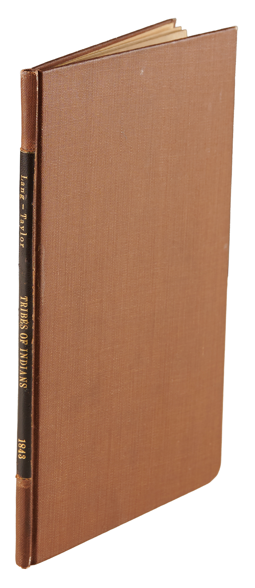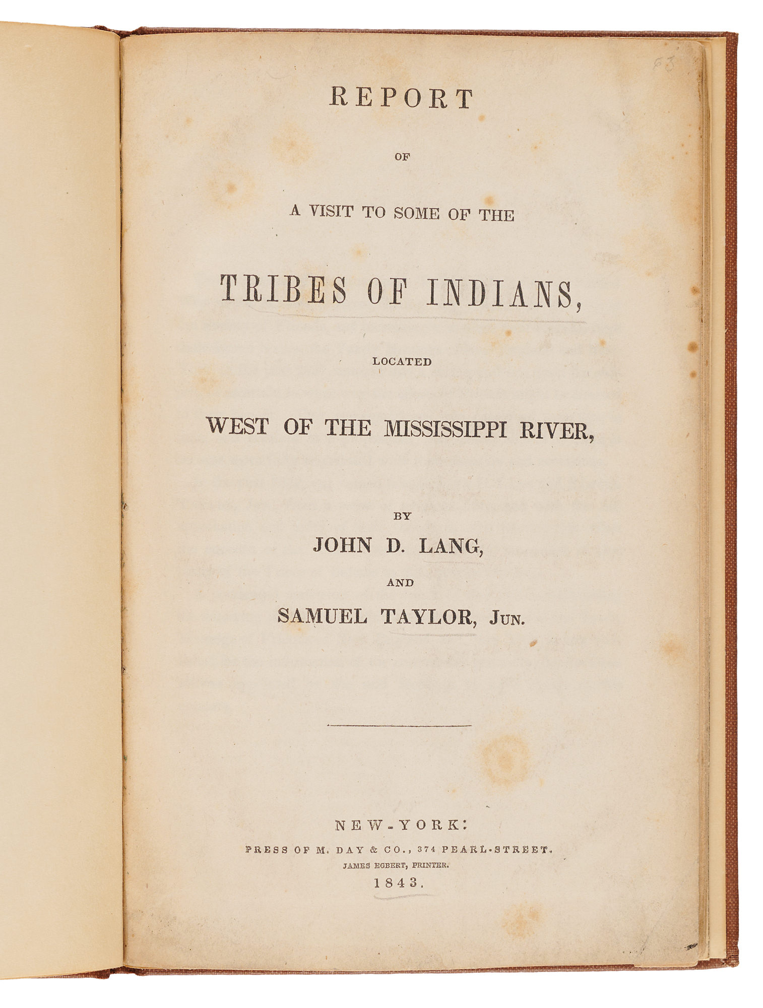 Scarce book: Report of a Visit to Some of the Tribes of Indians, Located West of the Mississippi River by John D. Lang and Samuel Taylor, Jr. First edition. NY: Press of M. Day & Co., 1843. Rebound hardcover in brown cloth boards, 5.5 x 8.5, 34 pages. Book condition: VG/None, rebound without its original brown printed wrappers and with some mottled foxing to the first few pages.