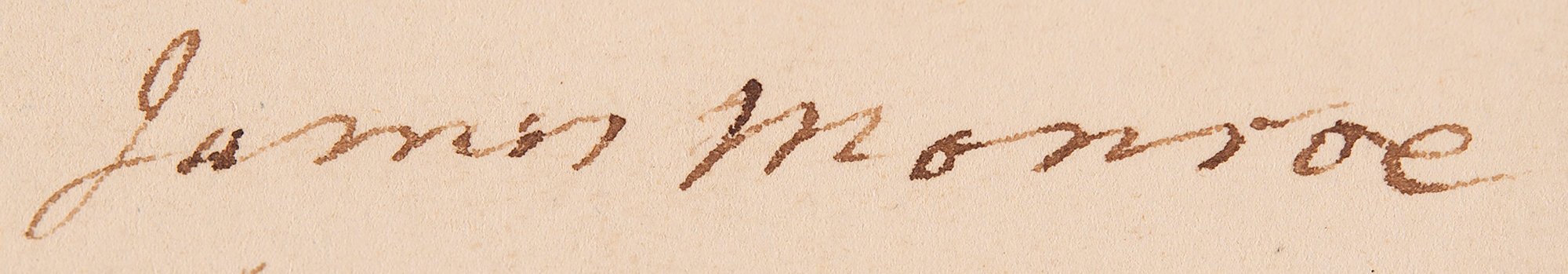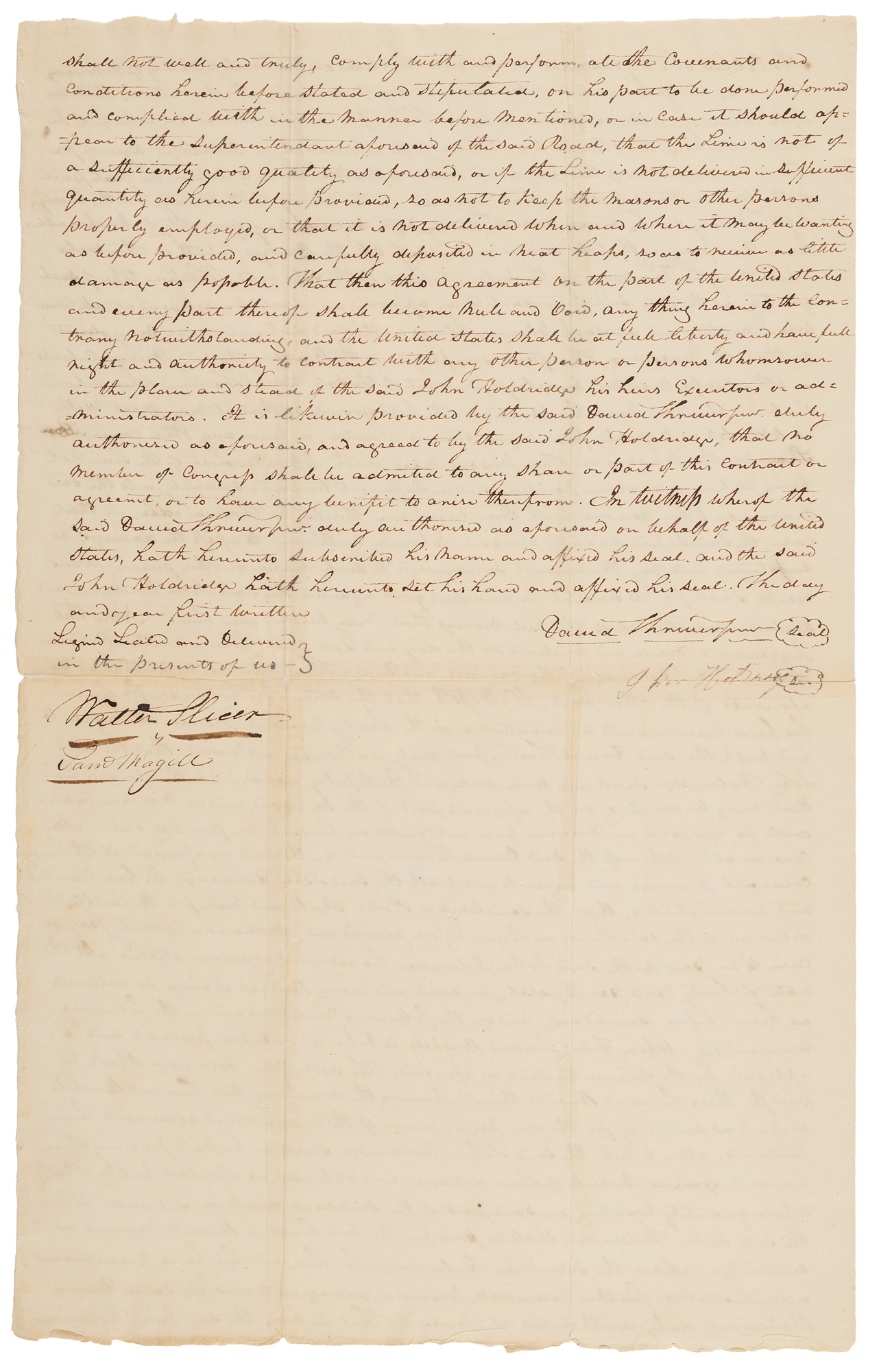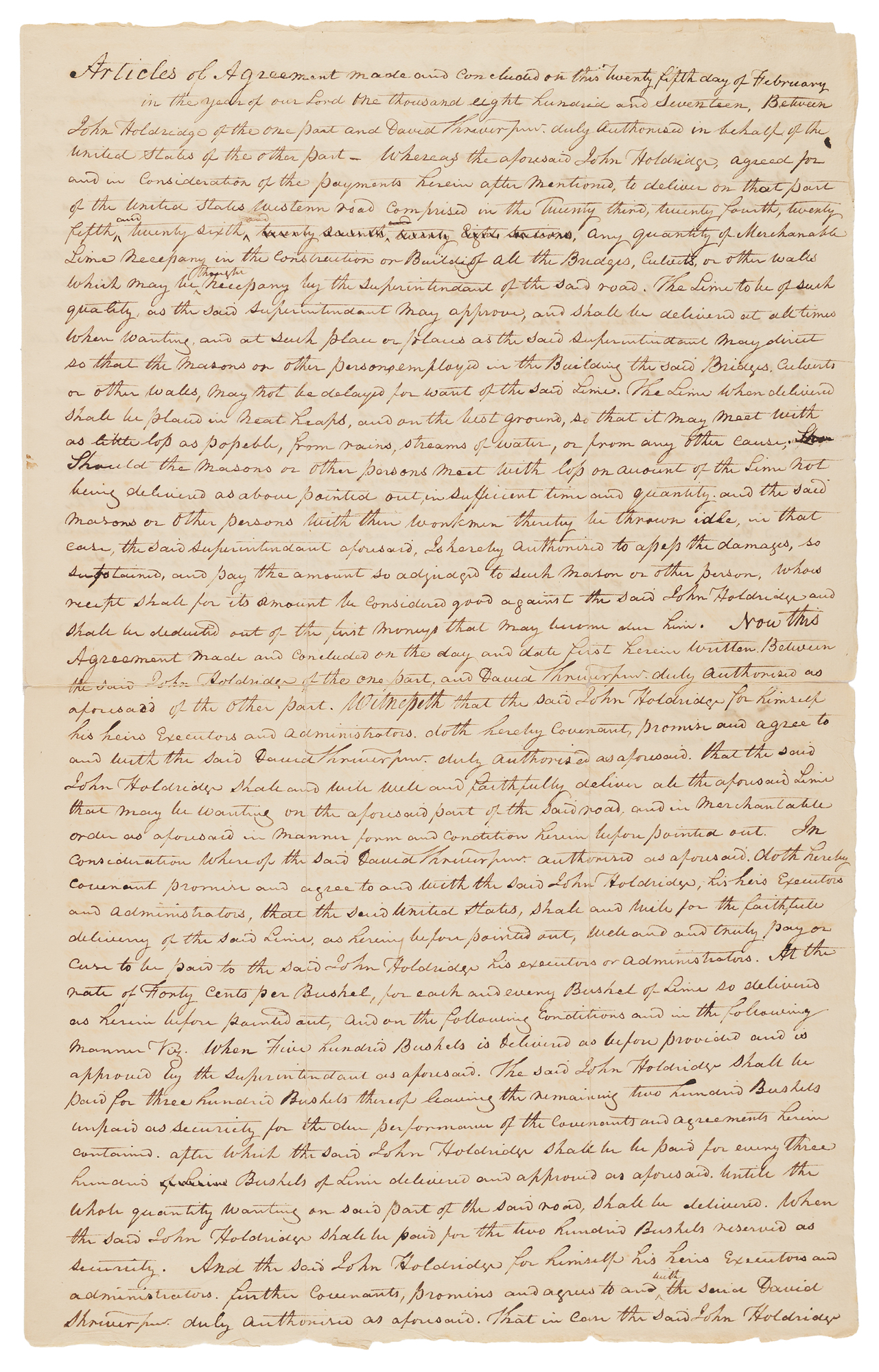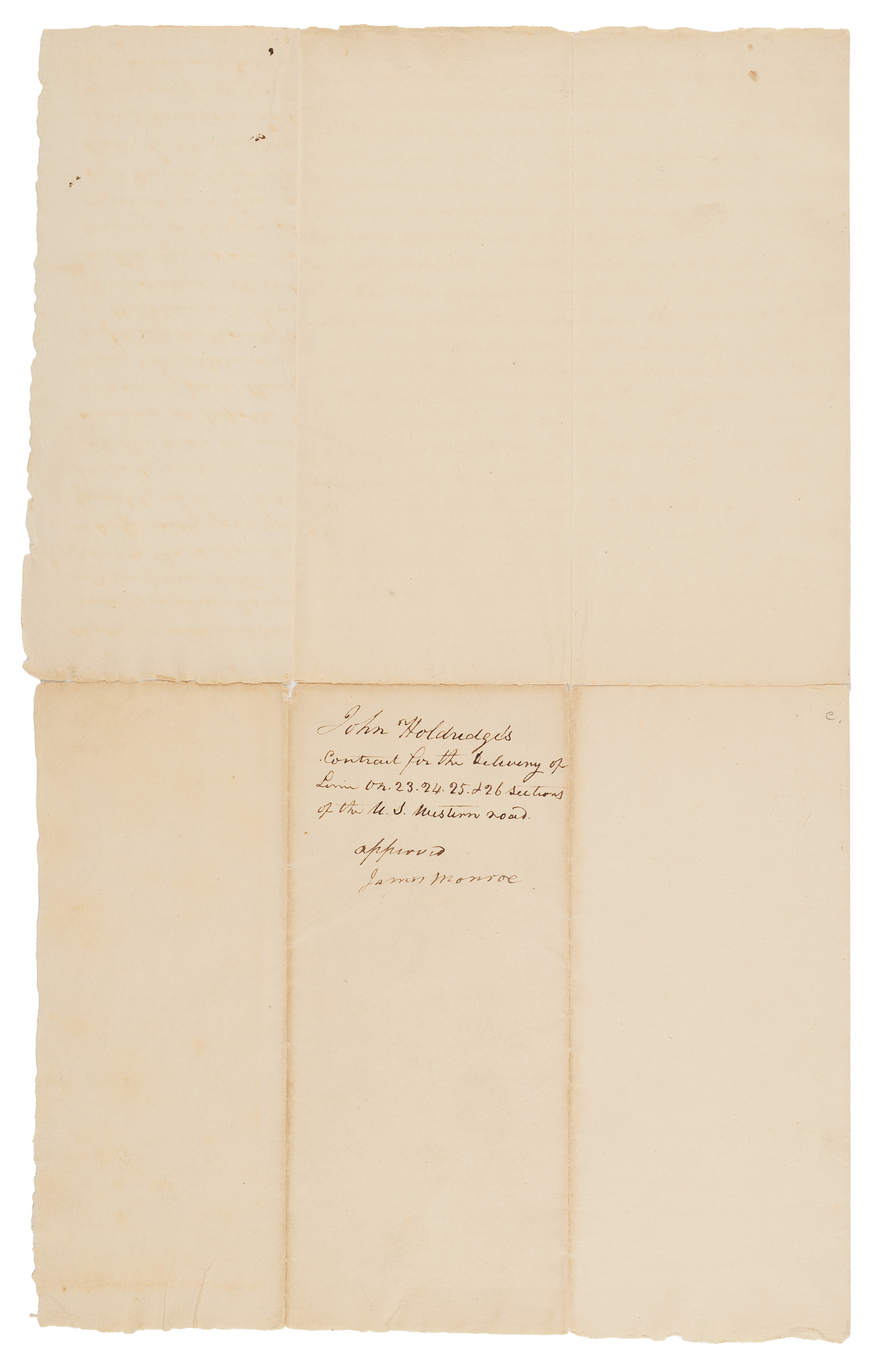 Endorsement signature as Secretary of State and President-Elect, “Approved, James Monroe,” penned on the reverse of a manuscript document related to the continued construction of America’s first road into the West, the Cumberland Road. The document, one page, both sides, 11.25 x 18, dated February 25, 1817, served as the original contract for the purchase of lime used to produce mortar for the road’s masonry. It reads, in part: “Between John Holdridge of the one part and David Shriver, Jr., duly authorized in behalf of the United States of the other part…The said John Holdridge agreed for and in consideration of the payments hereinafter mentioned to deliver on that part of the United States Western Road comprised in the 23rd, 24th, 25th, and 26th sections, any quantity of merchantable lime necessary in the construction or building of bridges, culverts, or other works which may be thought necessary by the Superintendent.” The U.S. agreed to pay Holdridge forty cents per bushel of lime, so long as it was of sufficient quality. The document is signed by both Shriver and Holdridge, and signing as witnesses are Walter Slicer, a partner in the firm building the Youghiogheny Bridge (thus perhaps indicating that the lime was to be used for the bridge), and Samuel Magill, who established the first newspaper in Cumberland and was later its mayor. Signed on the reverse with his approval signature by James Monroe, still serving in his capacity as Secretary of State. In very good to fine condition, with nearly complete separation along the hinge, and to the fragile folds of the second page.