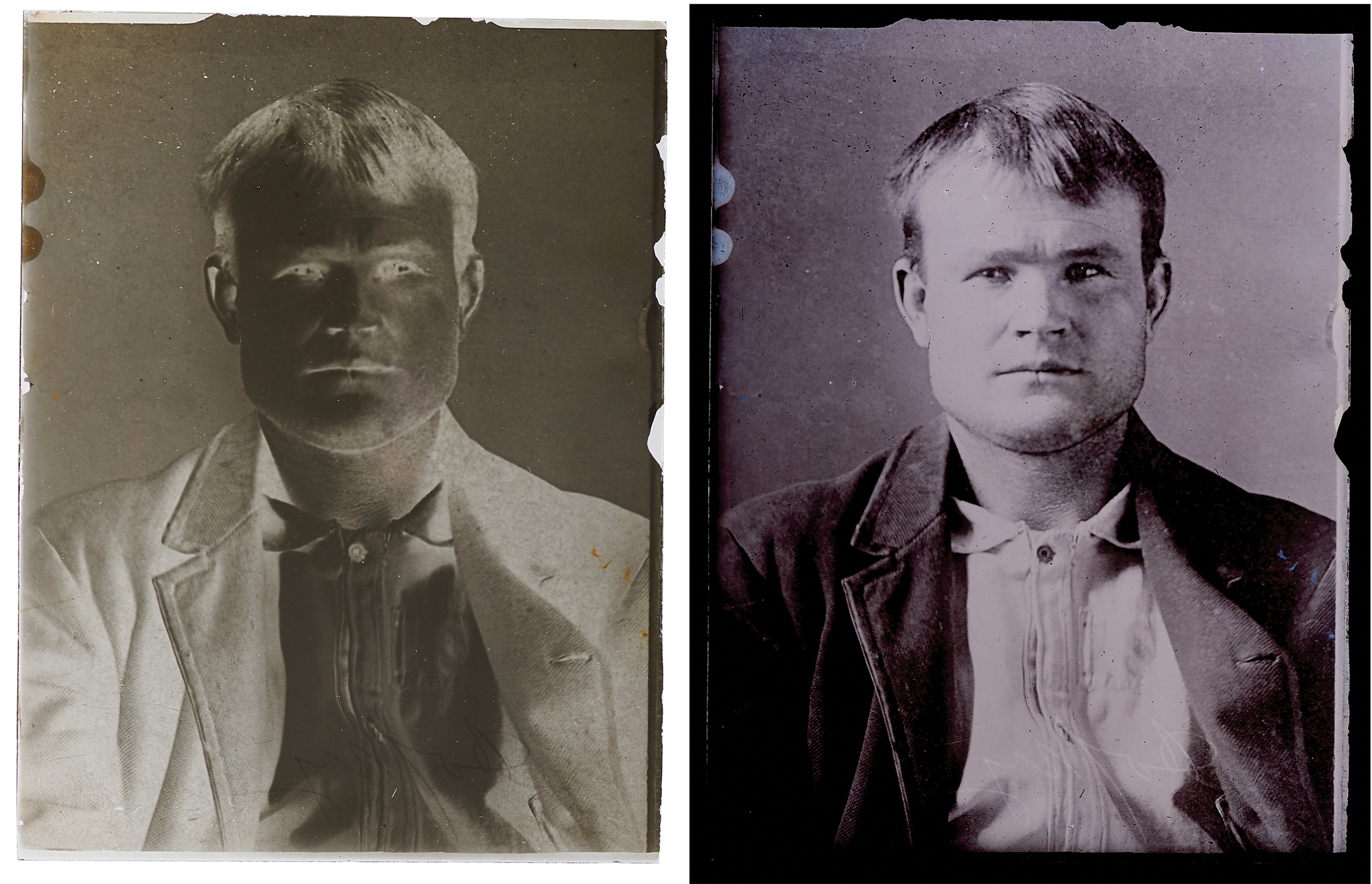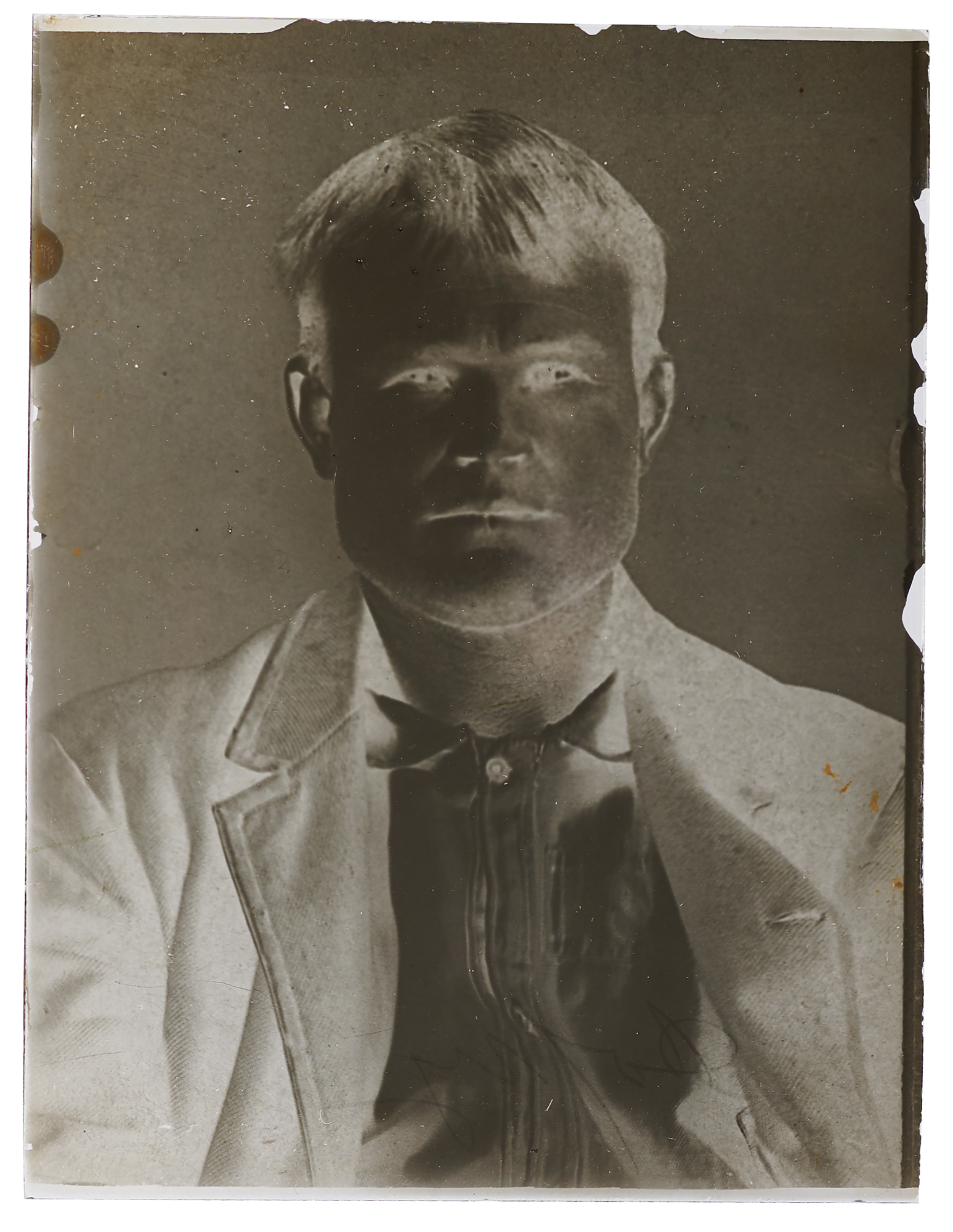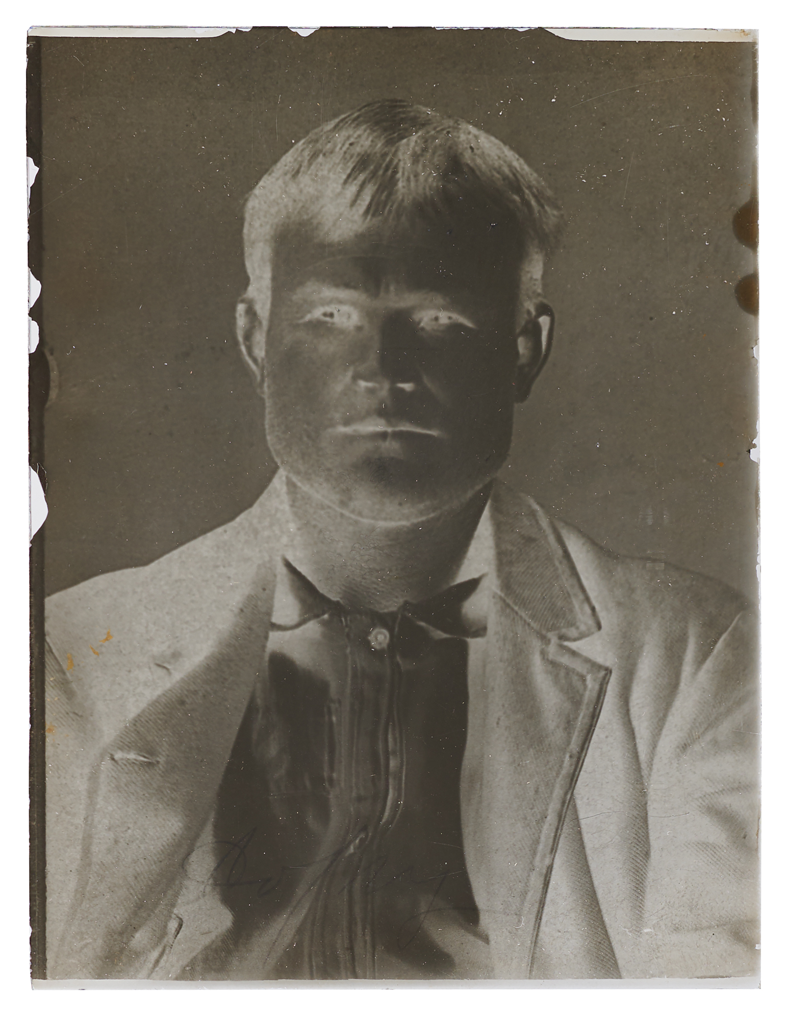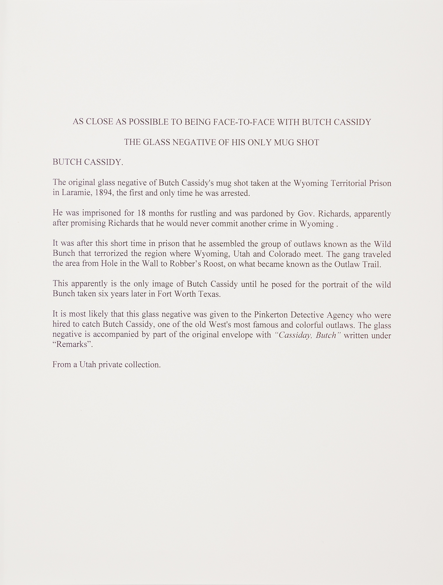 Research suggests that this is one of two known images taken of Butch Cassidy before he posed for the Wild Bunch portrait taken six years later in Fort Worth, Texas; the other documented photo is an early studio portrait of Parker as a young man in a full-length pose, exhibited as part of the J. Willard Marriott Digital Library at the University of Utah. This glass negative was most likely provided to the Pinkerton Detective Agency, which had been hired to apprehend Cassidy, one of the Old West’s most famous and colorful outlaws.