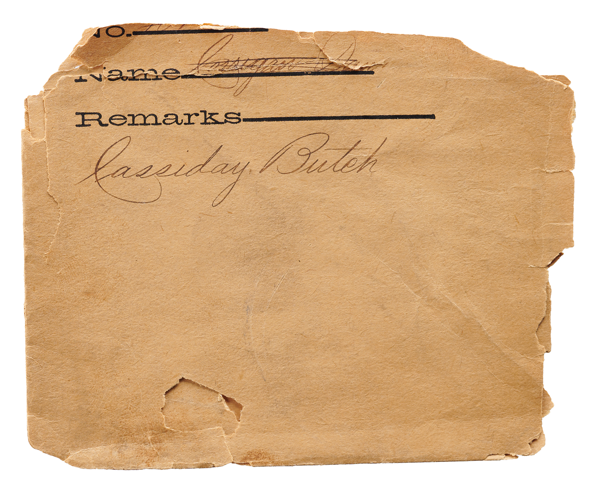 Original glass negative of Butch Cassidy’s mug shot taken at the Wyoming Territorial Prison in Laramie in 1894, the first and only time he was arrested. The negative, 3.25˝ x 4.25˝, depicts Cassidy relatively clean-shaven, wearing a dark coat over a light-colored button-up shirt, his hair slightly flattened, likely from wearing a hat. Includes a portion of the original envelope, with the “Remarks” field annotated in ink, “Cassiday, Butch.” In fine condition.