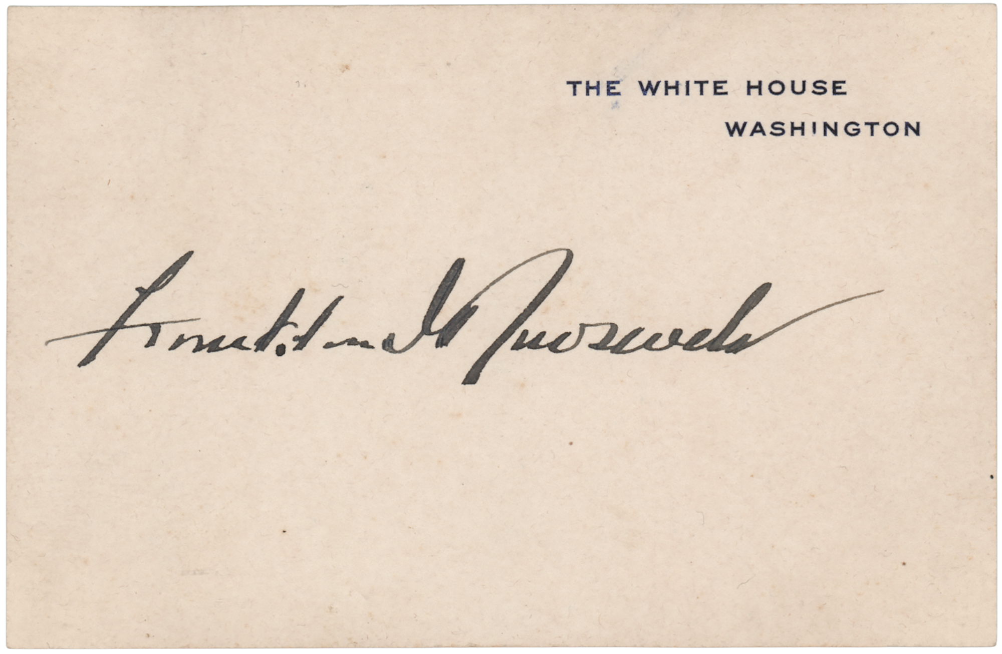 Choice official White House card, 4.25 x 2.75, boldly signed in fountain pen by Franklin D. Roosevelt. In very fine condition.