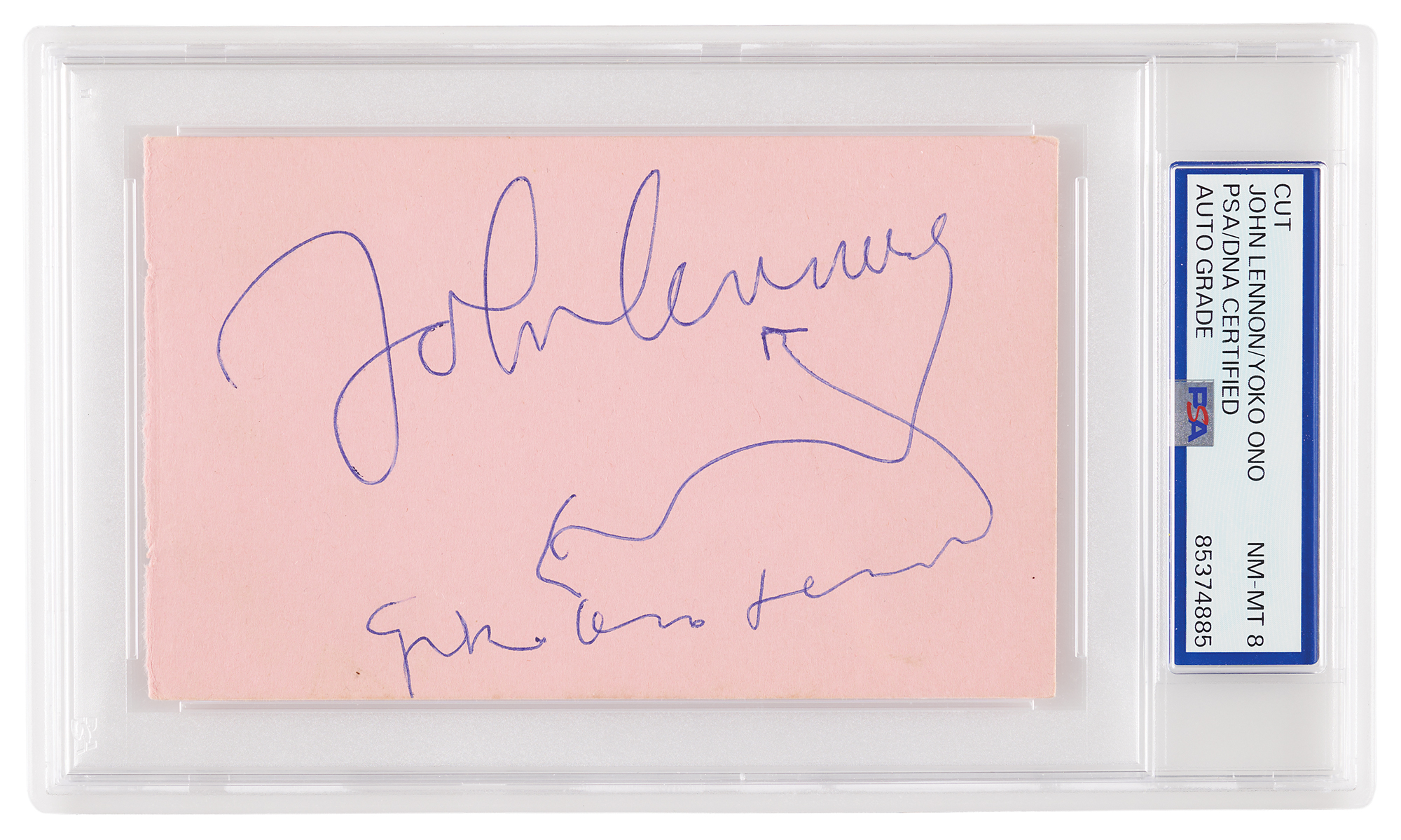 Ballpoint signatures, "John Lennon" and "Yoko Ono,” on a pink 4.75 x 3 album page; both Lennon and Ono end their signatures by drawing arrows to the other person’s name. In very fine condition. Encapsulated and graded by PSA/DNA as “NM - MT 8.”